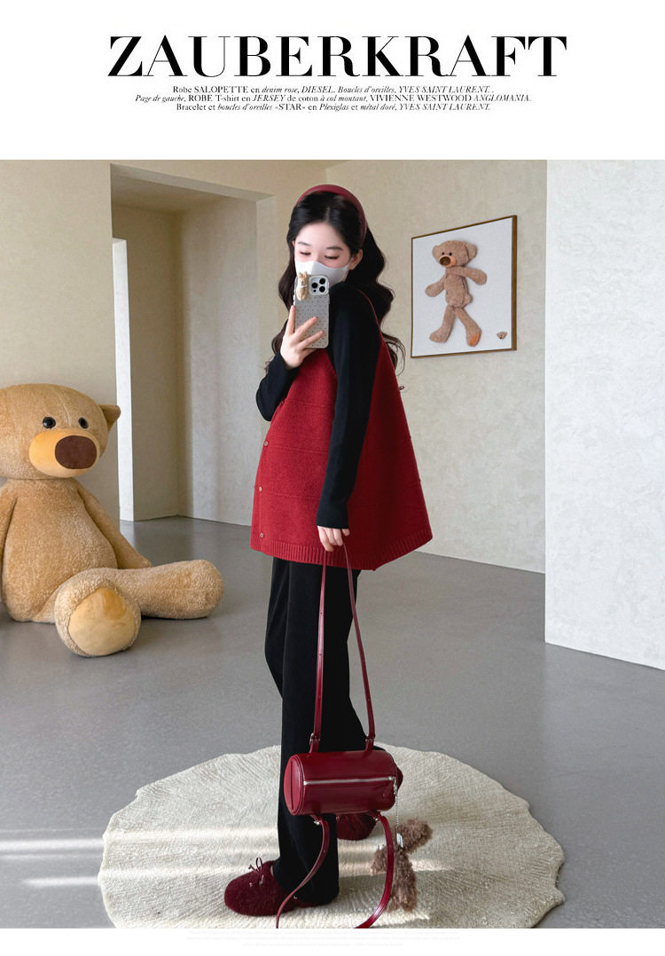 | Color | Chestnut coffee bottoming shirt,Black base layer top,Apricot vest {reversible},Red vest {reversible},Gray vest {reversible},Brown pants,Black pants |