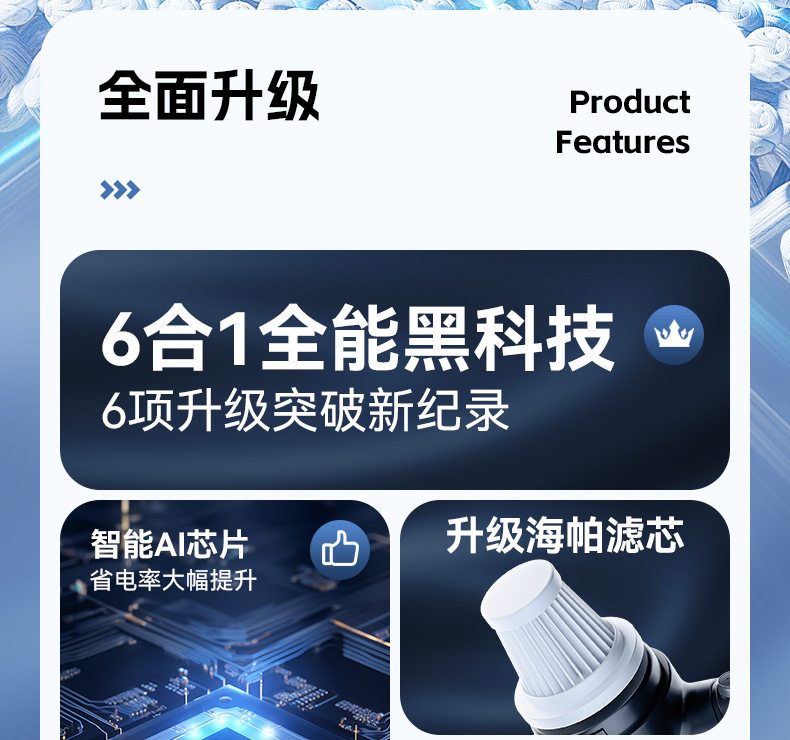 | Color classification | Black standard model [390000r suction power],Black upgraded model [798000r suction + suction/blow/charge/three-in-one] + filter element*1,Black luxury model [1199000r suction power* suction/blow/charge/three-in-one* advanced fast charging] + filter element*2 + floor brush,Black collection model [1399000r strong suction* suction/blow/charge/three-in-one* advanced fast charging] + filter element*3 + floor brush,Black flagship model [1699000r strong suction* suction/blow/pump/charge/four-in-one* super fast charge] + filter element*2 + floor brush,Black supreme flagship model [1999000r strong suction* suction/blow/pump/charge/four-in-one* super fast charge] + filter element*3 + floor brush,Black suction-free package * explosive suction model [25kpa explosive suction * advanced german precision brushless motor + suction/blow/pump/charge/four-in-one],Black suction-free package *exclusive top model [32kpa explosive suction *top german precision brushless motor + suction/blowing/pumping/charging/four-in-one] |