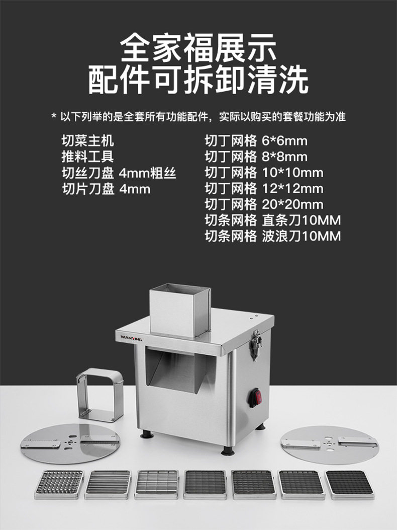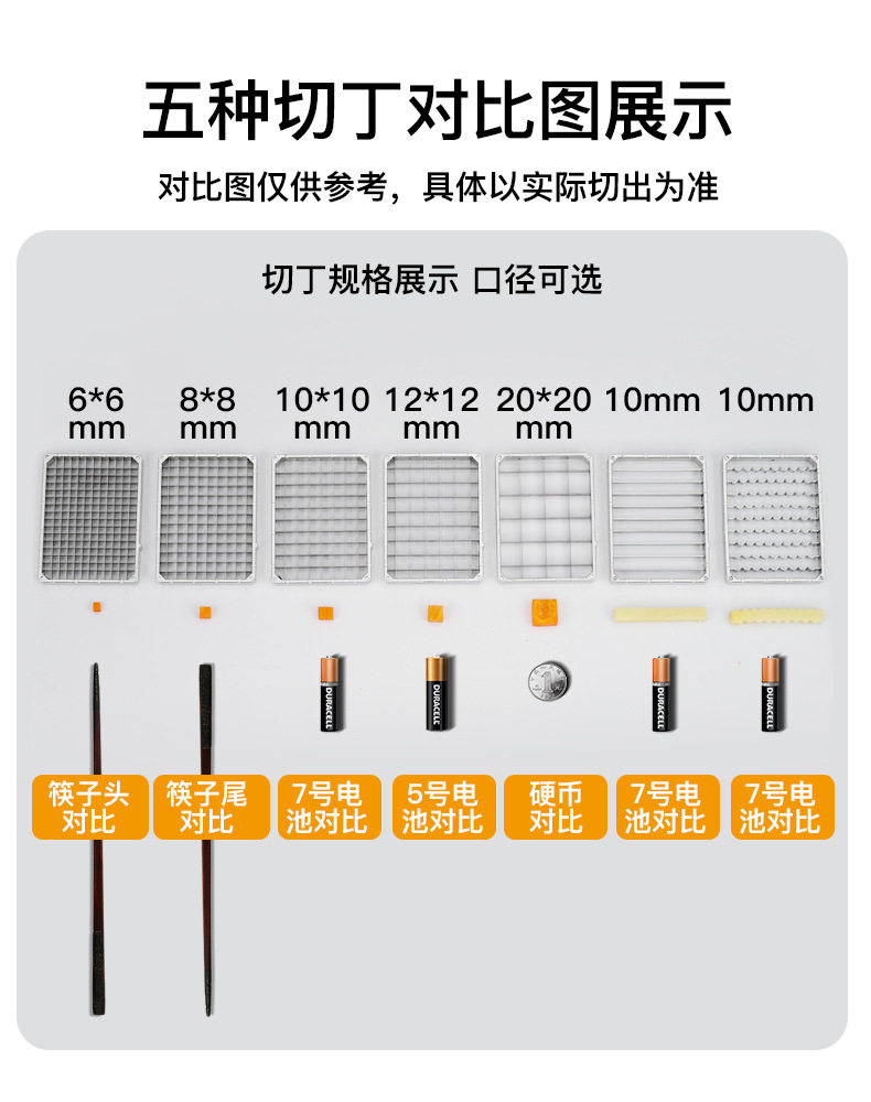 | Color | Upgraded vegetable cutter with 10x10 dicing knife,Upgraded vegetable cutter with dicing + slicing + shredding,Upgraded vegetable cutter comes with 5 grids dicing knives,Upgraded vegetable cutter comes with 5 dicing + slicing + shredding,Stainless steel vegetable cutter complete set of functions including 5 knife nets + 2 straight knives + 2 wolf tooth knives,Complete stainless steel vegetable cutter set with 5-blade mesh, straight blade, and serrated blade |