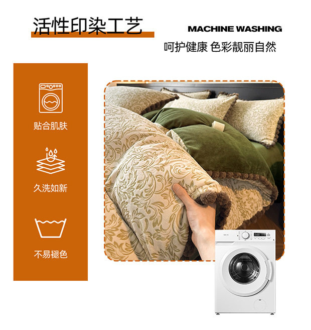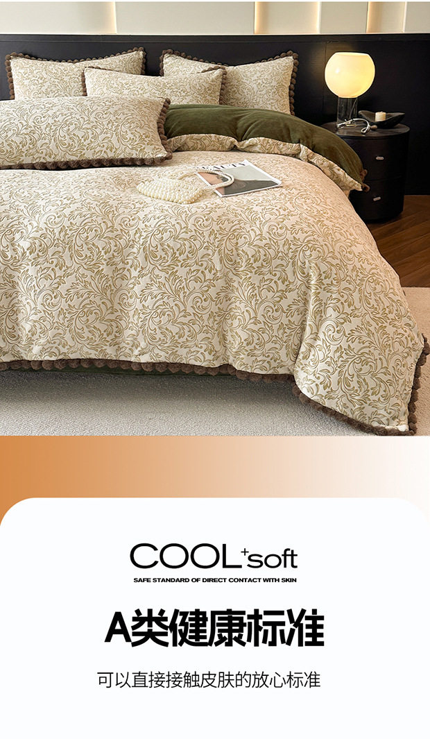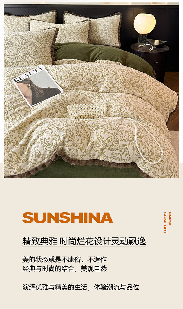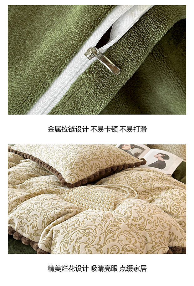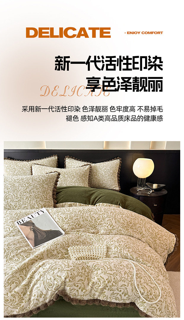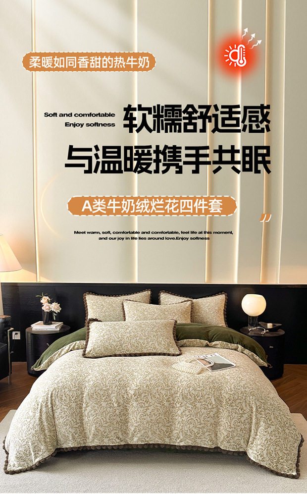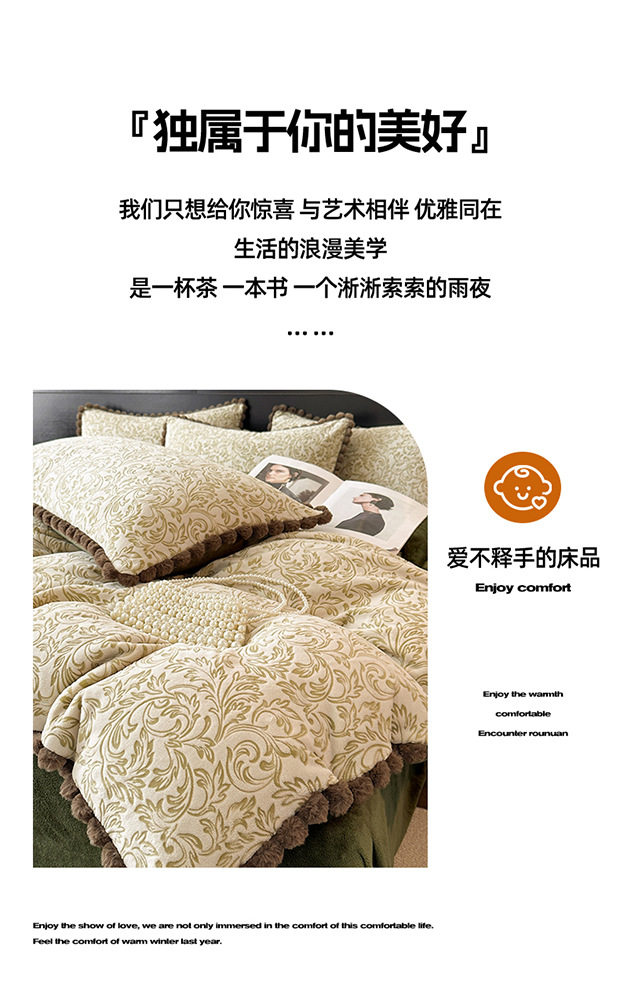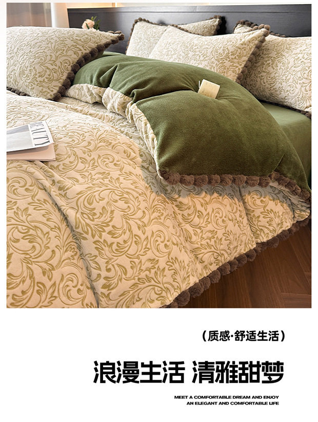Class a Rabbit Fur Ball Milk Velvet Thickened Four-Piece Bedding Set for Winter, Carved Coral Velvet Bed Sheet and Duvet Cover Three-Piece Set