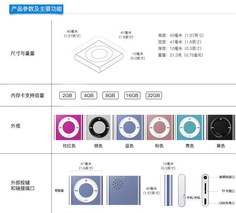 | Memory capacity | 16g can store 4222 songs + four-piece listening set,32g can store 8333 songs + four-piece listening set,64g can store 13,351 songs + four-piece listening set,128g can store 22,900 songs + four-piece listening set |