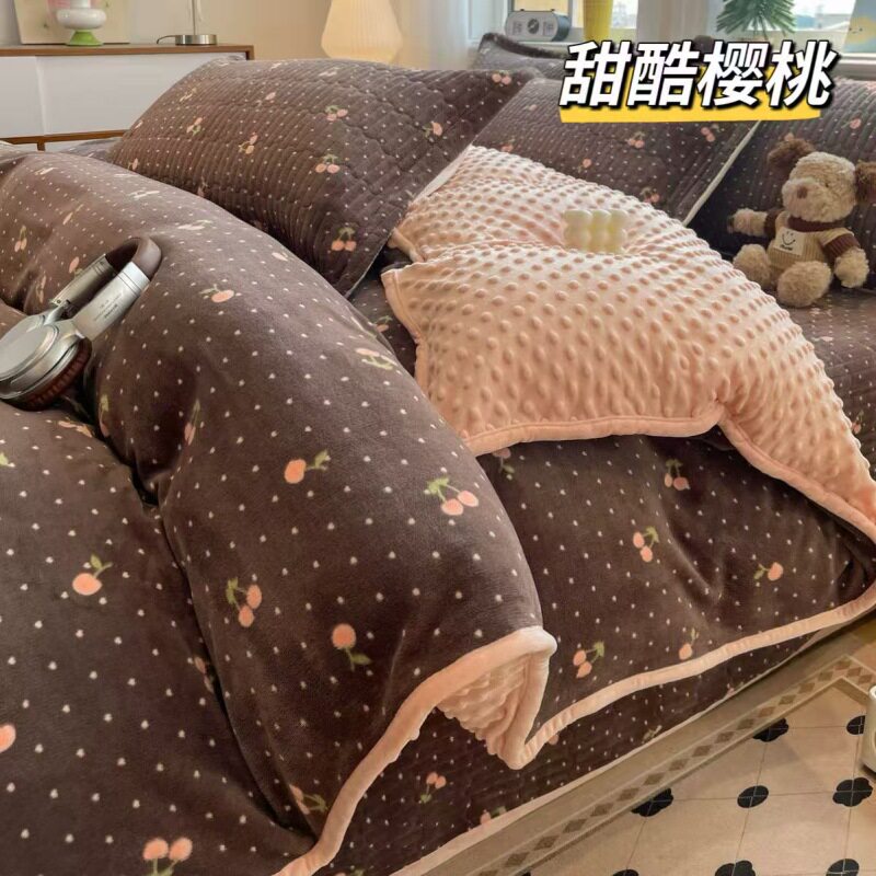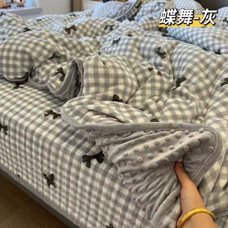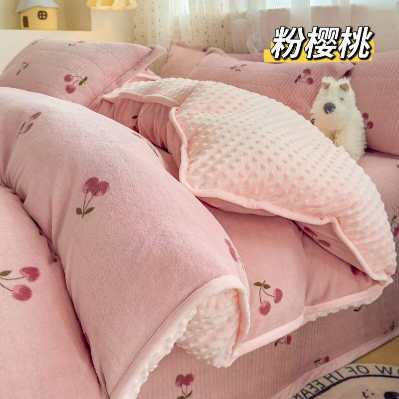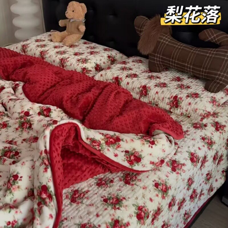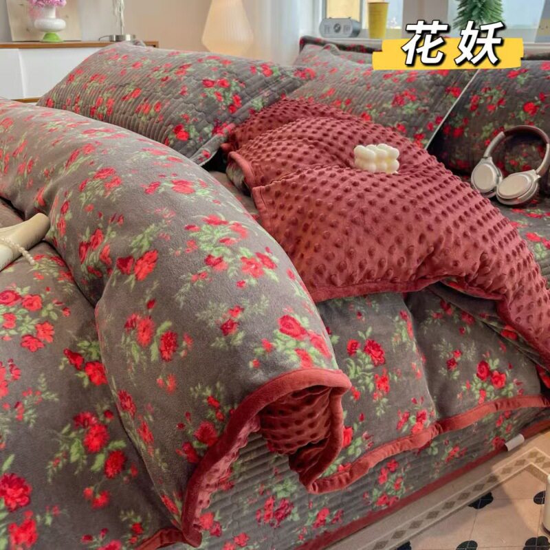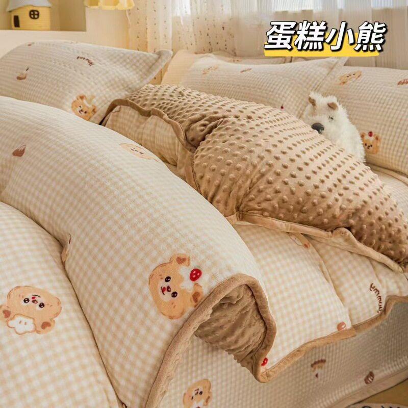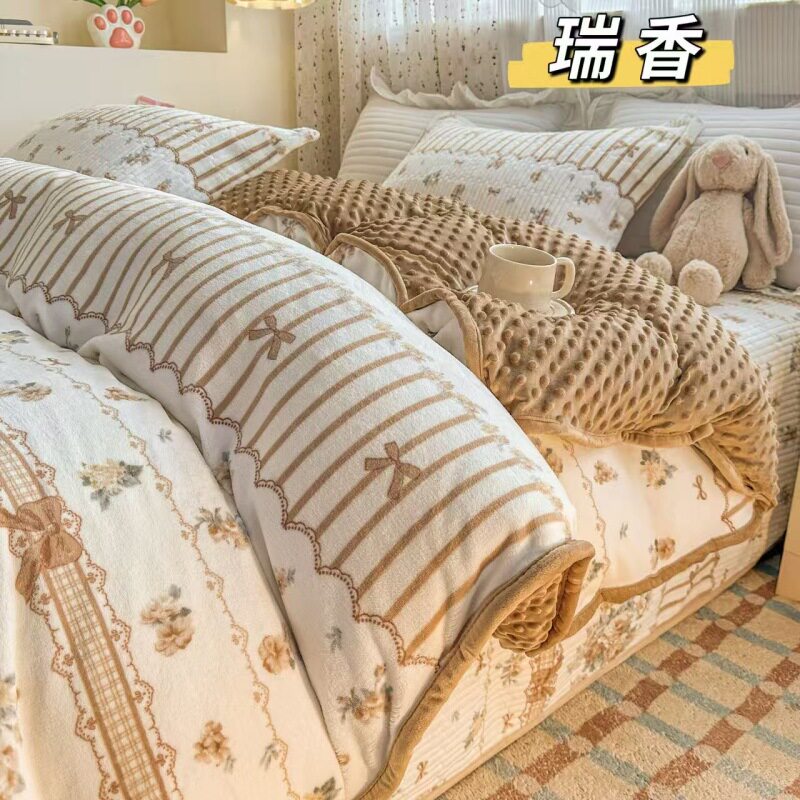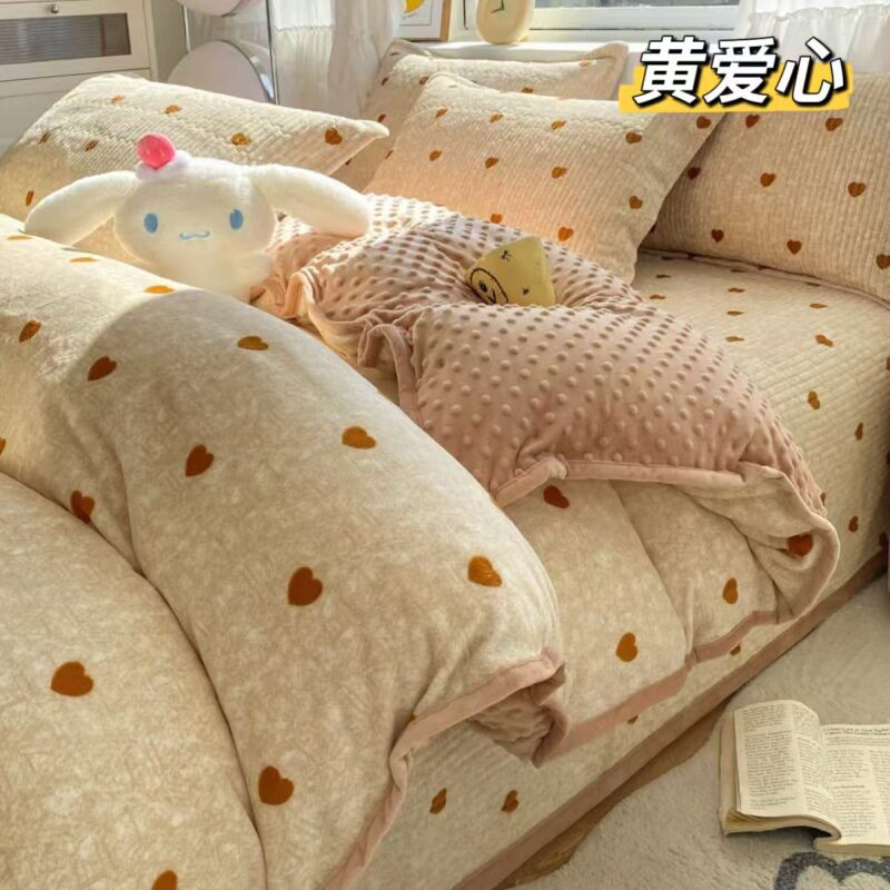 Milk Velvet Bed Cover Four-Piece Set, Bean Velvet Printed Quilt Cover, Thickeneded Quilted Bed Sheets, Kang Cover, Blanket and Velvet Bed Cover