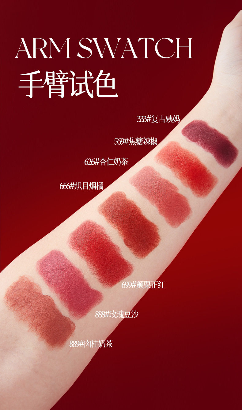 | Color | 889 # Cinnamon milk tea,333 # Retro aunt,699 # Thriller red,666 # Blazing smoke orange,569 # Caramel chili,626 # Almond milk tea,888 # Rose bean paste |