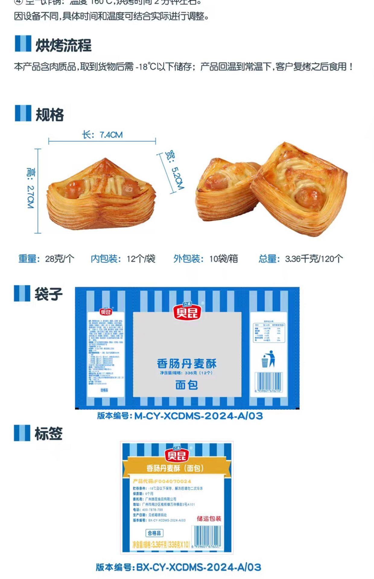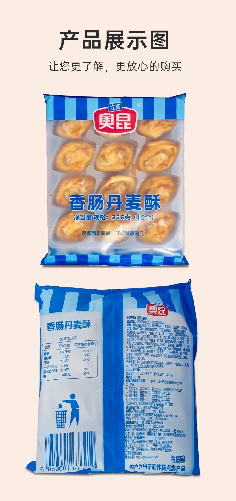 | Packaging specifications | Sausage danish pastry 336g*1 pack,Sausage danish pastry 336g*2 pack,Sausage danish pastry 336g*3 pack,Sausage danish pastry 336g*10 packs (full box),Aokun milk-flavored tablets 500g*1 pack,Okun french milk-flavored slices 500g*2 pack |