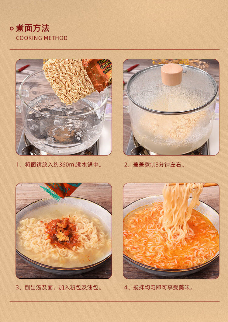 | Packaging specifications | Hot and sour shrimp noodle soup,Thai spicy seafood noodles,Thai green curry noodles,Hot and sour shrimp noodle soup |