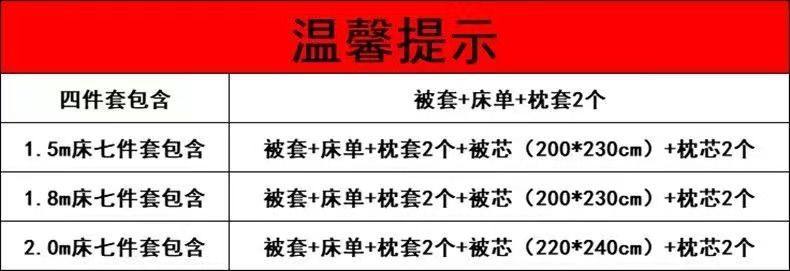 | Size specifications | 1.5 bed four-piece set [quilt cover 200*230]┅Wholesale price,1.8 bed four-piece set [quilt cover 200*230]┅Wholesale price,2.0 bed four-piece set [quilt cover 220*240]┅Wholesale price,1.5 fitted sheets, four pieces [quilt cover 200*230]┅Wholesale price,1.8 fitted sheets, four pieces [quilt cover 200*230]┅Wholesale price,1.5m bed seven-piece set: [with 3kg quilt + 2 pillow cores]┅Wholesale price,1.8m bed seven-piece set: [with 3kg quilt + 2 pillow cores]┅Wholesale price,2.0 seven-piece bed set: [with 3kg quilt + 2 pillow cores]┅Wholesale price,1.5 fitted sheet seven-piece set: [ 3kg quilt + pillow core 2]┅Wholesale price,1.8 fitted sheet seven-piece set: [ 3kg quilt + pillow core 2]┅Wholesale price,1.5m bed seven-piece set: [with 4kg quilt + 2 pillow cores]┅Wholesale price,1.8m bed seven-piece set: [with 4kg quilt + 2 pillow cores]┅Wholesale price,2.0 seven-piece bed set: [with 4kg quilt + 2 pillow cores]┅Wholesale price,1.5 fitted sheet seven-piece set: [ 4kg quilt + pillow core 2]┅Wholesale price,1.8 fitted sheet seven-piece set: [ 4kg quilt + pillow core 2]┅Wholesale price,1.5m bed seven-piece set: [with 5kg quilt + 2 pillow cores]┅Wholesale price,1.8m bed seven-piece set: [with 5kg quilt + 2 pillow cores]┅Wholesale price,1.5 bed eight-piece set: [2 quilts + 3kg pillows + mattress] ┅ Wholesale price,2.0 seven-piece bed set: [with 5kg quilt + 2 pillow cores]┅Wholesale price,1.8 eight-piece bed set: [ 3kg quilt + 2 pillow cores + mattress]┅Wholesale price |