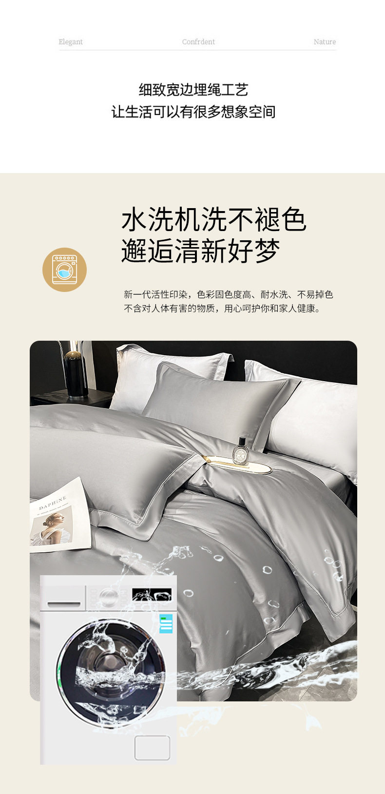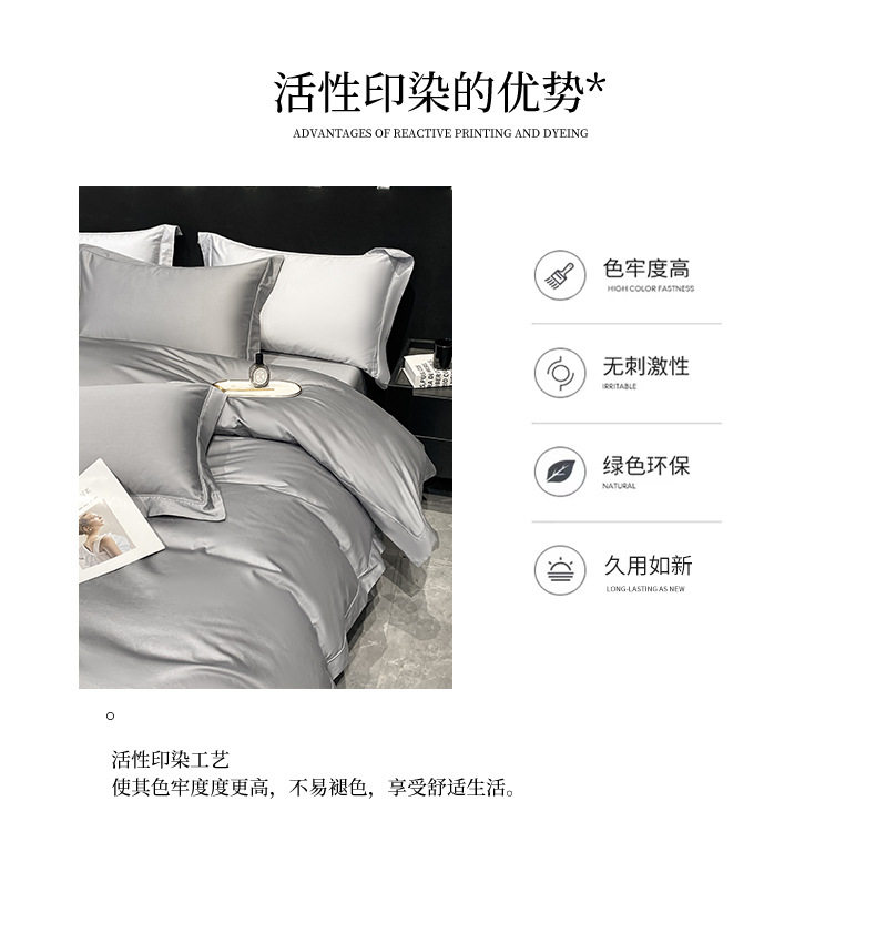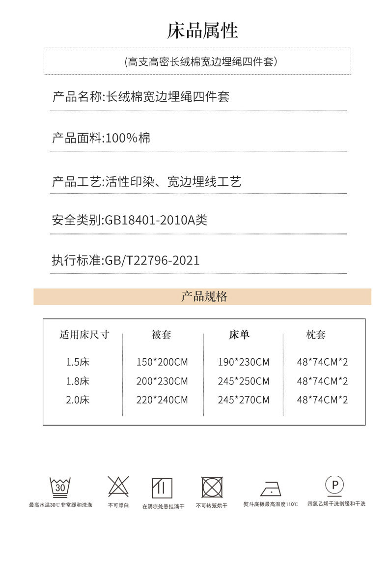 | Size specifications | 1.2 three-piece bed set, quilt cover 150*200cm,1.5 bed four-piece set, quilt cover 200*230cm,1.8 bed four-piece set, quilt cover 200*230cm,2.0 bed four-piece set, quilt cover 220*240cm |