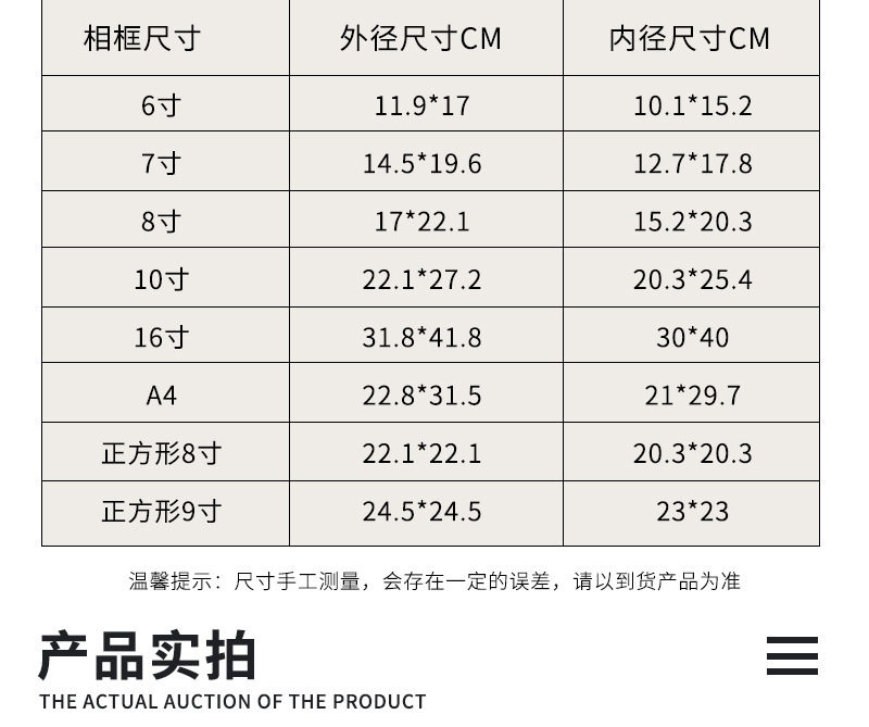 | Frame size | Inner diameter 6inch (10.1*15.2cm),Inner diameter 7inch (12.7*17.8cm),Inner diameter 8inch (15.2*20.3cm),Inner diameter 10inch (20.3*25.4cm),Inner diameter 16inch (30*40cm),Inner diameter a4 (21*29.7cm) |