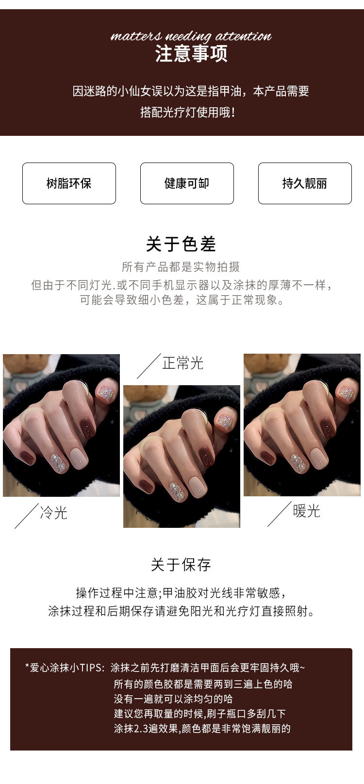 | Color | Three bottles of your choice, leave a message,Two bottles of your choice, leave a message,Pine nut cocoa + cocoa milk tea + memory fragments,Autumn amber + autumn fragments,Dirty milk tea + galaxy dot 02,Rose sequins + rose watercolor,Brown tea glass + silver gravel + yunfeng white,Brown obsidian gold cat eye + latte coffee,Glazed amber + caramel amber + golden light fragments,Caramel cocoa + milk coffee color + magical magic book,Cocoa bean paste + coconut milk jelly,Demon blue + jelly burnt yellow + soft mist caramel,Velvet latte + milk camel huhu + starry night gold,Princess wine red + golden light,Camellia cat eye + champagne mixed diamond,River qing xing luo + peach blossom smile + naughty peach,Letter from autumn + honey drops + ulo cocco,Odorless + universal crystal cat eye,Cherry red + colorful sequins,Rum red + fireworks star,Deciduous champagne + dusk + milk tea brown coffee,Wine-brewed roses + dots of stars + sweet-speak plums,Icy black brown + raw coconut milk white + mirror silver magic mirror powder,Smoke gray purple + high gloss champagne + gray purple fine shimmer,Dazzling platinum + rose wine + dry rose,Half sugar ash + colorful crushed diamonds + cocoa custard,Guan hui dao yu + a few pages of memories + morning dew and seasonal rain,Peach maple leaf + fine spar cat eye,Gentle wishing + unseen moon mountain + cream,Temperament wine red + lotus root pink + cheese pudding,Jelly bean girl pink + jelly bean purple + jelly bean green,Caramel rose + sweet pomelo jelly + star glitter silver,Sweetheart jujube + her pear vortex,Icy warm brown + laser color strip + milk orange,Cream blue + cream green + bright star sea,Diamond grape purple + translucent lotus root purple + aurora cellophane,Heartbeat + heartbeat with you + unlimited poetry,Three-line calligraphy + light moon song + fairy tale elf,First meeting + meeting + peach blossom fairy,Hydrogel powder + golden crystal cat eye,Hawthorn ice extract + matcha with ice + beautiful dreamland,Maple sugar cake + cream white + oat milk coffee,Cold brown + champagne fine shimmer + transparent brown,Wine-made peach+yunmengze+yan ye garden,Beloved + before sunset + suddenly late in the world,Danish fairy tales + cardamom years + starry sky,Avocado green + pure white + transparent nude color,Dynamic diamond cat eye 07+heartbeat blush+watery skin,Milk blue + ice skin nude tea + peach blush,Luxurious white + romantic poetry collection,Jelly bean blue + jelly bean yellow + jelly bean green,Hydrating grape + taro puree galaxy,Oolong iced tea + pure black + pure white,Azure blue + bright fragments + pure white,Moon white + lover rose,Sakura elf + tipsy |