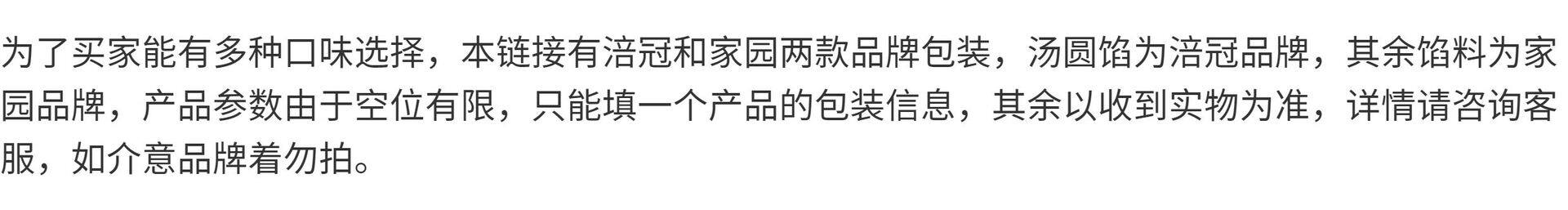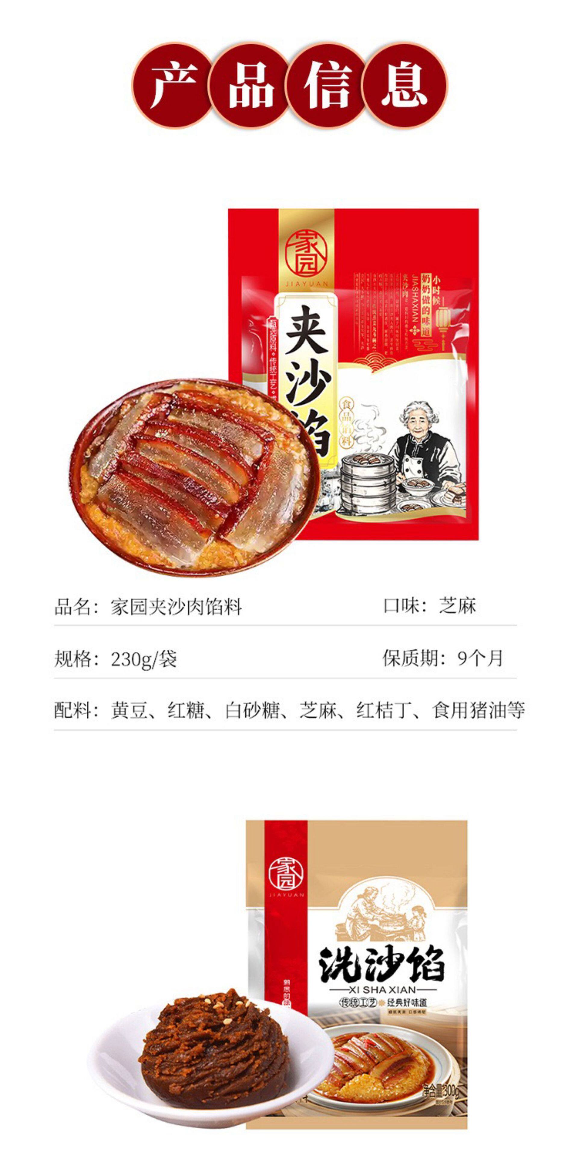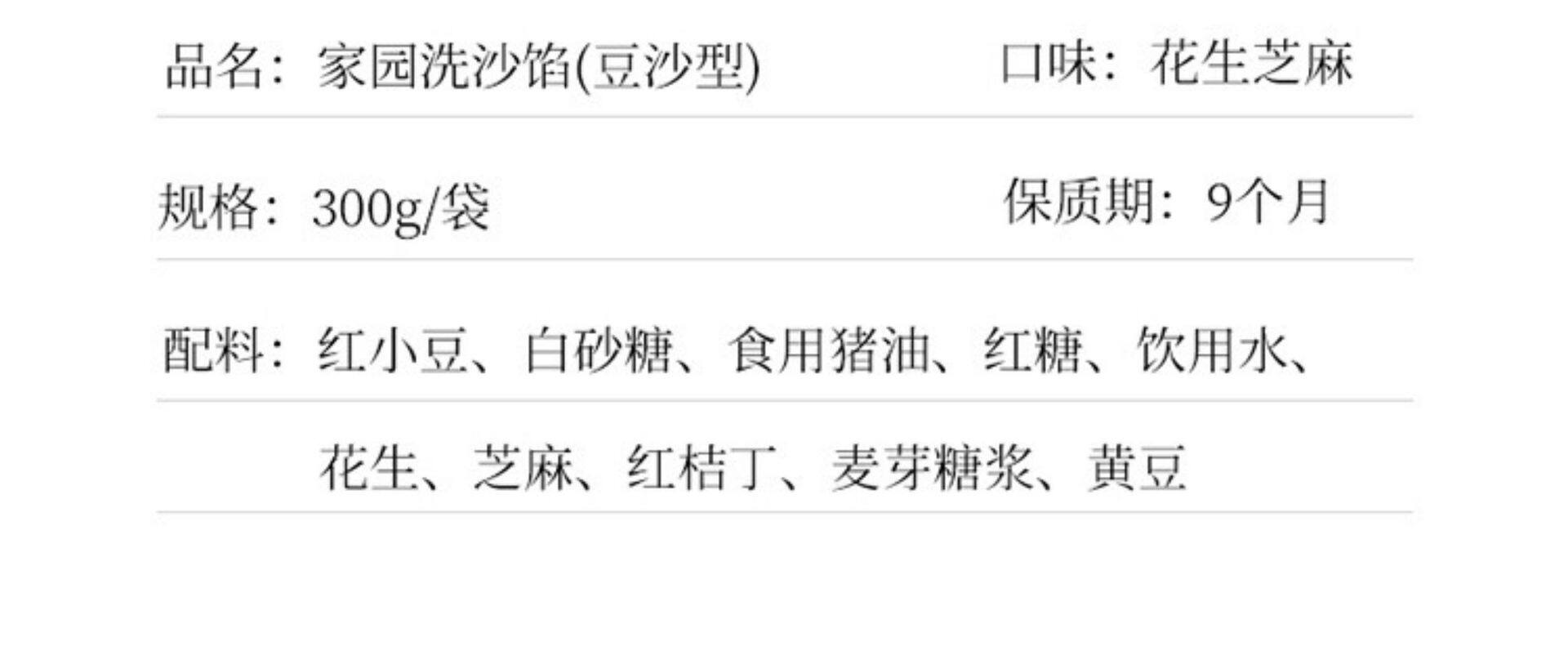 | Packaging specifications | Glutinous rice ball filling 400g,Glutinous rice ball filling 400g*2 bags,Glutinous rice ball fillings 400g*5 bags,Sand stuffing 230g [coarse type],Washed sand filling 300g [bean paste type],400g bean paste filling [can be used to make pastries],White lotus seed filling 450g [can be used as pastry],Black sesame filling 450g [can be used for pastries],Sugar-free oily red bean paste,Sucrose-free water-based red bean paste,Pineapple filling 450g |