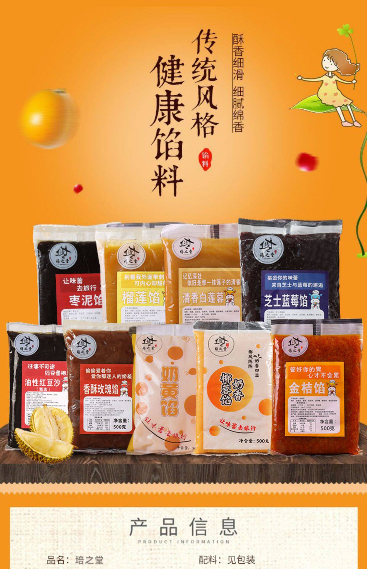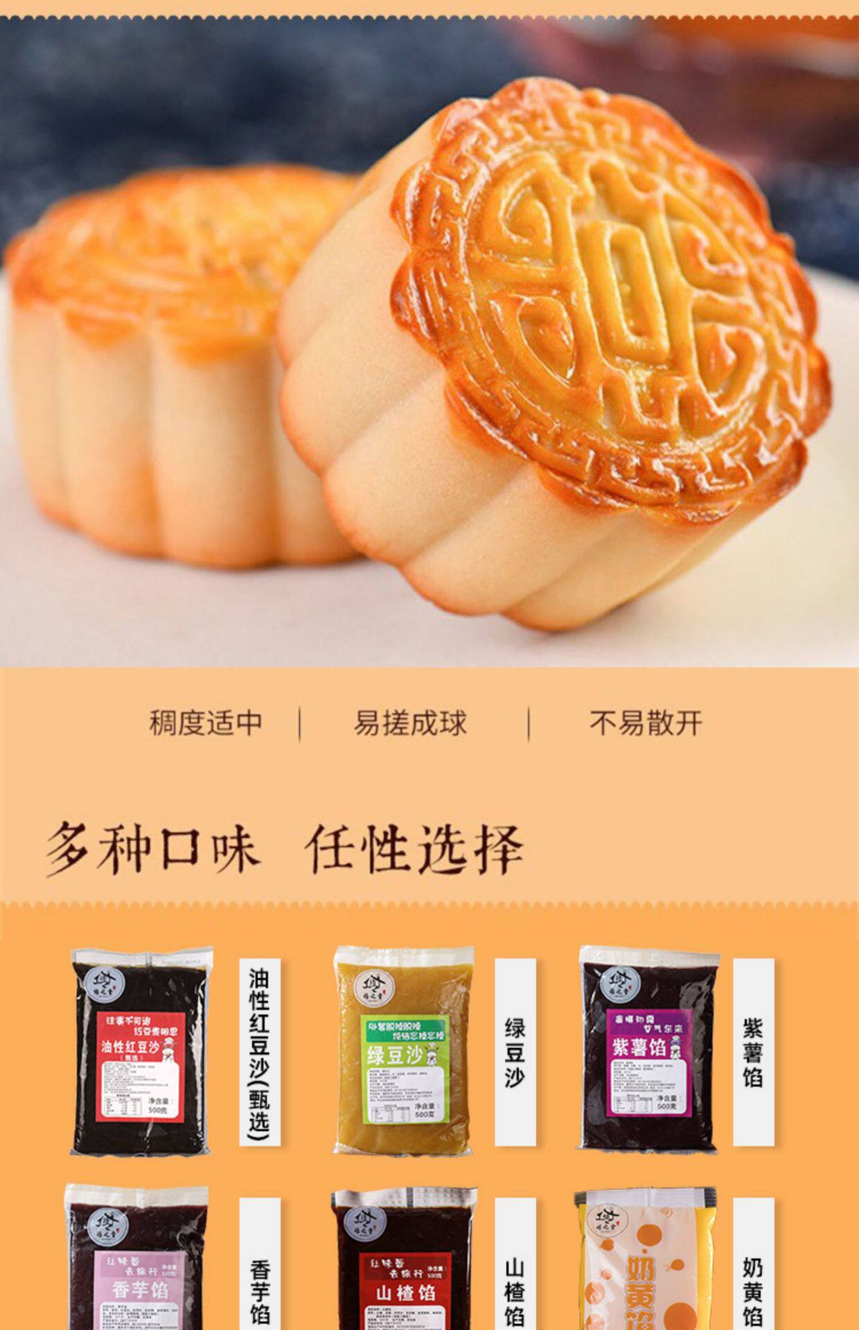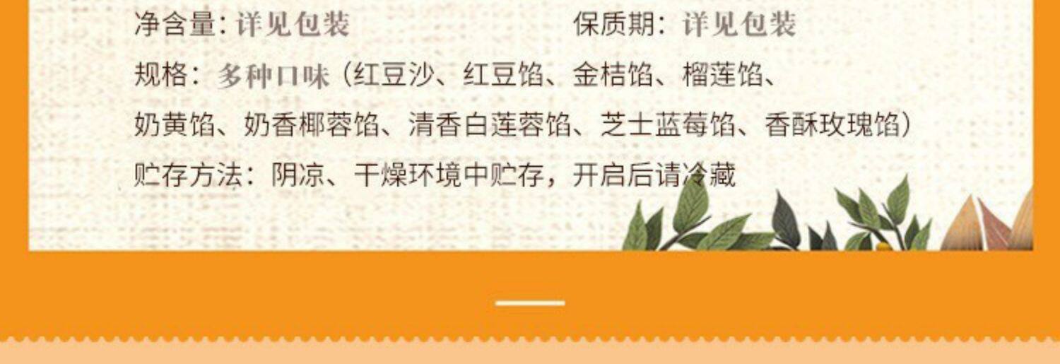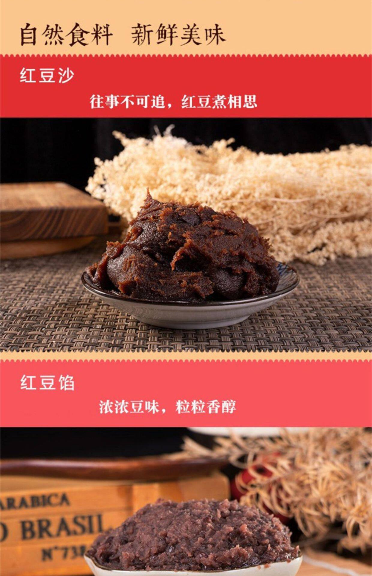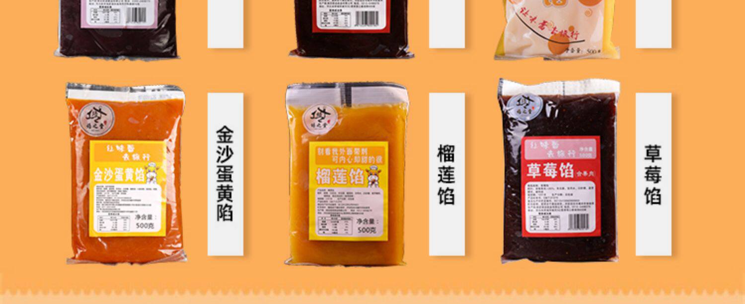 | Packaging specifications | 500g oily red bean paste (selected),Fragrant white lotus seed paste (500g),Date paste filling (500g),Date paste filling (with granules) 500g,Cheese blueberry filling (500g),Durian filling 500g,Pineapple filling 500g,Strawberry filling 500g,Cranberry filling 500g,Mulberry filling 500g,Milky coconut filling (500g),Hawthorn filling 500g,Suitable for black sesame filling (500g) mooncakes,Jinsha egg yolk filling 500g,Crispy salt and pepper filling 500g,Taro filling (500g),Crispy chestnut filling 500g,Crispy rose filling 500g,Chestnut filling (500g),Old five nut filling (500g),Egg yolk and meat floss filling 500g,Low sweet taro paste filling 500g,Jujube paste and walnut filling 500g |