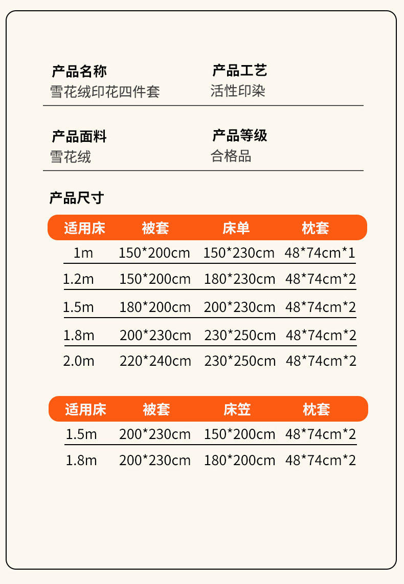 | Size specifications | 1.0m three-piece set [quilt cover 150*200cm bed sheet 150*230cm pillowcase 48*74cm*1],1.2m four-piece set [quilt cover 150*200cm bed sheet 180*230cm pillowcase 48*74cm*2],1.5m four-piece set [quilt cover 180*200cm sheets 200*230cm pillowcase 48*74cm*2],1.8m four-piece set [quilt cover 200*230cm sheets 230*250cm pillowcase 48*74cm*2],2.0m four-piece set [quilt cover 220*240cm bed sheet 230*250cm pillowcase 48*74cm*2],1.2m fitted sheet set of four [quilt cover 150*200cm, fitted sheet 120*200cm, pillowcase 48*74cm*2],1.5m fitted sheet set of four [quilt cover 200*230cm fitted sheet 150*200cm pillowcase 48*74cm*2],1.8m fitted sheet set of four [quilt cover 200*230cm fitted sheet 180*200cm pillowcase 48*74cm*2],150x200cm single quilt cover,180x200cm single quilt cover,200x230cm single quilt cover,220x240cm single quilt cover |