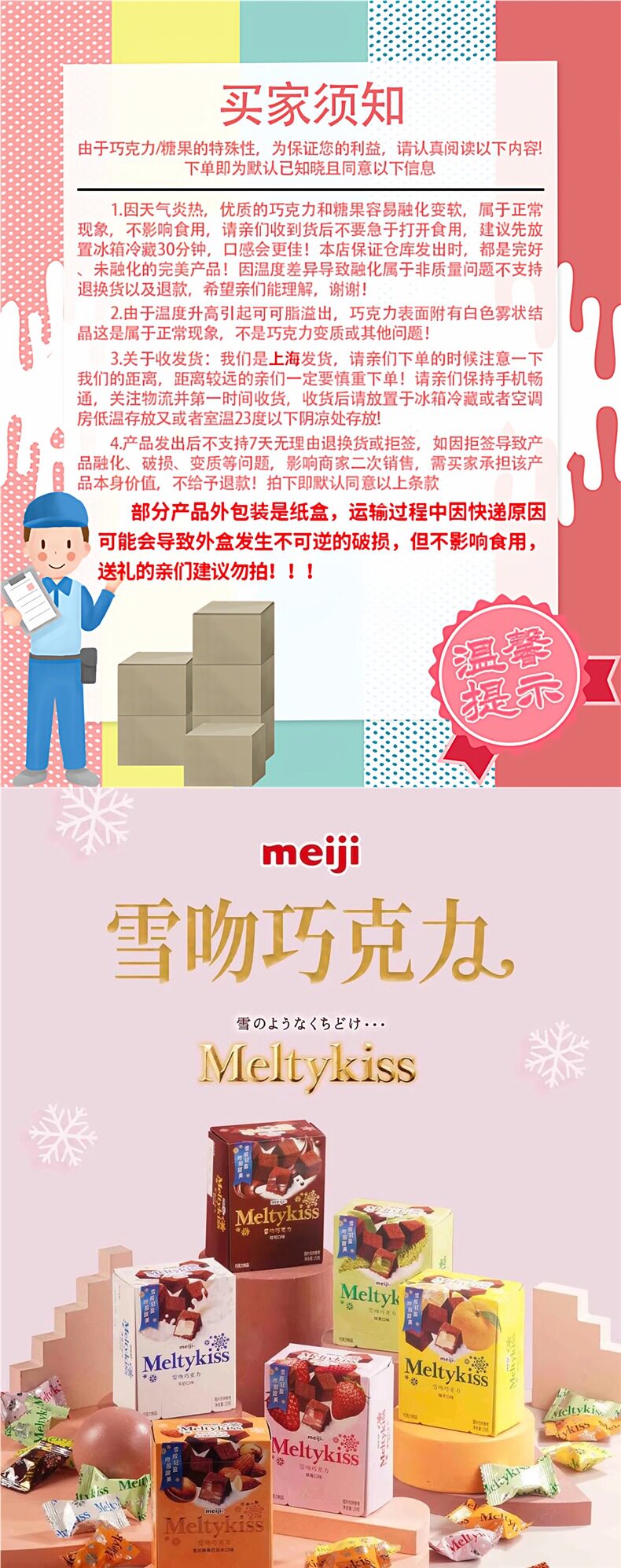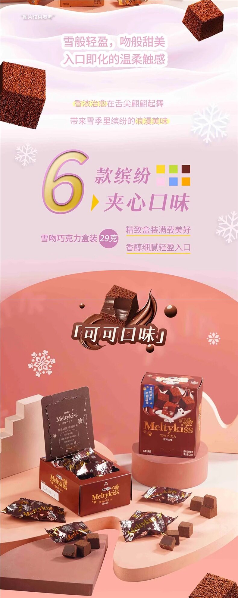 | Packaging specifications | Strawberry flavor 29g [1 box] (-),Cocoa flavor 29g [1 box] (-),Matcha flavor 29g [1 box] (-),Italian hazelnut almond flavor 29g [1 box] (-),Milk flavor 29g [1 box] (-),Grapefruit flavor 29g [1 box] (-),Cocoa flavor 55g [1 box] (-),Matcha flavor 55g [1 box] (-),Grapefruit flavor 55g [1 box] (-),Milk flavor 55g [1 box] (-),Strawberry flavor 55g [1 box] (-),Italian hazelnut almond flavor 55g [1 box] (-),Snow kiss magic book purple gift box 140g [1 box] (-),Snow kiss magic book white gift box 140g [1 box] (-),Pauchuan chocolate extra rich milk flavor 75g [1 box] (-),Pauchuan chocolate milk flavor 75g [1 box] (-),Row chocolate 50% cocoa 75g [1 box] (-),Row chocolate 60% cocoa 75g [1 box] (-),Pauchuan ultra-pure chocolate 70% cocoa 75g [1 box] (-),Almond sandwich chocolate 80g [1 box] (-),Macadamia nut sandwich chocolate 58g [1 box] (-),Nut-filled chocolate longjing flavor 58g [1 box] (-),Small bb beans 32g [1 box] (-),Big bb beans 102g [1 box] (-) |