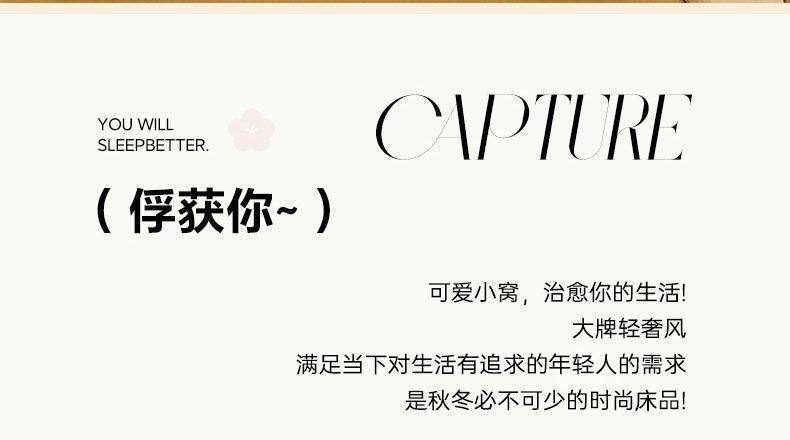 | Size specifications | 150x200cm single quilt cover,180x220cm single quilt cover,200x230cm single quilt cover,220x240cm single quilt cover,1.2m bed sheet three-piece set [quilt cover 1.5x2.0m],1.5m bed sheet four-piece set [quilt cover 2.0x2.3m],1.8m bed sheet four-piece set [quilt cover 2.0x2.3m],2m bed sheet four-piece set [quilt cover 2.2x2.4m],1.5m fitted sheet set of four [fitted sheet 1.5x2.0m],1.8m fitted sheet set of four [fitted sheet 1.8x2.0m],2.0m fitted sheet set of four [fitted sheet 2.0x2.2m],1.5m bed sheet four-piece set [quilt cover 1.8x2.2m],1.8m bed sheet four-piece set [quilt cover 1.8x2.2m],100*150 single quilt cover [random color] |