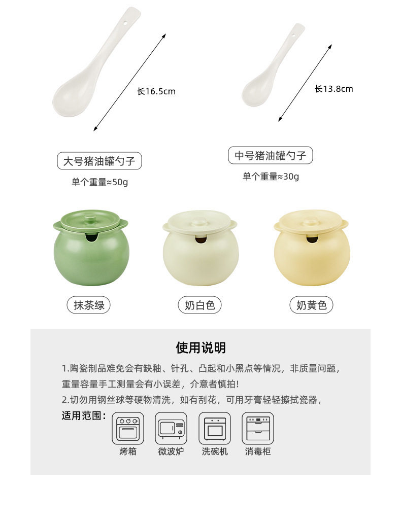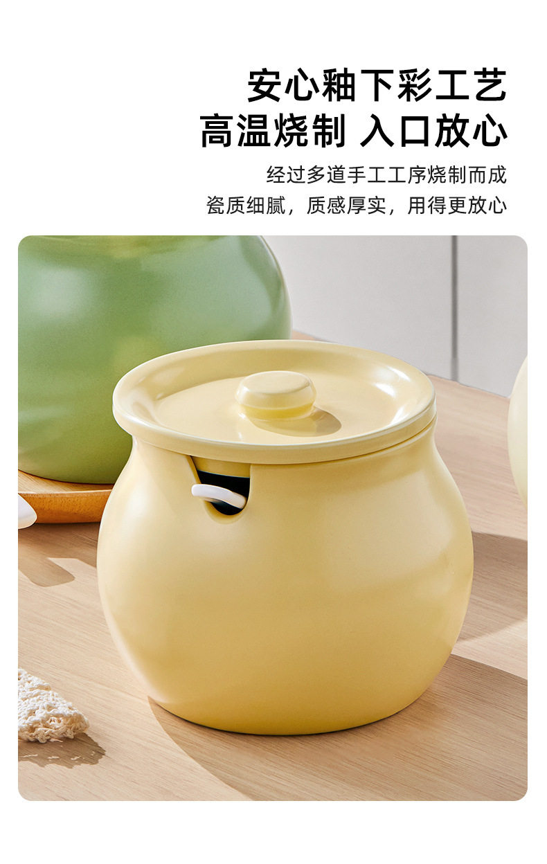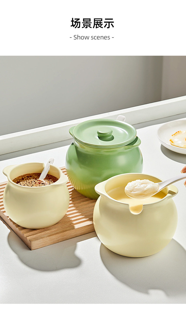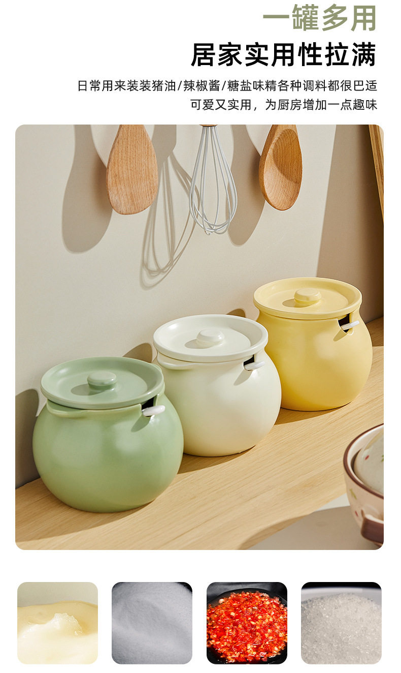 High-Temperature Resistant Ceramic Lard Jar, Household Kitchen Oil and Chili Seasoning Container with Lid and Spoon, Microwaveable Lard Jar