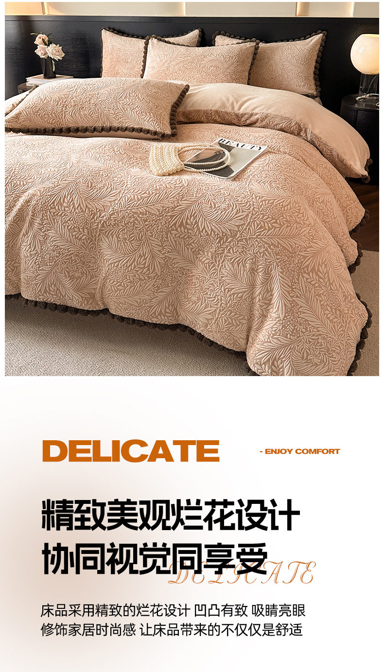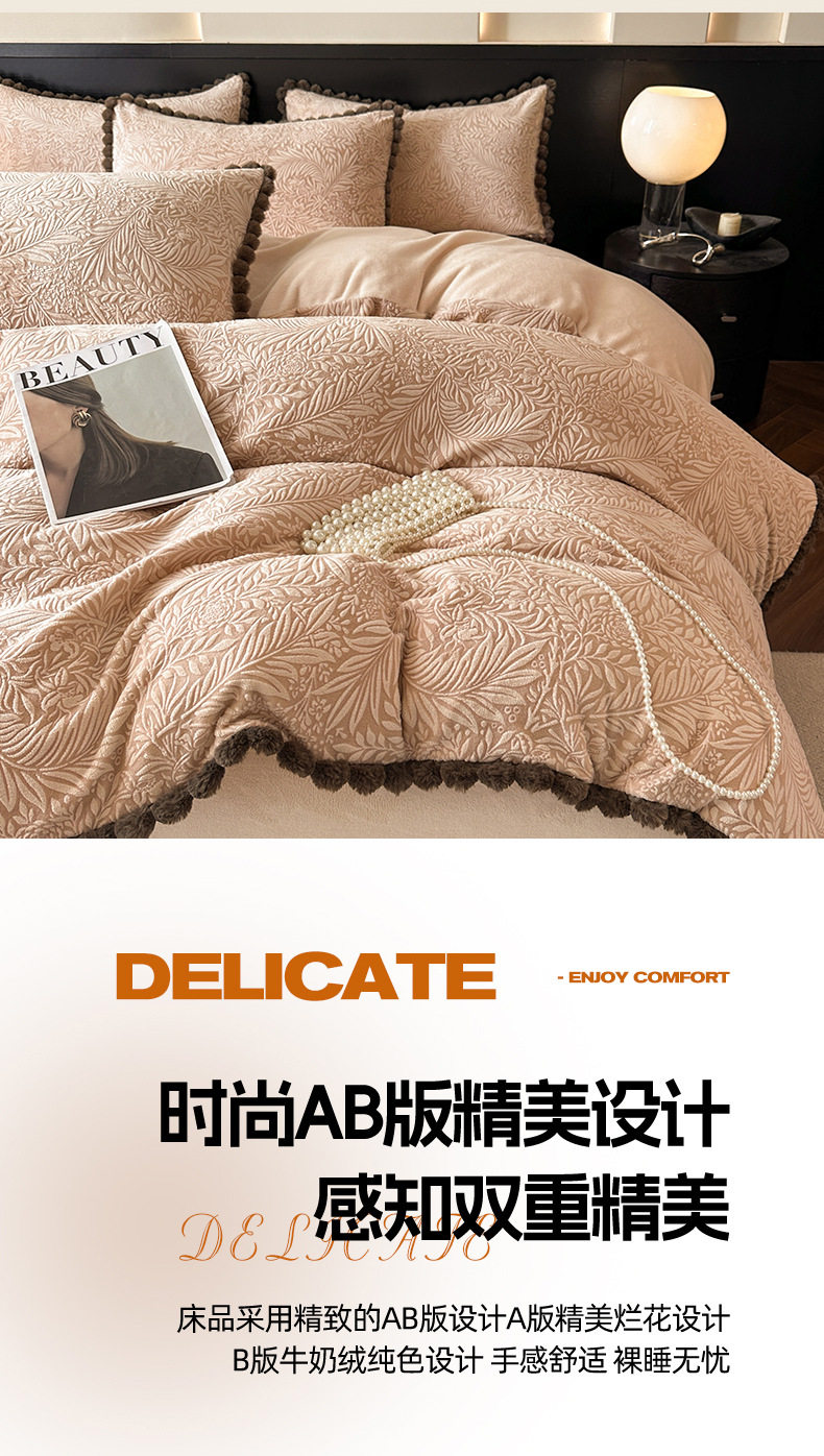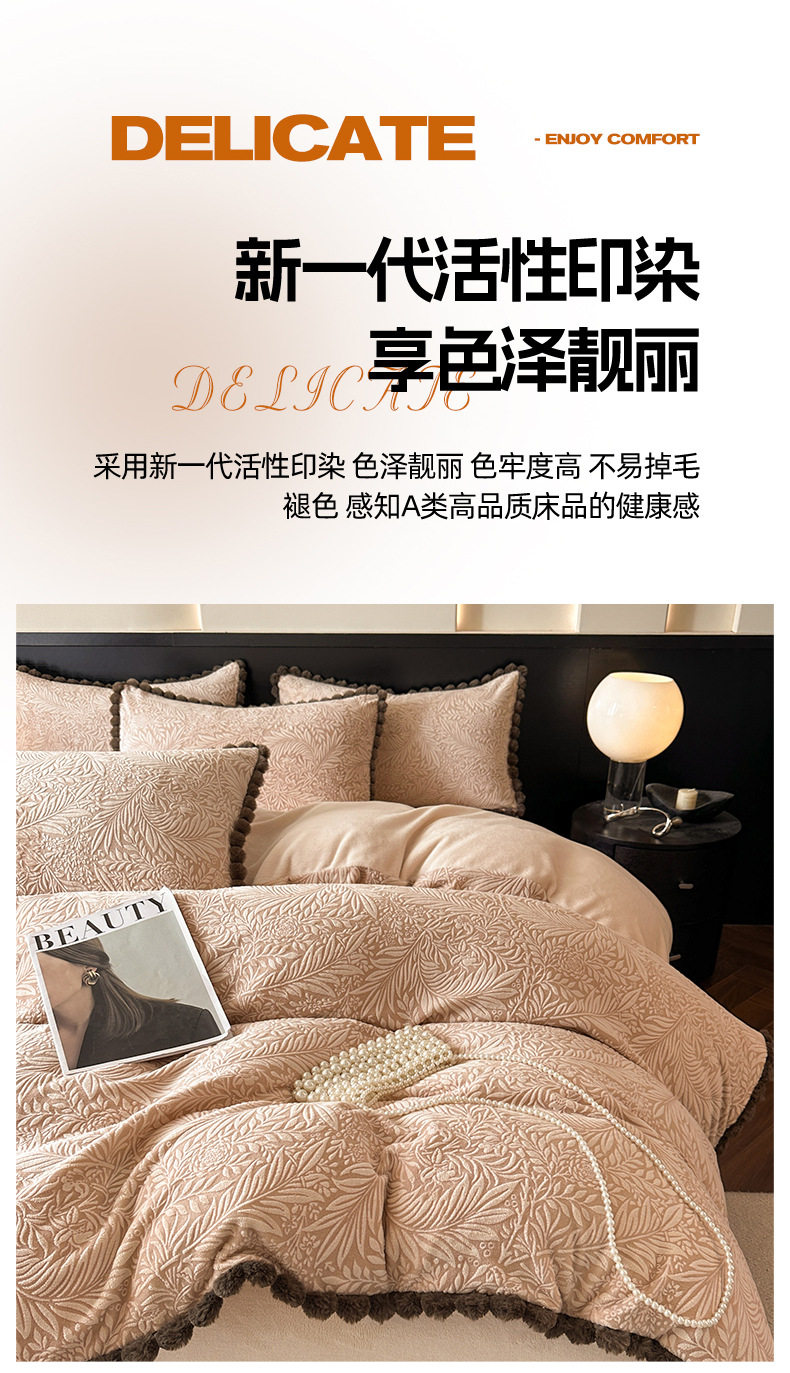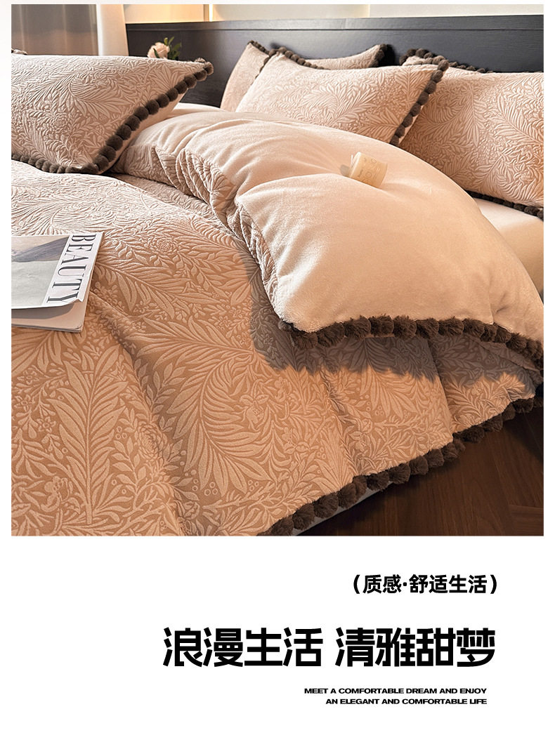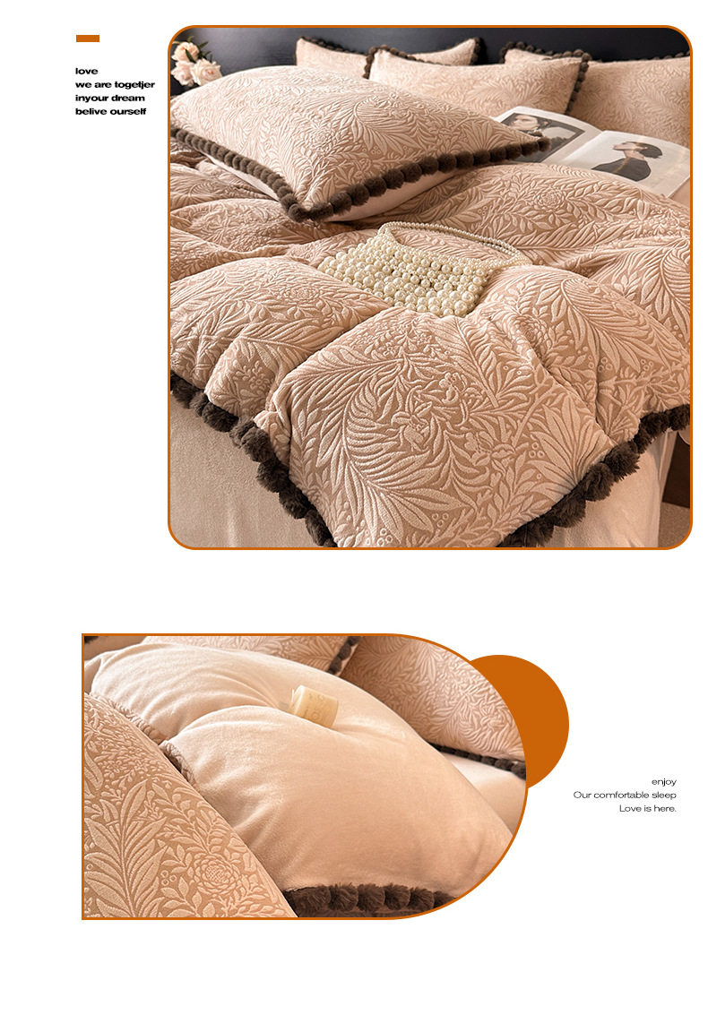 Rabbit Fur Ball Carved Milk Velvet Accessible Luxury Bed Four-Piece Set Coral Velvet Fleece-Lined Thickeneded Bed Bed Sheets Quilt Cover Three-Piece Winter Set