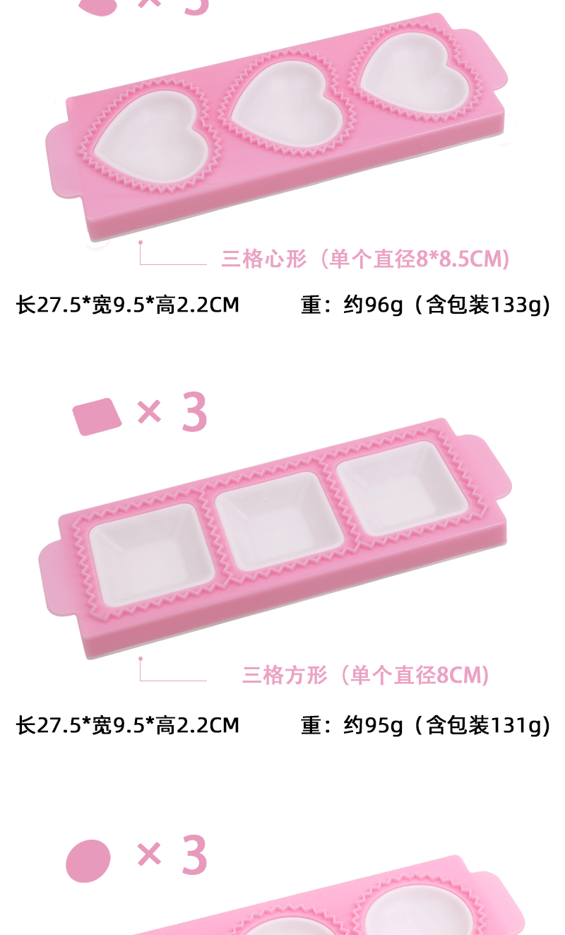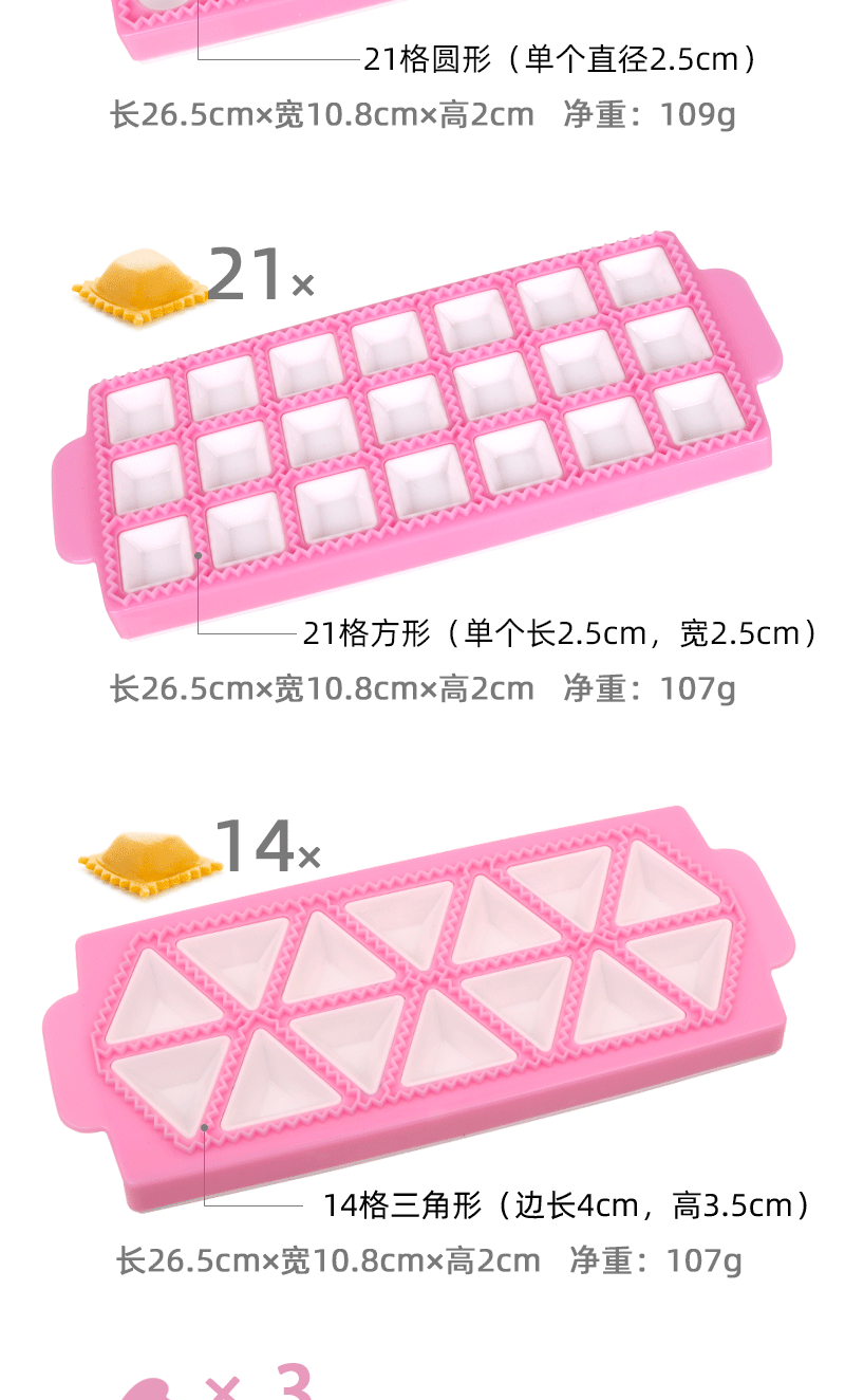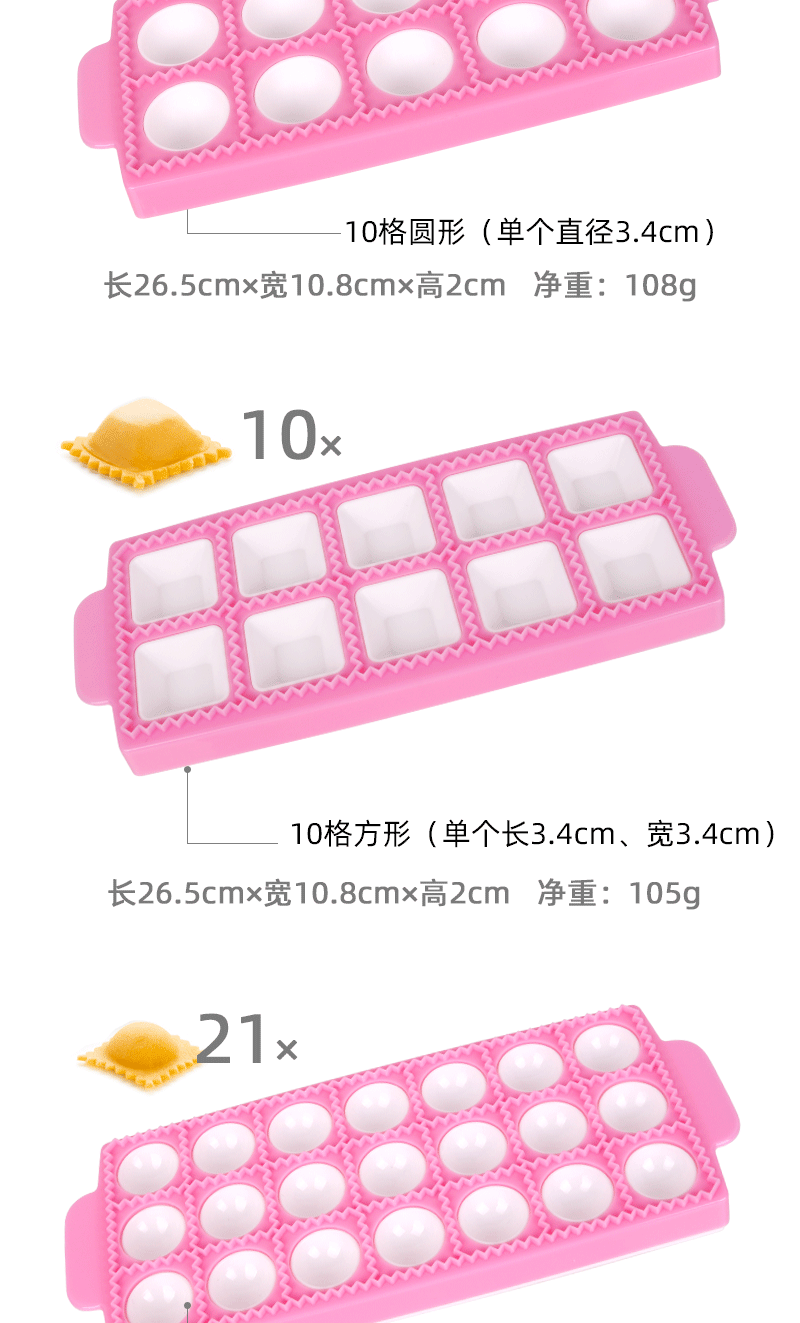 | Specifications | (pink) 10-grid round dumpling mold *no. 151*,(pink) 10-grid square dumpling mold *no. 152*,(pink) 21-grid round dumpling mold * no. 153 *,(pink) 21-square square dumpling mold * no. 155 *,(pink) 14-grid triangular dumpling mold * no. 221 *,(yellow) 10-grid round dumpling mold *no. 399,(yellow) 10-grid square dumpling mold *no. 398,(yellow) 21-grid round dumpling mold *no. 400,(yellow) 21-grid square dumpling mold *no. 481,(pink) 3-grid round dumpling mold *no. 483,(pink) 3-grid square dumpling mold *no. 483,(pink) 3-grid star-shaped dumpling mold *no. 483,(pink) 3-grid heart-shaped dumpling mold *no. 483,(pink) 8-grid heart-shaped dumpling mold *no. 483 |