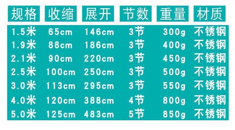 | Specifications | ★ ☆ Limited time promotion ☆ ★ ◆ ☆ 71cm—118cm (2 sections shrink) ▲ ✪ √ ✦,★ ☆ Limited time promotion ☆ ★ ◆ ☆ 65cm——150cm (three sections shrink) ▲ ✪ √ ✦,★ ☆ Limited time promotion ☆ ★ ◆ ☆ 88cm——190cm (three sections of shrinkage) ▲ ✪ √ ✦,★ ☆ Limited time promotion ☆ ★ ◆ ☆ 90cm——210cm (three sections shrink) ▲ ✪ √ ✦,◆ ☆ 100cm—250cm (three sections shrink) ▲ ✪ √ ✦,◆ ☆ 113cm—300cm (three sections shrink) ▲ ✪ √ ✦,◆ ☆ 120cm—400cm (four sections shrink) ▲ ✪ √ ✦,◆ ☆ 125cm—500cm (five sections shrink) ▲ ✪ √ ✦ |