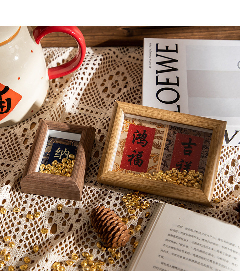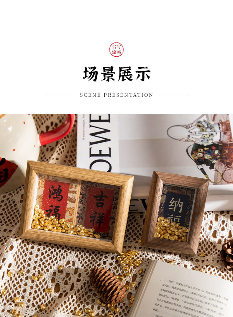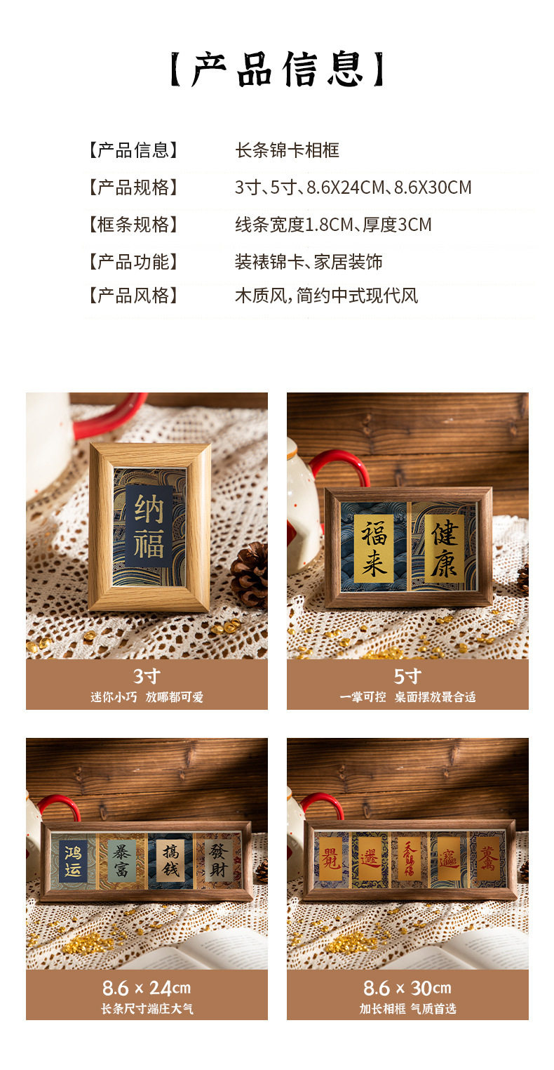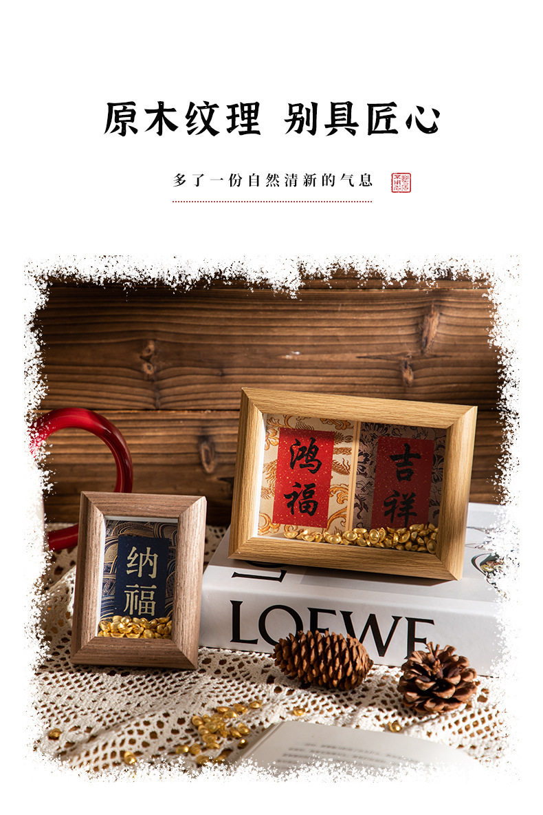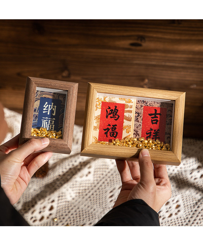 | Inner frame size | Wood color-hongfu-jixiang (8.9*12.7cm),Wood color-fulai-health (8.9*12.7cm),Coffee-hongfu-auspicious (8.9*12.7cm),Coffee-fulai-health (8.9*12.7cm),White oak-hongfu-auspicious (8.9*12.7cm),White oak-fulai-health (8.9*12.7cm),Log-good luck-rich-making money-making fortune (8.6*24cm),Log-ankang-peace-smoothness-joy (8.6*24cm),Coffee-good luck-get rich-make money-make a fortune (8.6*24cm),Coffee-ankang-peace-smoothness-joy (8.6*24cm),White oak - good luck - get rich - make money - make fortune (8.6*24cm),White oak-ankang-peace-smoothness-joy (8.6*24cm),Wood color-wufu (8.5*30cm),Log color-tian guan blessing (8.5*30cm),Brown-wufu (8.5*30cm),Brown-college blessing (8.5*30cm),White oak-wufu (8.5*30cm),White oak-tian guan blessing (8.5*30cm),Wood color-happiness (5.5*8.4cm),Wood color-nafu (5.5*8.4cm),Brown-happiness (5.5*8.4cm),Brown-nafu (5.5*8.4cm),White oak-happiness (5.5*8.4cm),White oak-nafu (5.5*8.4cm) |