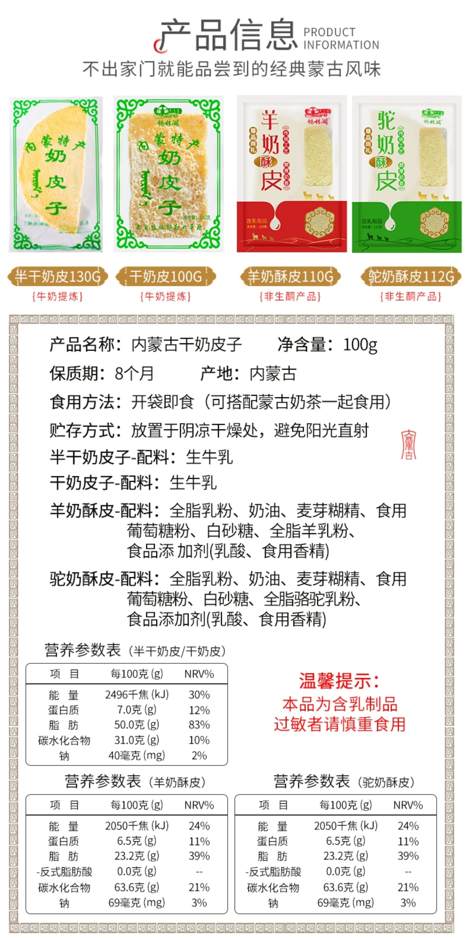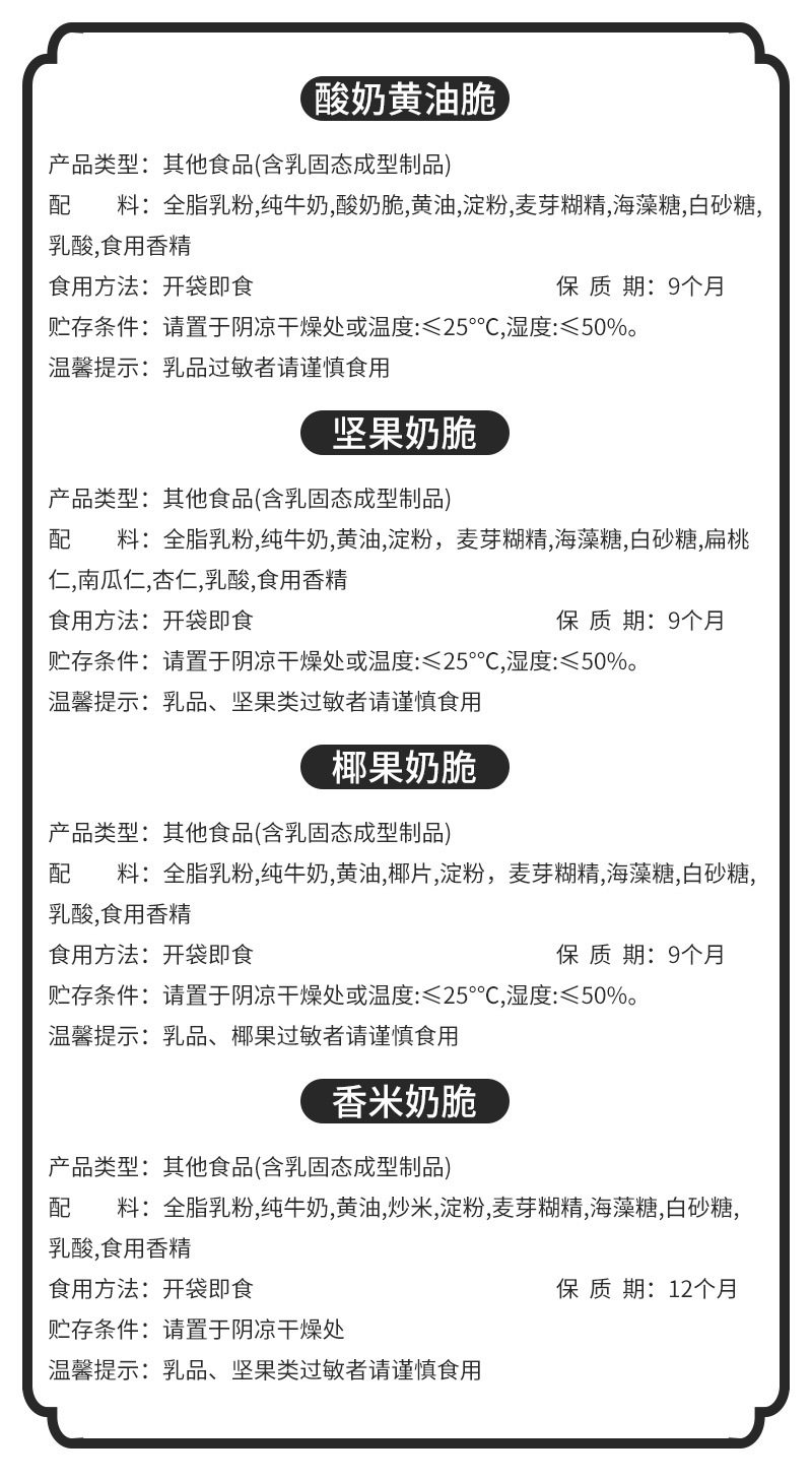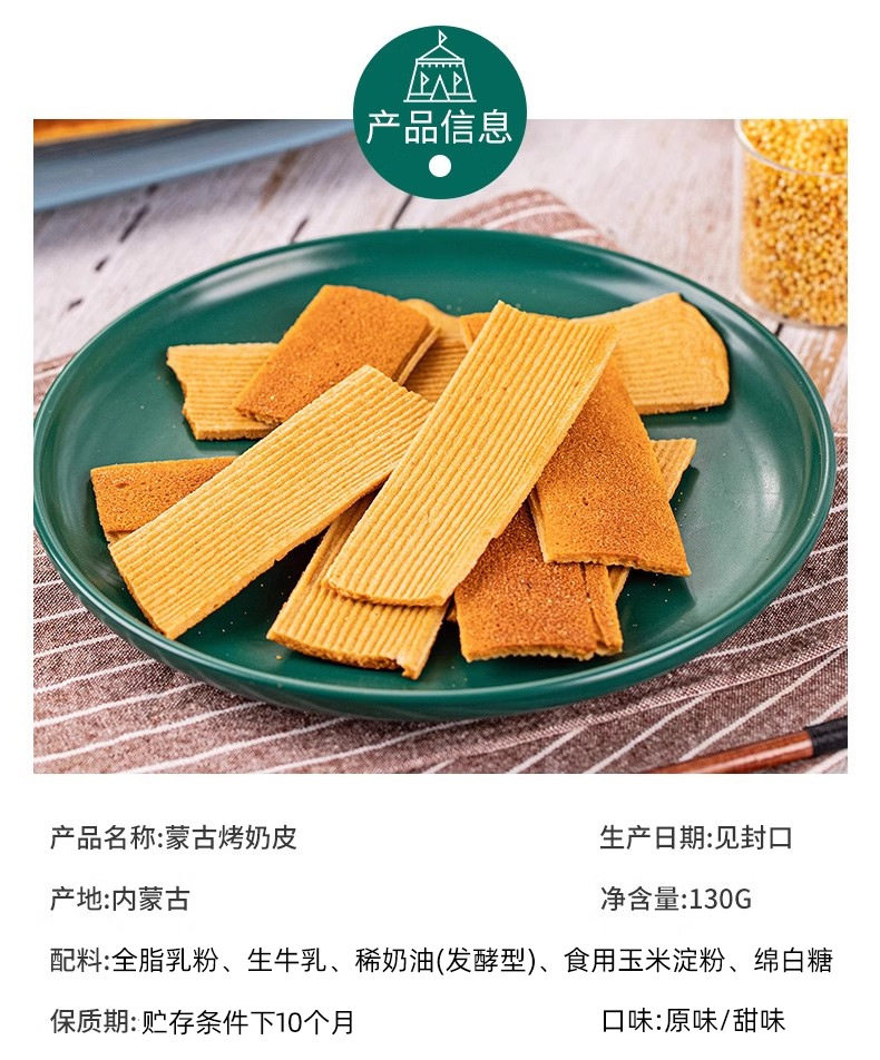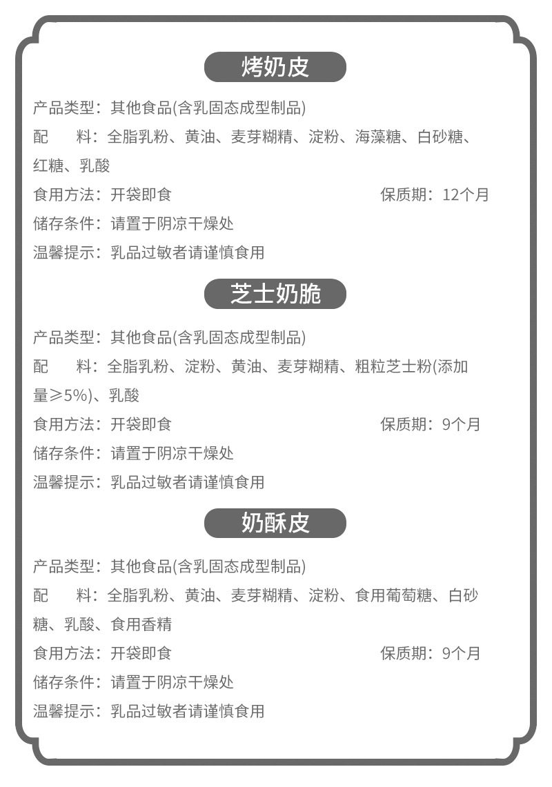 | Packaging specifications | Dry milk skin 90g,Semi-dry milk skin 130g-can be used to make candied haws,Semi-dry milk skin 150g-not recommended for making candied haws,Semi-dry milk skin 200g bag - not recommended for making candied haws,Semi-dry milk skin 200g box,Nut milk crisp 120g--buy 2 get 1 free,Coconut milk crisp 120g--buy 2 get 1 free,Yogurt butter crisp 120g--buy 2 get 1 free,Fragrant rice milk crisp 110g--buy 2 get 1 free,Goat milk puff pastry 110g--buy 2 and get 1 free,Camel milk puff pastry 112g--buy 2 and get 1 free,Sweet and sour crispy roasted milk skin - 130g long strip - buy 2 and get 1 free,Sweet and sour crispy roasted milk skin-130g round--take 2 and get 1 free,Milk puff pastry 110g,Cheese milk crisp 110g,Roasted milk skin 110g |