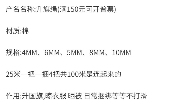 | Color | 4 # Flag rope 50m,4 # Flag rope 75m,4 # Flag rope 100m,5 # Flag rope 50m,5 # Flag rope 75m,5 # Flag rope 100m,6 # Flag rope 50m (commonly used),6 # Flag rope 75m (commonly used),6 # Flag rope 100m (commonly used),8 # Flag rope 50m,8 # Flag rope 75m,8 # Flag rope 100m,10 # Flag rope 50m,10 # Flag rope 75m,4 # Flag rope 25m,5 # Flag rope 25m,6 # Flag rope 25m (commonly used),8 # Flag rope 25m,10 # Flag rope 25m,10 # Flag rope 100m |