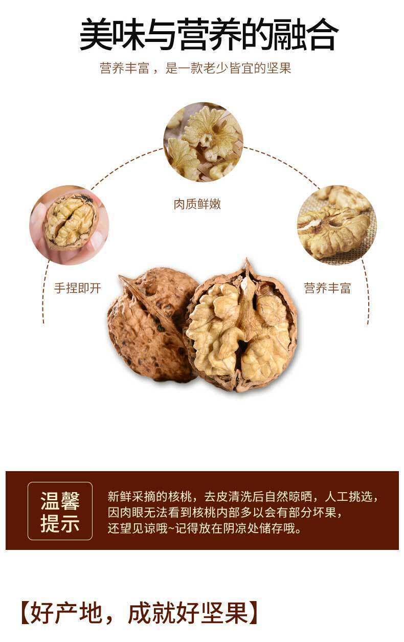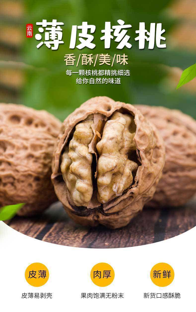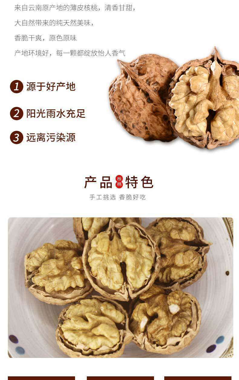 | Packaging specifications | 2.5kg net weight yunnan paper-skinned walnuts,1.5kg net weight yunnan paper-skinned walnuts,1.0kg net weight yunnan paper-skinned walnuts,0.5kg net weight yunnan paper-skinned walnuts,Half a pound of yunnan thin-skinned walnuts for tasting |