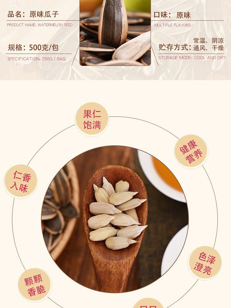 | Taste | Original raw melon seeds [small particles] 250g,Original raw melon seeds [large particles] 0.5kg,Original raw melon seeds [large particles] 1.0kg,Original raw melon seeds [large particles] 1.5kg,Original raw melon seeds [large particles] 2kg,Original raw melon seeds [large particles] 2.5kg,Original fried sunflower seeds [large particles] 0.5kg,Original fried sunflower seeds [large particles] 1.0kg,Original fried sunflower seeds [large particles] 1.5kg,Original fried sunflower seeds [large particles] 2kg,Original fried sunflower seeds [large particles] 2.5kg |
