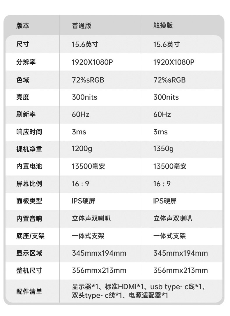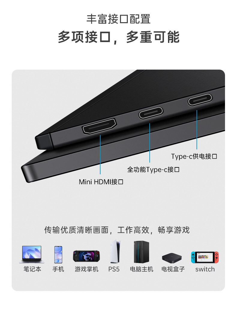 | Package list | Monitor*1, standard hdmi high-definition cable*1, double-ended type-c data cable*1, usb type-c power cable*1, power supply |