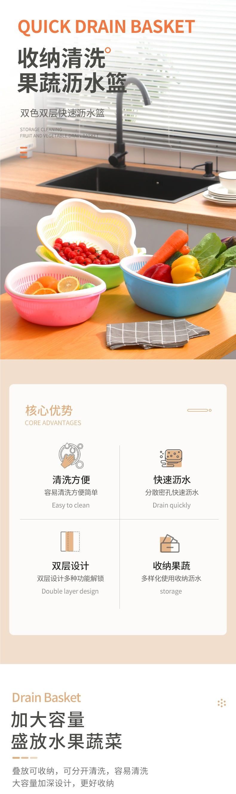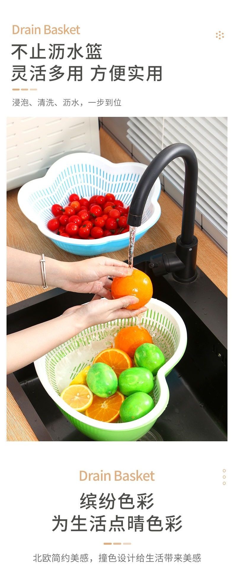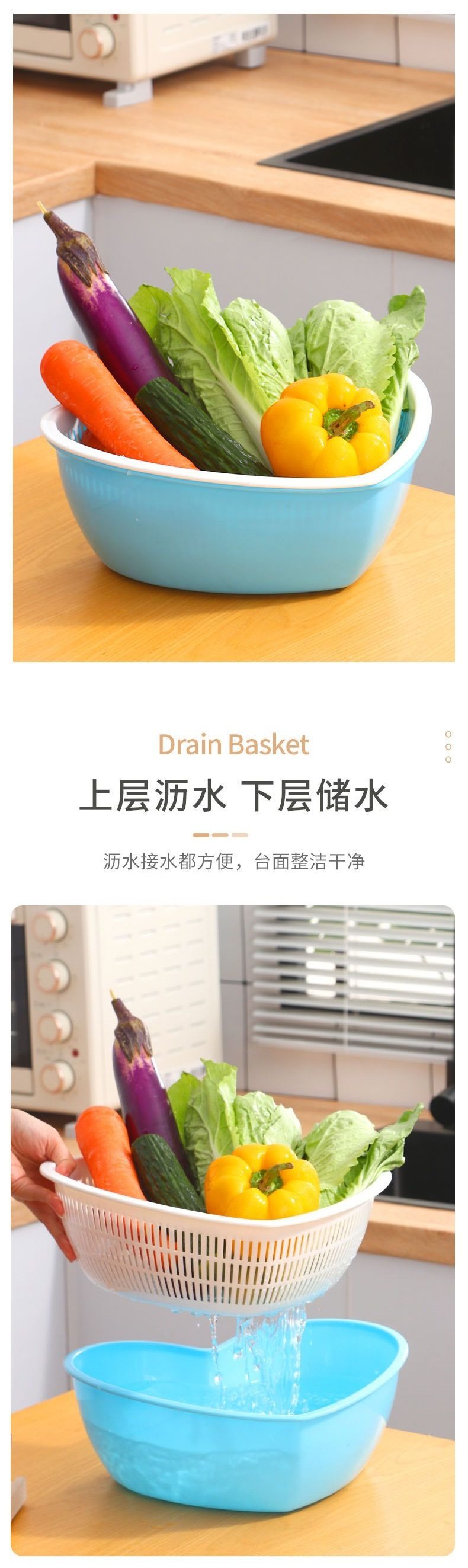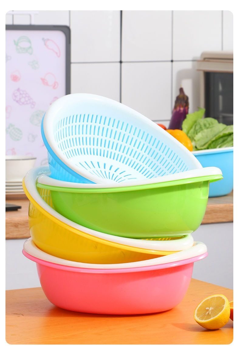 Double-Layer Fruit and Vegetable Drain Basket Plastic Fruit Basin Vegetable Washing Basket Kitchen Living Room Home Vegetable Washing Basin Complete Set