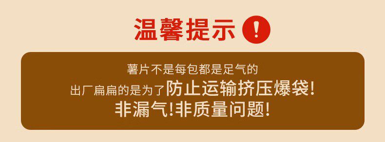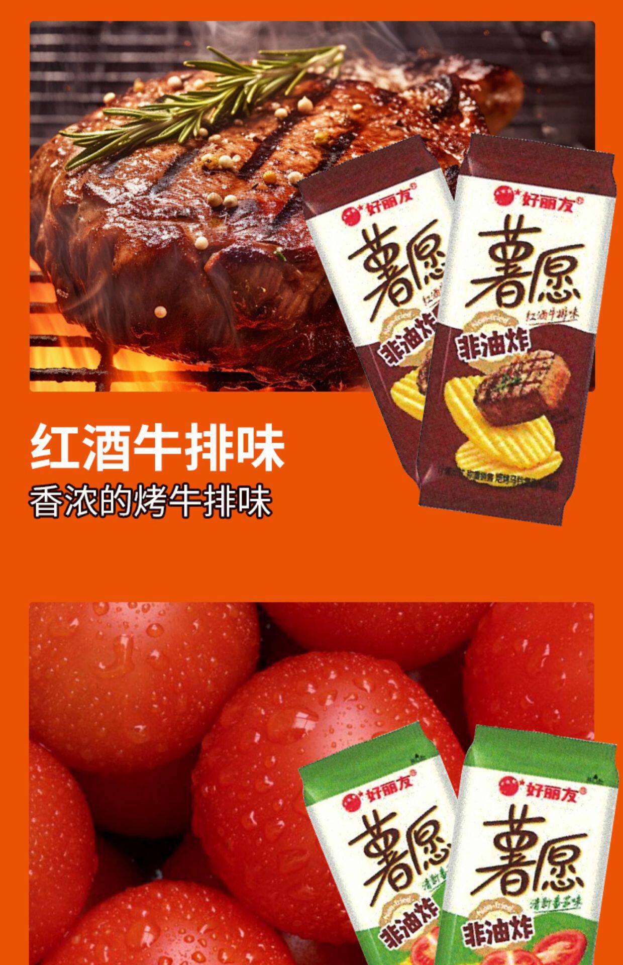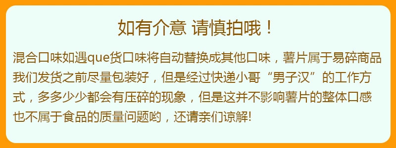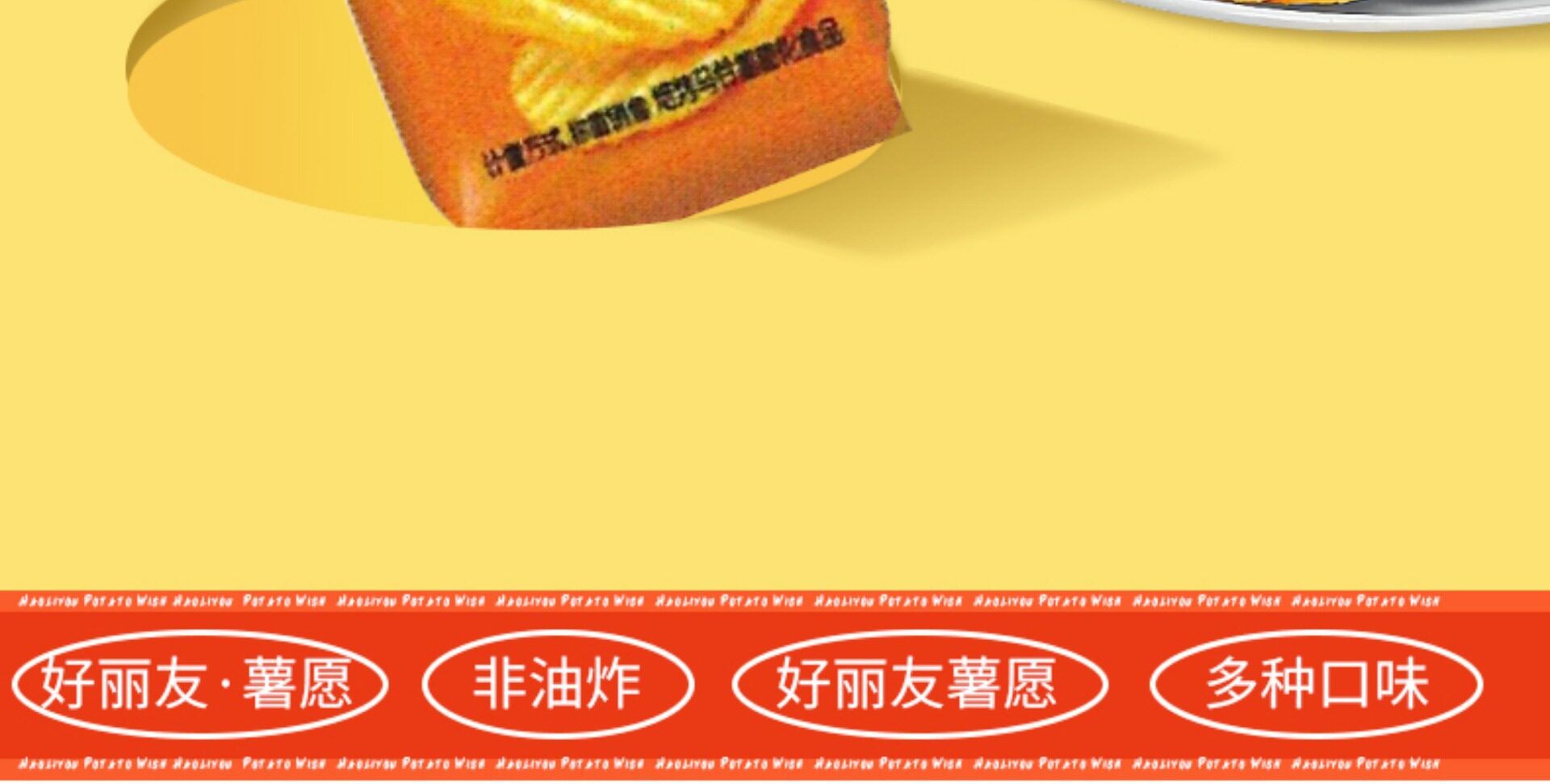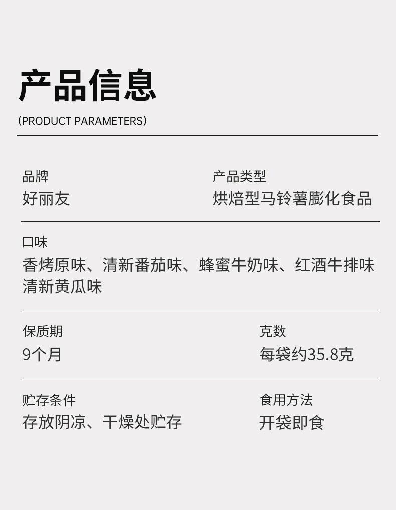 | Packaging specifications | 4 bags of potato chips original flavor 35.8g,8 bags of potato chips original flavor 35.8g,16 bags of potato chips original flavor 35.8g,4 bags of potato chips with fresh cucumber flavor 35.8g,8 bags of potato chips with fresh cucumber flavor 35.8g,16 bags of potato chips fresh cucumber flavor 35.8g,4 bags of potato red wine steak flavor 35.8g,8 bags of potato red wine steak flavor 35.8g,16 bags of potato red wine steak flavor 35.8g,4 bags of potato chips fresh tomato flavor 35.8g,8 bags of potato chips fresh tomato flavor 35.8g,16 bags of potato chips fresh tomato flavor 35.8g,4 bags of potato honey milk flavor 35.8g,8 bags of potato honey milk flavor 35.8g,16 bags of potato honey milk flavor 35.8g,4 bags of potato chips mixed with multiple flavors 35.8g (random flavors),8 bags of potato flavor mixed 35.8g (random flavor),16 bags of potato chips mixed with multiple flavors 35.8g (random flavors) |