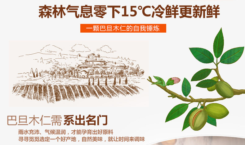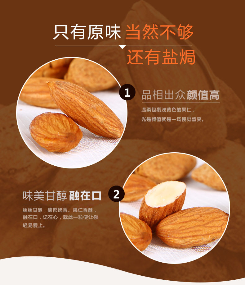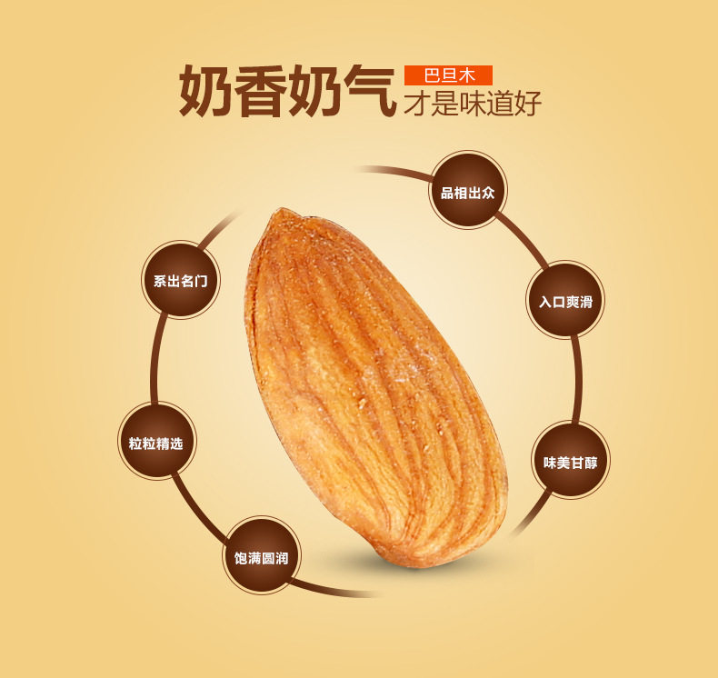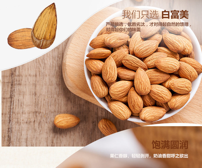 | Packaging specifications | [new arrival] almonds 250g*1 bag,[new arrival] almonds 250g*2 bags,[full and crispy] almond kernels 250g*1 can,[full and crispy] almond kernels 250g*2 cans,[selected large pieces] almonds 250g*3 cans,[selected large pieces] almonds 250g*4 cans,ãbulk discounts availableãalmonds, 500g jar,[must-have for stocking up] almonds 500g*2 cans,[net weight] almond kernels 250g*1 can,[net weight] almond kernels 500g*1 can,[net weight] almond kernels 500g*2 cans |