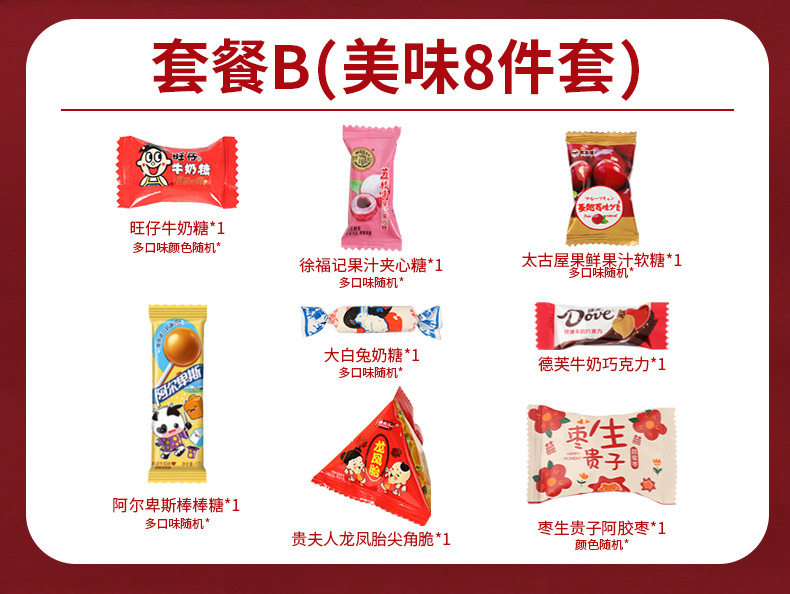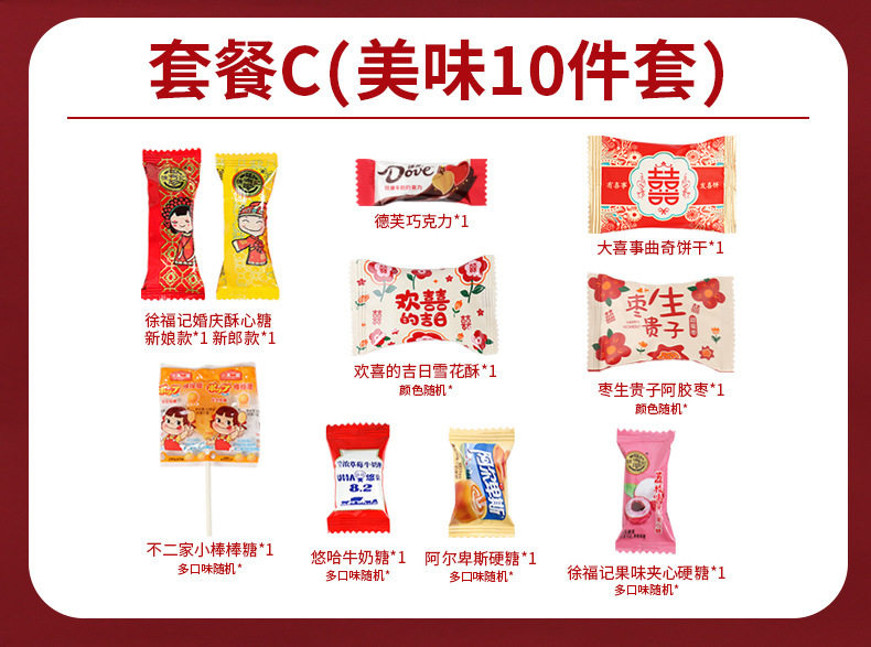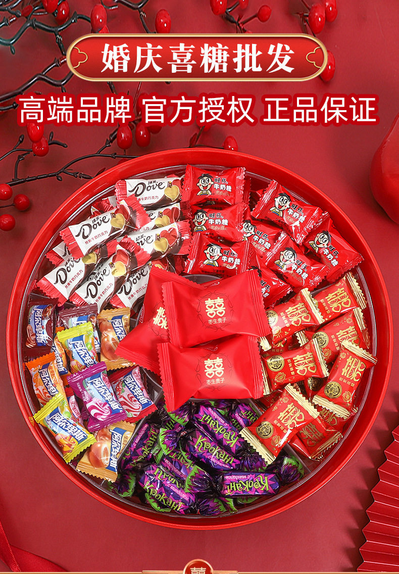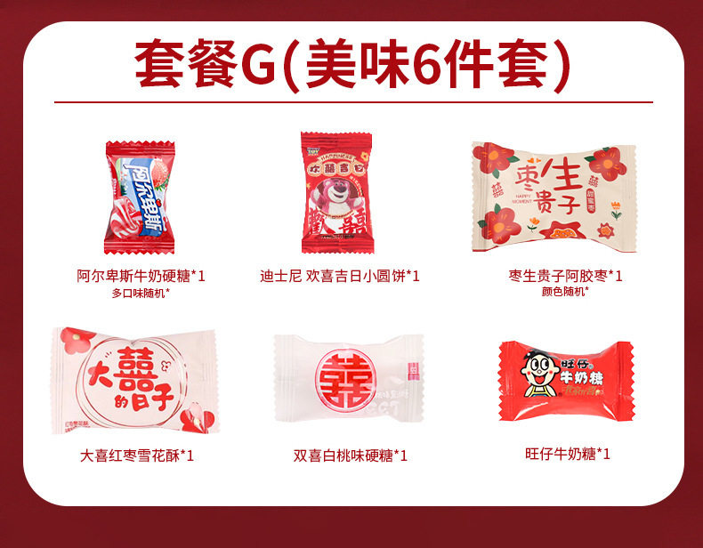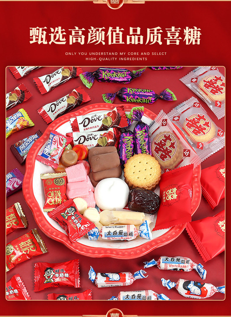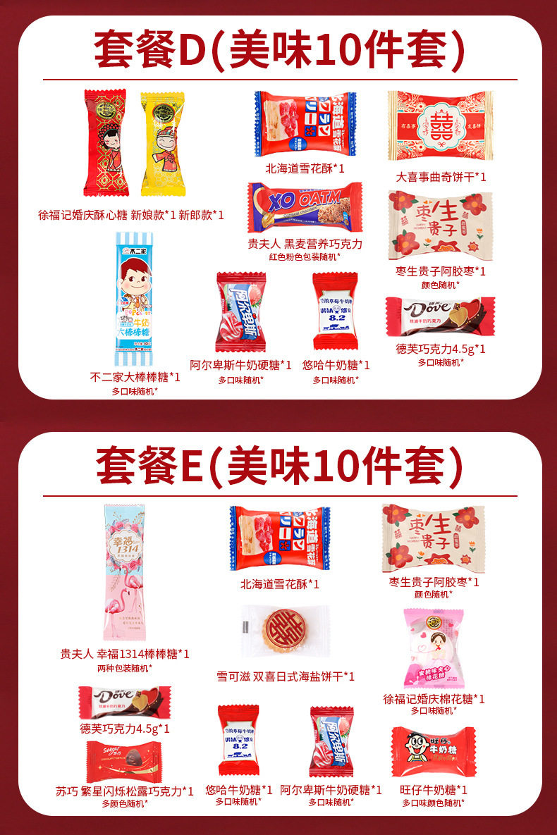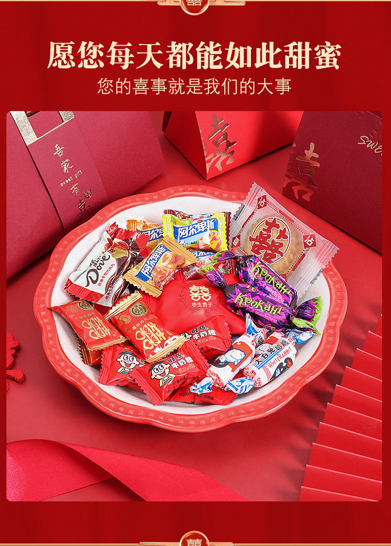 | Packaging specifications | Wedding candy-double happiness jujube gives birth to a son (0.5kg or about 40 pieces),Wedding candy-new year mixed random candy-500g [package a],Wedding candy-new year mixed random candy-500g [package b],Wedding candy-comprehensive style mixed random 500g,Wedding candy-milk candy (0.5kg about 160 pieces),Wedding candy-brand wedding candy 12 types, 8 pieces each (96 pieces in total),Wedding candy-hard candy (0.5kg pieces, about 130 pieces) [mixed flavors],Wedding candy-dove chocolate (0.5kg pieces, about 100 pieces),Wedding candy-george double happiness chocolate-500g,Wedding candy-russian kdv purple candy (0.5kg about 70 pieces),Wedding candy-white rabbit toffee (0.5kg pieces, about 90 pieces),Wedding candy-love candy (0.5kg pieces, about 100 pieces),Wedding candy-su xin candy (0.5kg about 38 pieces),Wedding candy - happy sea salt pancakes (0.5kg pieces, about 76 pieces),Wedding candy-nally cream filled chocolate-500g mix,Wedding candy-heart-to-heart gummy candies (0.5kg pieces, about 61 pieces),Wedding candy-big day red date snowflake cake (0.5kg about 40 pieces),Wedding candy-wedding gift cranberry snowflake crispy (0.5kg pieces, about 38 pieces),Wedding candy-weikouai french nut red-500g,Wedding candy-wedding gift peanuts (0.5kg about 42 pieces),Wedding candy-happy lollipop (0.5kg about 46 pieces),Wedding candy-xo nutritional rye chocolate mix 500g [about 40 pieces],Wedding candy-good day gummies (0.5kg about 46 pieces),Wedding candy-heartful sesame chocolate-500g,Wedding candy-hongyuan white peach juice hard candy (0.5kg about 120 pieces),Wedding candy-coflai flaxseed chocolate 500g (mixed),Wedding candy-fujia fruity milk candy (0.5kg pieces, about 120 pieces),Wedding candy-weikoai rose honey love coconut milk flavor lollipop-500g,Wedding candy - my family has happy waffle cake (0.5kg pieces, about 58 pieces),Wedding candy-yoha toffee mixed flavor (0.5kg pieces, about 100 pieces),Wedding candy-guochao small round cake (0.5kg pieces, about 56 pieces),Wedding candy-weikouai zhanzhanxi white peach flavor fruit gummies-500g,Wedding candy-wedding gift donkey hide gelatin jujube (0.5kg about 36 pieces),Wedding candy-weikouai rose honey love salted egg yolk malt cake-500g,Wedding candy-double happiness jujube and honey dates (0.5kg about 39 pieces),Wedding candy-happy event perfect small round cake (0.5kg about 45 packs),Wedding candy-double happiness cranberry snowflake crispy (0.5kg pieces, about 36 pieces),Wedding candy-happy day cranberry snowflake crispy (0.5kg about 34 pieces),Wedding candy-a love letter candy-500g,Wedding candy-i miss you so much (0.5kg about 36 pieces),Wedding candy-weikoai rose honey love cranberry milk fu-500g,Wedding candy-lucky cookies (mixed colors)-500g,Wedding candy-love letter mango flavor gummy-500g,Wedding candy-taoxi day gummies (0.5kg pieces, about 56 pieces),Wedding candy-happy events gummy candy 500g,Wedding candy-weikouai white sesame egg tart-500g,Wedding candy-happy events crispy candies (0.5kg about 42 pieces),Wedding candy-weikouai black gold sesame egg tart crisp-500g,Wedding candy-weikouai chocolate layer cake dry mix-500g,Wedding candy-ruyi chocolate crispy cone-500g,Wedding candy-ruyi happy event ruyi chocolate crisp 500g,Wedding candy-weikoai lucky bag good things peanuts-500g,Wedding candy-lite chocolate-500g (mixed colors),Wedding Candy - Cranberry Gummy Candy with the character "囍" (about 64 pieces per pound),Wedding candy-happy early baby fruit-mixed 500g,Wedding candy-double happiness coconut candy (0.5kg pieces, about 90 pieces),Wedding candy-ruyi double happiness crispy milk pastry 500g,Wedding candy-daxi coconut flavored lollipops (0.5kg pcs, about 42 pcs),Wedding candy-520 gummy candies (0.5kg about 35 pieces),Wedding candy-ruyi explosive tangerine peel flavored gummy candy-500g mixed,Wedding candy-happiness 1314 lollipops (0.5kg about 39 pieces),Wedding candy-double happiness white peach juice hard candy (0.5kg about 84 pieces),Wedding candy-happy fish skin peanuts-500g,Wedding candy-wedding gift caramel flavored wedding cake (0.5kg pieces, about 35 pieces),Wedding candy-ruyi crispy milk pastry mix-500g,Wedding candy-xi marshmallows (0.5kg about 70 pieces),Wedding candy-lucky marshmallows (0.5kg about 66 pieces),Wedding candy-gummy mixed flavor (0.5kg pieces, about 36 pieces),Wedding candy-weikouai a227 fruit juice gummy (special-shaped bag)-500g,Wedding candy-double marshmallows (0.5kg about 68 pieces),Wedding candy-yake love oatmeal chocolate (0.5kg pieces, about 54 pieces),Wedding candy-brushed nougat 500g (mixed),Wedding candy-ruyiren my family youxi gummy candy 500g (about 61 pieces),Wedding candy-ruyiren orange heart ruyi orange flavored gummy candy 500g (about 30 pieces),Wedding candy-happy events coconut soft candy mix 500g (about 50 pieces),Wedding candy - latte flavored lollipops 500g (about 45 pieces),Wedding candy-today’s happy date flavor pulp gummy candy 500g (about 55 pieces),Wedding candy-happy ruyi peach cake 500g,Wedding candy-good luck egg rolls 500g (about 20 pieces·),Wedding candy-hawthorn flavored gummy candy 500g (about 45 pieces),Wedding candy-everything will go well snowflake crispy 500g (about 36 pieces),Wedding candy-wedding gift red bean milk hard candy 500g (about 50 pieces),Wedding candy-ruyi wedding gift peach cake 500g (about 40 pieces),Wedding candy-happy event nougat 500g (about 50 pieces),Wedding candy-rainbow diary double happiness cheese 500g (about 46 pieces),Wedding candy-xi li cranberry snowflake crispy mixed color 500g (about 36 pieces),Wedding candy-ruyi golden joy gummy candy 500g,Wedding candy-ruyi haohe milk flavored hard candy mixed 500g,Wedding candy-ruyi youli chocolate crisp 500g,Wedding candy-ruyi red date flavor pulp gummy 500g,Wedding candy-your lady's wedding qq candy mix-500g,Wedding candy-mrs. persimmon ruyi gummy candy-500g,Wedding candy-mrs. we are getting married gummy candy-500g |
