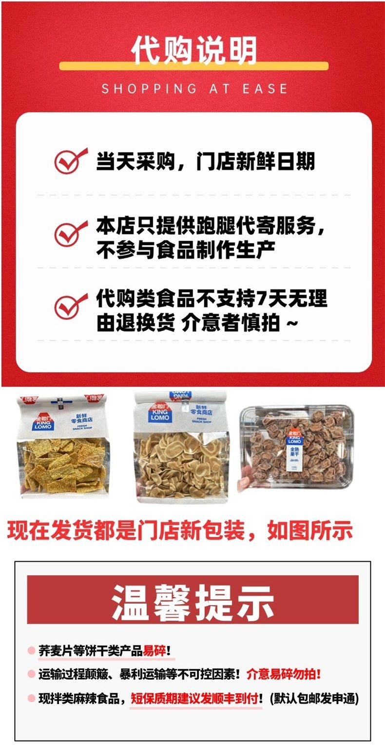 | Packaging specifications | Perilla and jujube granules 300g (-),Crispy rice crust 560g [fragile and fragile! ! 】(-),Children's fruit and vegetable steamed buns 220g (-),Xinjiang ruoqiang gray dates 700g (-),Northeastern pine nuts 620g (-),Purple cashew nuts 470g (-),300g potato chips [fragile! ! 】(-),Three french fries hug bucket 1 bucket (three flavors) (-),Baked buckwheat flakes 210g [fragile and fragile! ! 】(-),Kaka shrimp crackers 160g [fragile and fragile! ! ](-),Crispy florets 260g [fragile and fragile! ! 】(-),Probiotic gummy peach flavor 135g (-),Probiotic gummy yogurt flavor 135g (-),Probiotic earl gray tea cookies 128g (-),Black coffee flavored coffee sugar 100g (-),Honey butter potato crisp biscuits 220g [fragile and fragile! ! ](-),Cheese butter flavored biscuits 150g [fragile and fragile! ! ](-),Organic dried blueberries 250g (-),52% coconut crispy rolls 200g [fragile and fragile! ! 】(-),Brown sugar rice cake crispy 350g [fragile and fragile! ! 】(-),Double-sided crab-flavored crispy rice 480g [fragile and fragile! ! 】(-),Crab-flavored taro sticks 260g [fragile and fragile! ! 】(-),Seaweed small twist 400g (-),Seaweed corn crisps 150g [fragile and fragile! ! 】(-),Mixed fruit and vegetable crisps 260g (-),Almond milk and jujube 300g (-),Original hawthorn strips 430g/pack (-),Mulberry and hawthorn strips 430g/pack (-),Juice light jelly 800g (-),Fresh grilled cod fillet 180g (-),Crispy pepper peanuts 260g (-),Red guava dried 280g (-),Egg roll 330g [fragile and fragile! ! 】(-),Sweet and sour plum king 180g (-),Sea salt corn kernels 200g (-),Perilla and yellow peach 260g (-),Seven-flavor japanese-style bean fruit peanut kernels 210g (-),Toffee corn balls 145g (-),Sauce salted duck 350g/piece (-),Crispy hairtail fish segment 140g (-),Xinjiang tree ripe dried apricots 360g (-),Freeze-dried fruit tea 200g/bag (-),Small yellow croaker 130g (-),Almond crispy 180g (-),Green onion crispy cookies 300g [fragile and fragile! ! ](-),Finger air cheese sticks 240g [fragile and fragile! ! ](-),Mango cheese sticks 270g (-),Raspberry cheese sticks 270g (-),Honey crispy twist 480g (-),Seaweed and meat floss puff pastry roll 260g (-),Licorice plum cake 320g (-),Dried tangerines 210g (-),Dried mango 300g (-),Snowflake half plum 320g (-),Dried golden apricots 310g (-),Dried strawberries 260g (-),Dried yellow peach 275g (-),Prunes 320g (-),Rock sugar dongkui bayberry 270g (-),Sandwiched grape plum 250g (-),Plum with mangrove 240g (-),Seaweed and meat floss roll 500g (-),Strawberry yogurt cubes 250g (-),Raspberry yogurt cubes 250g (-),Vitality date ren pie 375g (-),Cashew milk fu jujube 300g (-),Naifu strawberry 285g (-),Yogurt hawthorn balls 350g (-),Yam and sesame sticks 290g (-),Freeze-dried fruit tea 200g (-),Crispy winter dates 215g (-),Banana chips 300g (-),Original fresh milk crisp 240g [fragile and fragile! ! 】(-),Deep sea fish cake 200g (-) |