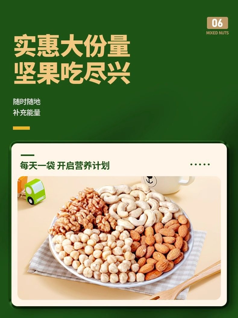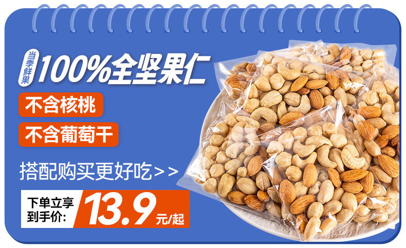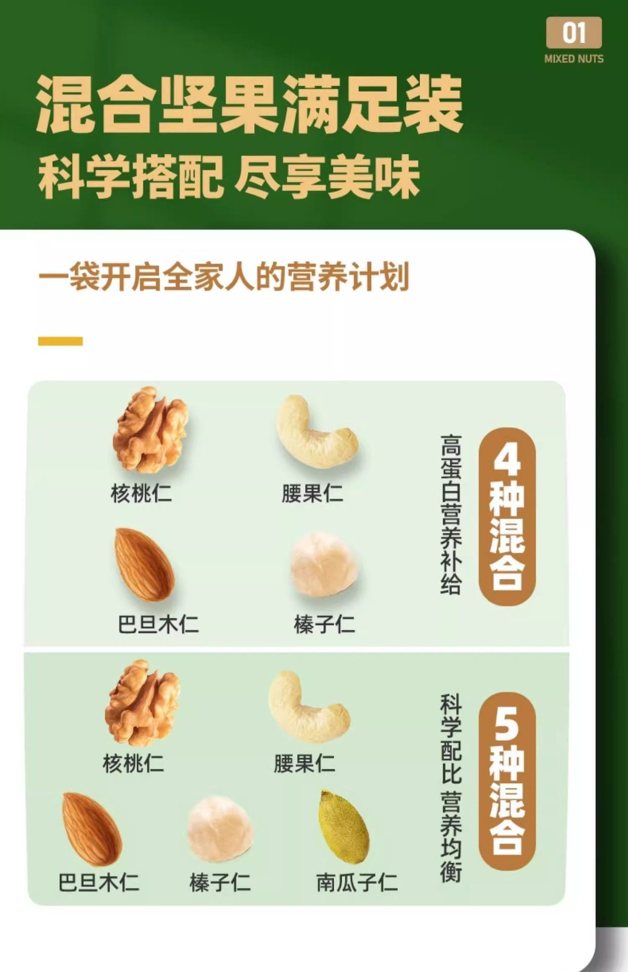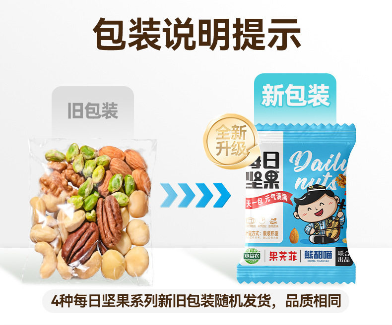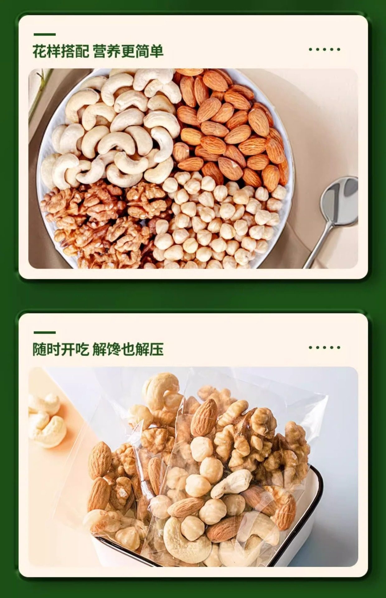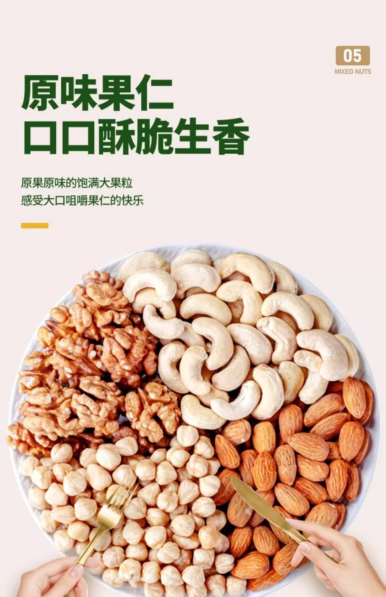 | Packaging specifications | [whole nut ratio] 15 packs of 4 types of pure nut kernels, get 15 packs free (30 packs sent, total 600g),[whole nut ratio] 15 packs of 5 types of pure nut kernels, get 15 packs free (30 packs sent, total 600g),[contains pistachio kernels] 15 packs of 5 types of pure nut kernels, get 15 packs free (30 packs sent, total 600g),[combined model] 15 packs of 4 types of pure nuts + 15 packs of 5 types of pure nuts,[combined model] 30 packs of 4 types of pure nuts + 30 packs of 5 types of pure nuts,Affordable [whole nut ratio] 60 packs of 4 types of pure nut kernels (1200g in total),Affordable [whole nut ratio] 60 packs of 5 types of pure nut kernels (1200g in total),Affordable [contains pistachio nuts] 60 packs of 5 types of pure nut kernels (1200g in total),Recommended model [whole nut ratio] 40 packs of 4 types of pure nut kernels (800g in total),Recommended model [whole nut ratio] 40 packs of 5 types of pure nut kernels (800g in total),Recommended [contains pistachio nuts] 40 packs of 5 types of pure nut kernels (800g in total),Mass sales package [total nut ratio] 100 packs of 4 types of pure nut kernels (2000g in total),Mass sales package [total nut ratio] 100 packs of 5 types of pure nut kernels (2000g in total),Mass sales package [contains pistachio nuts] 100 packs of 5 types of pure nut kernels (2000g in total),Taster pack [whole nut percentage] 15 packs of 4 types of pure nut kernels (300g in total),Taster pack [whole nut percentage] 15 packs of 5 types of pure nut kernels (300g in total),Large can [whole nut ratio] 5 kinds of pure nut kernels 500g*1 can,Taster pack [contains pistachio nuts] 15 packs of 5 types of pure nut kernels (300g in total),Large can [whole nut ratio] 5 kinds of pure nut kernels 500g*1 can (net content),Style [whole nut ratio] 4 kinds of nuts gift box style 600g*1 box,Style [whole nut ratio] 5 kinds of nuts gift box style 600g*1 box,More cost-effective [combined model] 4 types of nut gift boxes + 5 types of nut gift boxes, 1 box each,Affordable model [full nut ratio] 4 kinds of nuts gift box 600g*2 boxes,Affordable model [full nut ratio] 5 kinds of nuts gift box 600g*2 boxes,[whole nut ratio, 0 dried fruits] dates are fresh, effective, and more secure,------- ↓the following is the nut gift box version↓ ------- |