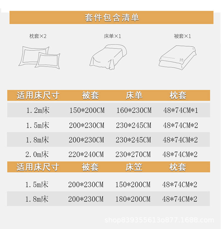 | Size specifications | 1.5m bed sheet three-piece set,1.8m bed sheet four-piece set,2.0m bed sheet four-piece set,1.5m fitted sheet set of four,1.8m fitted sheet set of four |