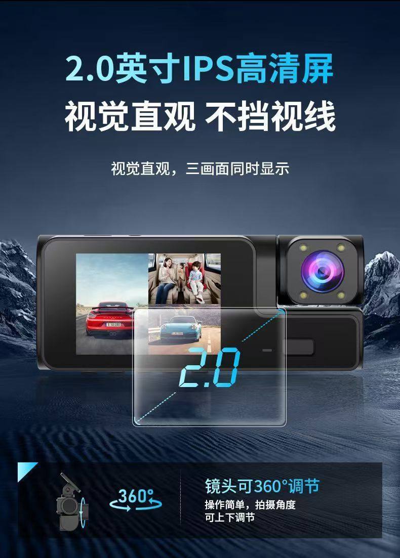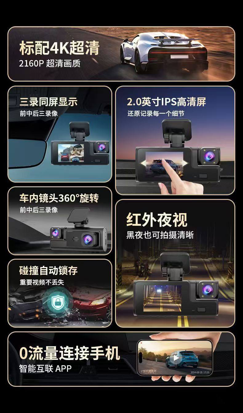 2025 New Driving Recorder Three Cameras with Same Screen 360 ° Panoramic Video Reversing Image 4K High-Definition Infrared Night Vision