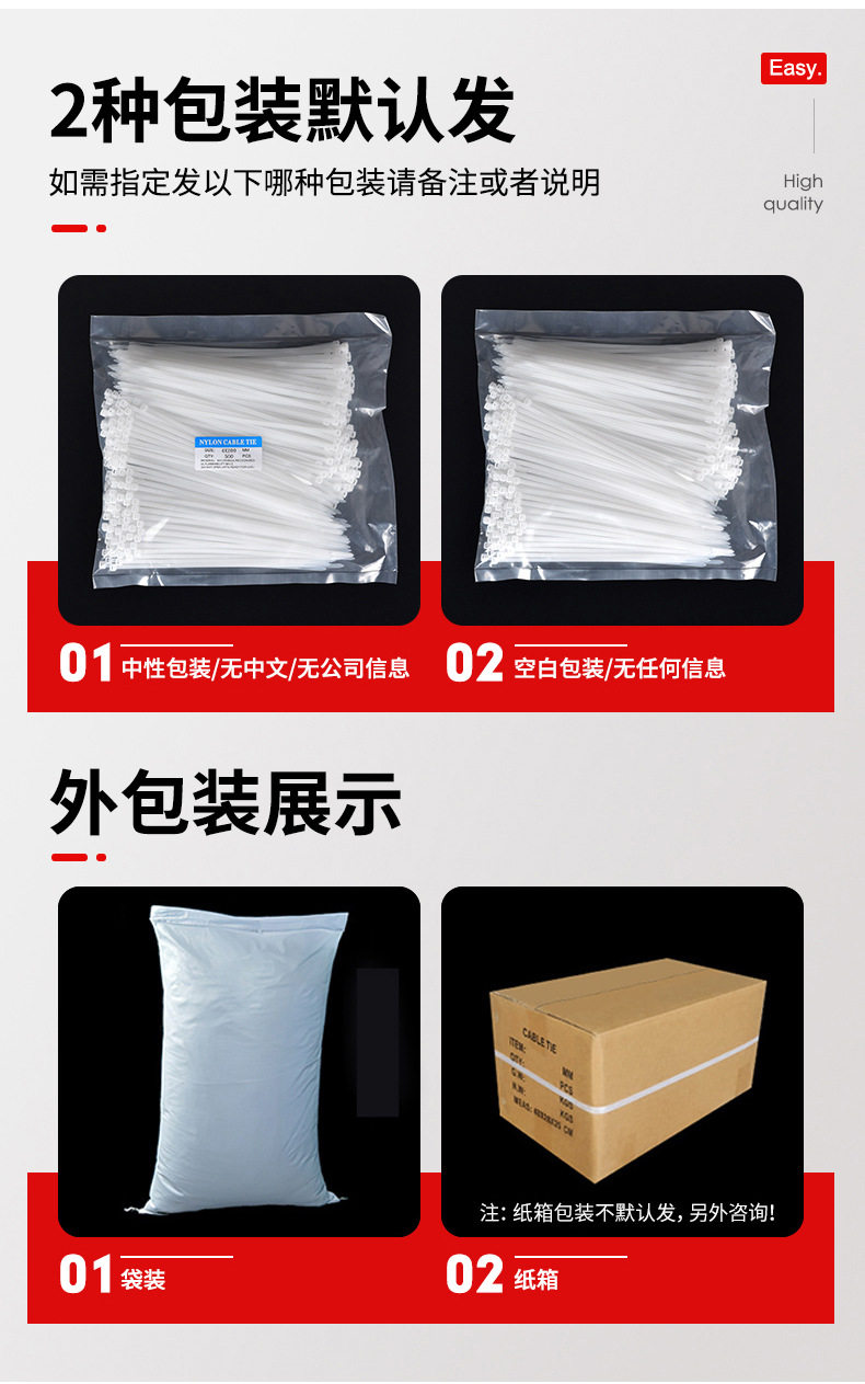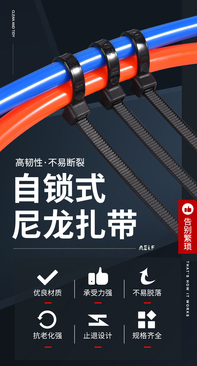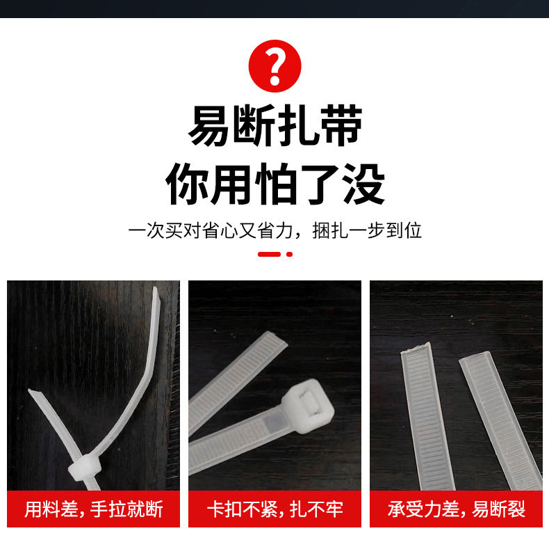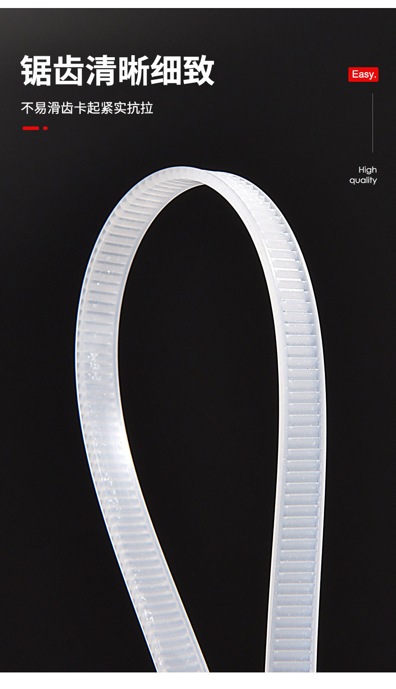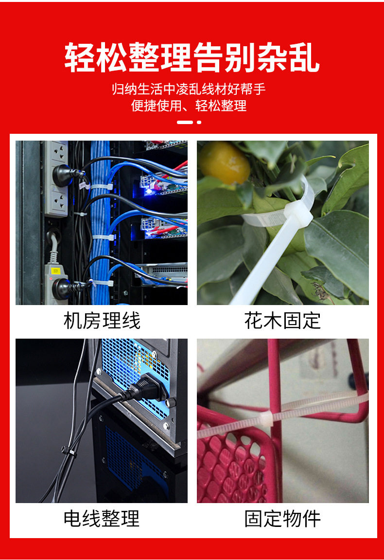 | Specifications and models | White cable ties; special offer 3.6*150 yellow 500 pieces,White cable ties; 3*100 non-standard width 1.8mm 1000 pieces/pack,White cable ties; 3*100 national standard width 2.5mm, 1000 pieces/pack,White cable ties; 3*120 non-standard width 1.8mm 1000 pieces/pack,White cable ties; 3*120 national standard width 2.5mm 1000 pieces/pack,White cable ties; 3*150 non-standard width 1.8mm 1000 pieces/pack,White cable ties; 3*150 national standard width 2.5mm 1000 pieces/pack,White cable ties; 3*200 non-standard width 2.0mm 500 pieces/pack,White cable ties; 3*200 national standard width 2.5mm, 500 pieces/pack,White cable ties; 4*150 non-standard width 2.7mm, 500 pieces/pack,White cable ties; 4*150 national standard width 3.5mm, 500 pieces/pack,White cable ties; 4*200 non-standard width 2.7mm, 500 pieces/pack,White cable ties; 4*200 national standard width 3.5mm, 500 pieces/pack,White cable ties; 4*250 non-standard width 2.7mm, 250 pieces/pack,White cable ties; 4*250 national standard width 3.5mm 250 pieces/pack,White cable ties; 4*300 non-standard width 2.7mm 250 pieces/pack,White cable ties; 4*300 national standard width 3.5mm 250 pieces/pack,White cable ties; 4*350 national standard width 3.5mm 250 pieces/pack,White cable ties; 5*100 non-standard width 3.6mm, 500 pieces/pack,White cable ties; 5*100 national standard width 4.5mm 250 pieces/pack,White cable ties; 5*120 non-standard width 3.6mm 500 pieces/pack,White cable ties; 5*120 national standard width 4.5mm 250 pieces/pack,White cable ties; 5*150 non-standard width 3.6mm 500 pieces/pack,White cable ties; 5*150 national standard width 4.5mm 500 pieces/pack,White cable ties; 5*200 non-standard width 3.6mm, 500 pieces/pack,White cable ties; 5*200 national standard width 4.8mm, 500 pieces/pack,White cable ties; 5*250 non-standard width 3.6mm 250 pieces/pack,White cable ties; 5*250 national standard width 4.8mm 250 pieces/pack,White cable ties; 5*300 non-standard width 3.6mm 250 pieces/pack,White cable ties; 5*300 national standard width 4.8mm 250 pieces/pack,White cable ties; 5*350 non-standard width 3.6mm 250 pieces/pack,White cable ties; 5*350 national standard width 4.8mm 250 pieces/pack,White cable ties; 5*400 non-standard width 3.6mm 250 pieces/pack,White cable ties; 5*400 national standard width 4.8mm 250 pieces/pack,White cable ties; 5*450 non-standard width 4.0mm 250 pieces/pack,White cable ties; 5*450 national standard width 4.8mm 250 pieces/pack,White cable ties; 5*500 non-standard width 4.0mm 250 pieces/pack,White cable ties; 5*500 national standard width 4.8mm 250 pieces/pack,White cable ties; 5*550 national standard width 4.8mm 250 pieces/pack,White cable ties; 5*600 national standard width 4.8mm 250 pieces/pack,White cable ties; 5*650 national standard width 4.8mm 250 pieces/pack,White cable ties; 5*700 national standard width 4.8mm 250 pieces/pack,White cable ties; 8*200 non-standard width 5.2mm 250 pieces/pack,White cable ties; 8*200 national standard width 7.6mm, 100 pieces/pack,White cable ties; 8*250 non-standard width 5.2mm 250 pieces/pack,White cable ties; 8*250 national standard width 7.6mm, 100 pieces/pack,White cable ties; 8*300 non-standard width 5.2mm 250 pieces/pack,White cable ties; 8*300 national standard width 7.6mm, 100 pieces/pack,White cable ties; 8*350 non-standard width 5.2mm 250 pieces/pack,White cable ties; 8*350 national standard width 7.6mm, 100 pieces/pack,White cable ties; 8*400 non-standard width 5.2mm 250 pieces/pack,White cable ties; 8*400 national standard width 7.6mm, 100 pieces/pack,White cable ties; 8*450 non-standard width 5.2mm 250 pieces/pack,White cable ties; 8*450 national standard width 7.6mm, 100 pieces,White cable ties; 8*500 non-standard width 5.2mm 250 pieces/pack,White cable ties; 8*500 national standard width 7.6mm, 100 pieces/pack,White cable ties; 8*550 national standard width 7.6mm, 100 pieces/pack,White cable ties; 8*600 national standard width 7.6mm, 100 pieces/pack,White cable ties; 8*650 national standard width 7.6mm, 100 pieces/pack,White cable ties; 8*700 national standard width 7.6mm, 100 pieces/pack,White cable ties; 8*800 national standard width 7.6mm, 100 pieces/pack,White cable ties; 10*400 national standard width 8.8mm, 100 pieces/pack,White cable ties; 10*450 national standard width 8.8mm, 100 pieces/pack,White cable ties; 10*500 national standard width 8.8mm, 100 pieces/pack,White cable ties; 10*550 national standard width 8.8mm, 100 pieces/pack,White cable ties; 10*600 national standard width 8.8mm, 100 pieces/pack,White cable ties; 10*650 national standard width 8.8mm, 100 pieces/pack,White cable ties; 10*720 national standard width 8.8mm, 100 pieces/pack,White cable ties; 10*760 national standard width 8.8mm, 100 pieces/pack,White cable ties; 10*800 national standard width 8.8mm, 100 pieces/pack,White cable ties; 10*900 national standard width 8.8mm, 100 pieces/pack,White cable ties; 10*1000 national standard width 8.8mm, 100 pieces/pack,White cable ties; 10*1200 national standard width 8.8mm 100 pieces/pack,White cable ties; 10*1500 width 9.0mm 50 pieces/pack,White cable ties; 12*300 width 12mm 100 pieces/pack,White cable ties; 12*500 width 12mm 100 pieces/pack,White cable ties; 12*650 width 12mm 100 pieces/pack,White cable ties; 12*800 width 12mm 100 pieces/pack,White cable ties; 3*60 non-standard width 1.8mm 1000 pieces/pack,Black cable ties; special offer 3.6*150 yellow 500 pieces,Black cable ties; 3*100 non-standard width 1.8mm 1000 pieces/pack,Black cable ties; 3*100 national standard width 2.5mm, 1000 pieces/pack,Black cable ties; 3*120 non-standard width 1.8mm 1000 pieces/pack,Black cable ties; 3*120 national standard width 2.5mm, 1000 pieces/pack,Black cable ties; 3*150 non-standard width 1.8mm 1000 pieces/pack,Black cable ties; 3*150 national standard width 2.5mm 1000 pieces/pack,Black cable ties; 3*200 non-standard width 2.0mm, 500 pieces/pack,Black cable ties; 3*200 national standard width 2.5mm, 500 pieces/pack,Black cable tie