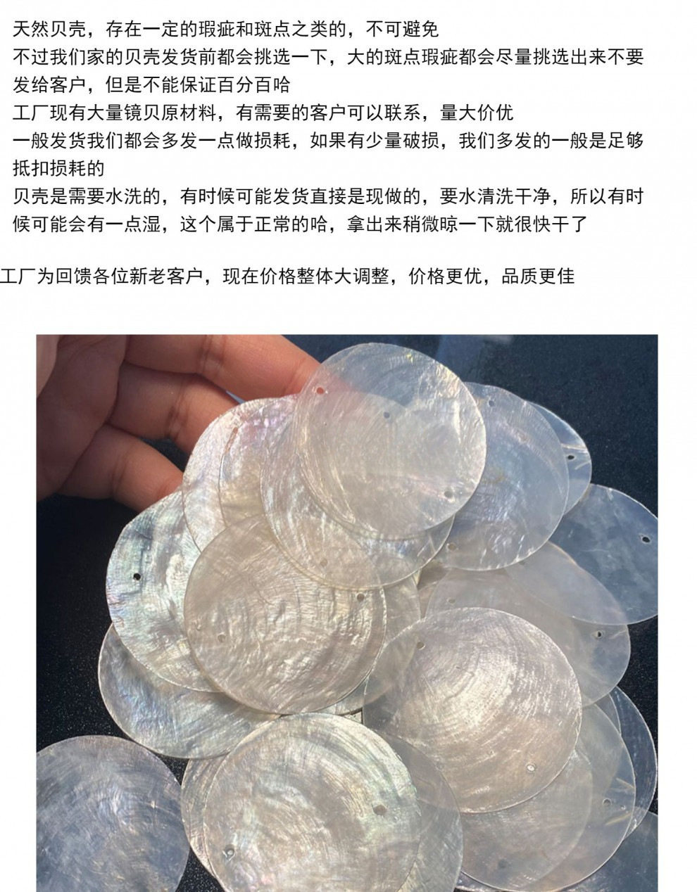 | Color | 2cm round chip single hole,5cm disc double hole ordinary version,5cm disc double hole bleaching, whiter and more transparent,5cm disc single hole,5cm disc without holes,4cm disc double hole,4cm disc single hole,4cm disc without holes,3cm disc double hole,3cm disc single hole,3cm disc without holes,2cm without holes |