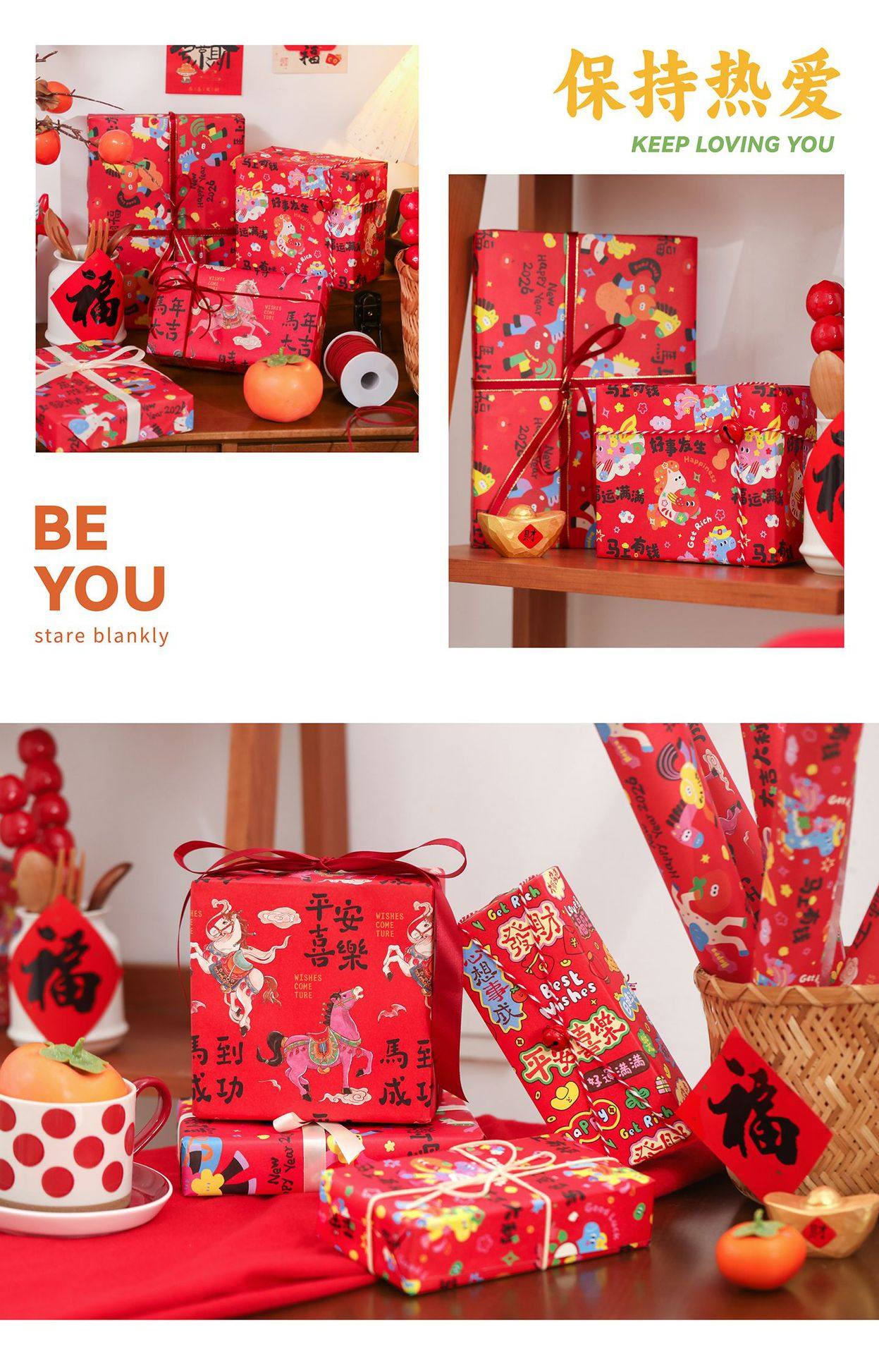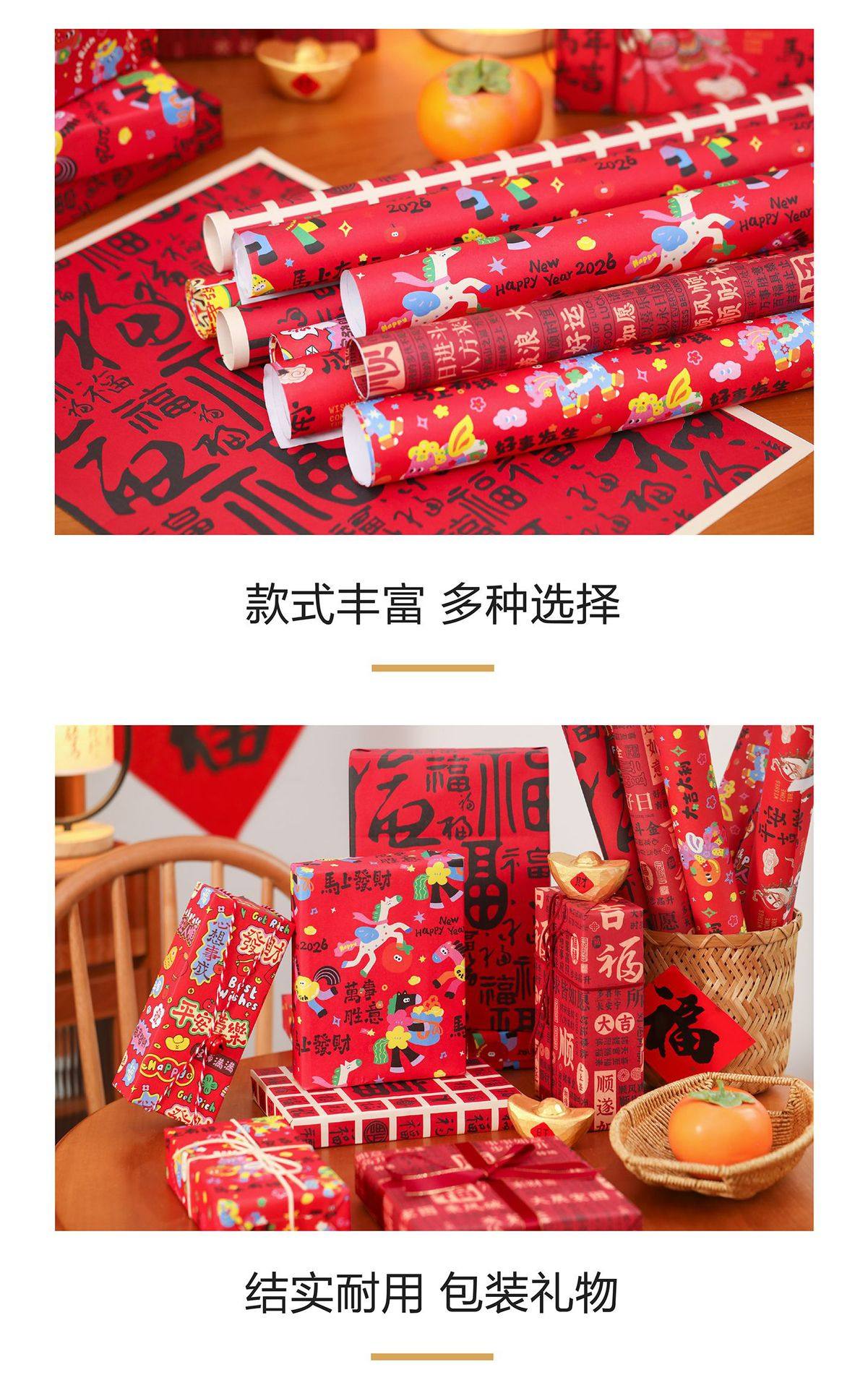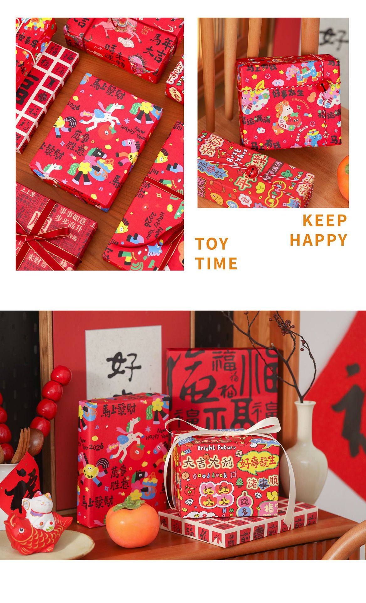 2026 New Year Gift Wrapping Paper Cartoon Pony Red Festive Large Thickeneded Kraft Paper Gift Wrapping Paper