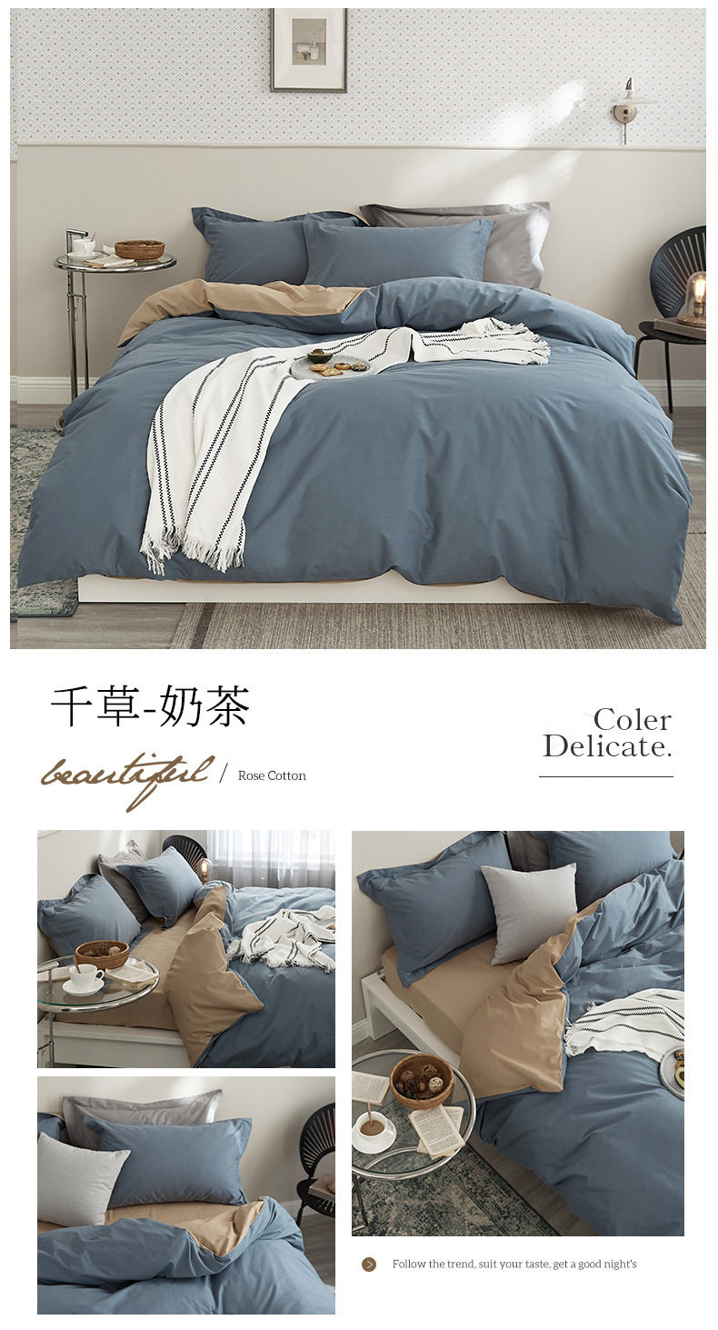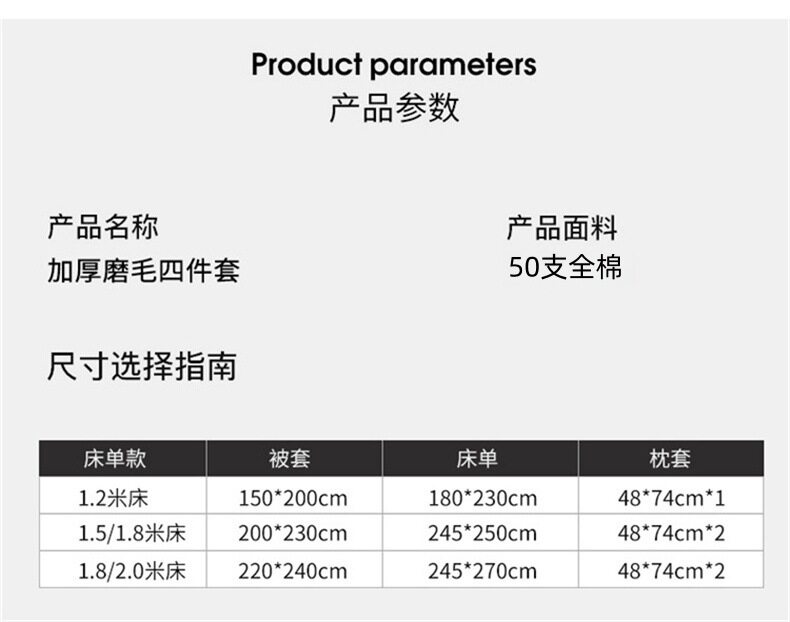 | Size specifications | 1.2m bed sheet three-piece set - suitable for 150*200cm quilt,1.5m bed sheet four-piece set - suitable for 200*230cm quilt,1.8m bed sheet four-piece set - suitable for 200*230cm quilt,2.0m bed sheet four-piece set - suitable for 220*240cm quilt,1.2m fitted sheet three-piece set - suitable for 150*200cm quilt,1.5m fitted sheet set of four - suitable for 200*230cm quilt,1.8m fitted sheet set of four - suitable for 200*230cm quilt,2.0m fitted sheet set of four - suitable for 220*240cm quilt |
