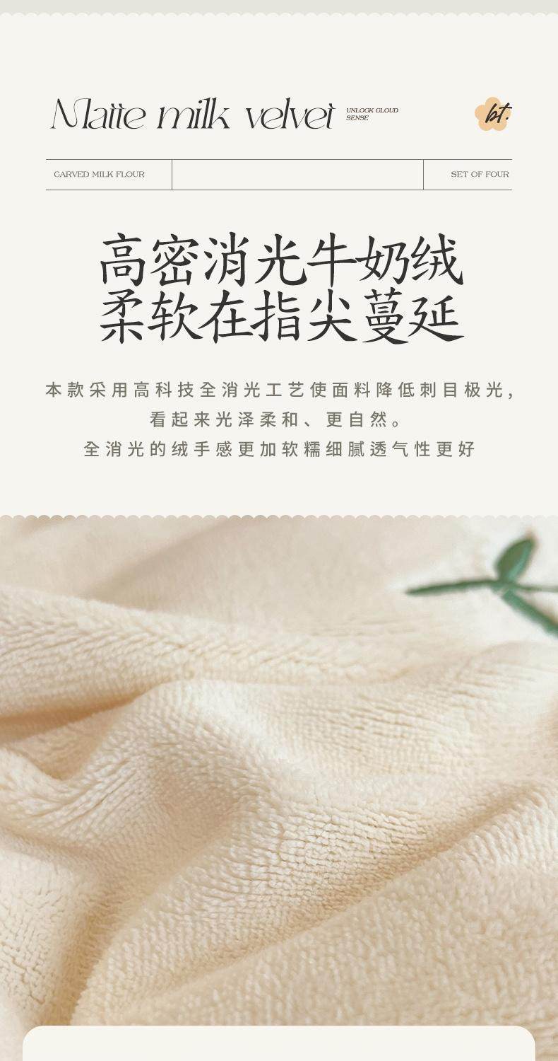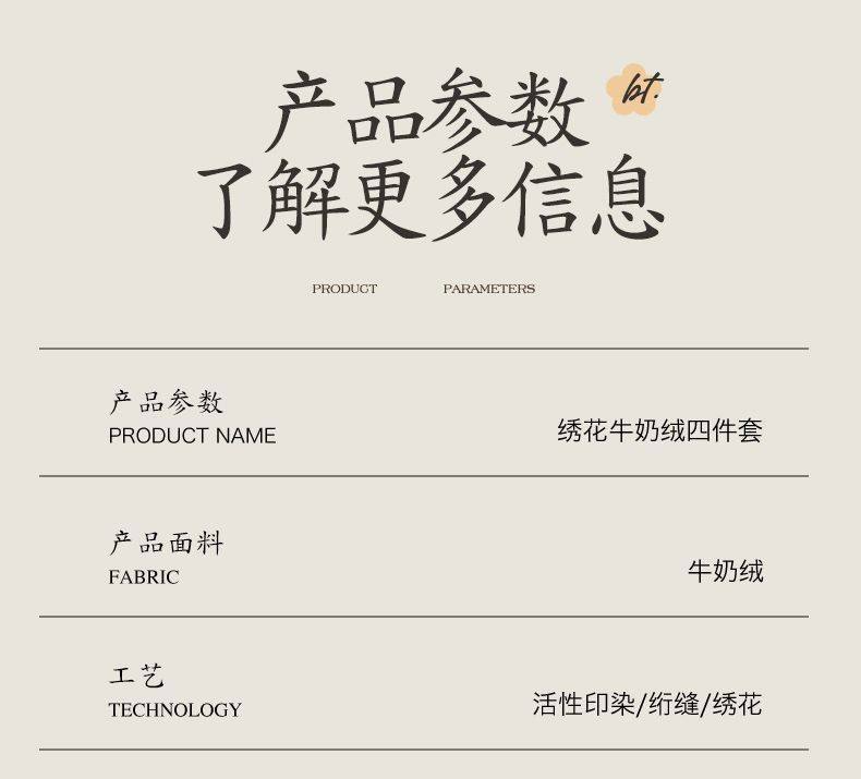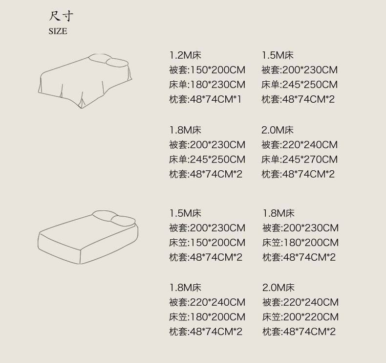 | Size specifications | 1.2m three-piece bed sheet set, quilt cover 150x200,1.5m bed sheet four-piece set-quilt cover 200x230,1.8m bed sheet four-piece set-quilt cover 200x230,2.0m bed sheet four-piece set-quilt cover 220x240,1.5m fitted sheet set of four-quilt cover 200x230,1.8m fitted sheet set of four-quilt cover 200x230 |