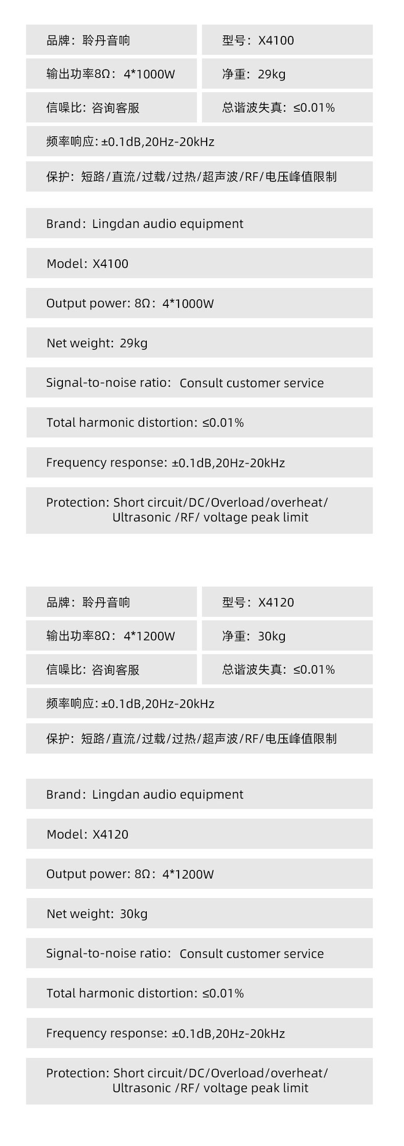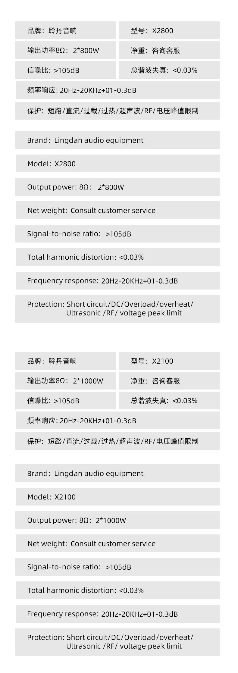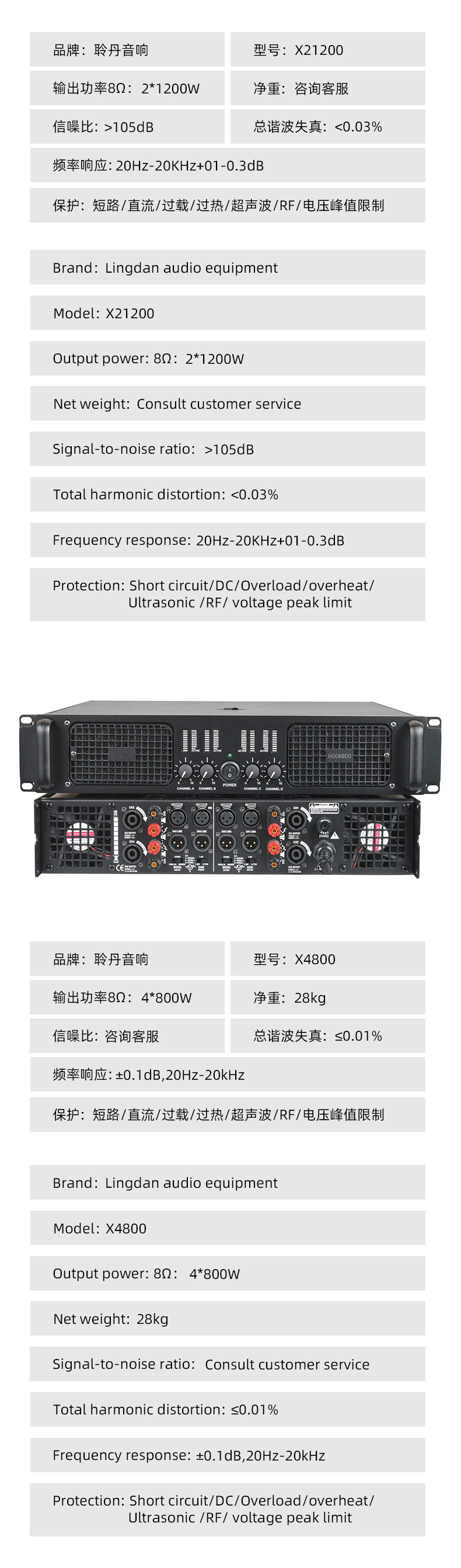 | Product specifications | Two-channel power amplifier-x2600,Two-channel power amplifier-x2800,Two-channel power amplifier-x2100,Two-channel power amplifier-x21200,Three-channel power amplifier-x3680,Three-channel power amplifier-x3810,Four-channel power amplifier-x4800,Four-channel power amplifier-x4100,Four-channel power amplifier-x4120 |