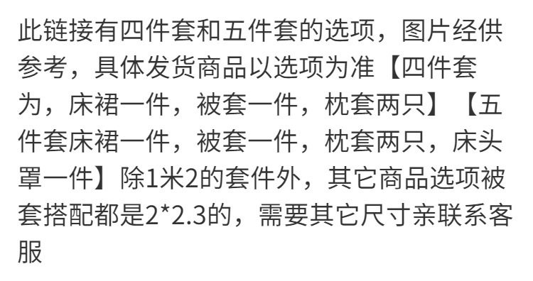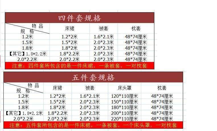 | Size specifications | 1.2* 2.0m beds [four-piece set],1.5*2.0 four-piece quilt cover 2*2.3,1.8*2.0 four-piece quilt cover 2*2.3,1.8*2.2 four-piece quilt cover 2*2.3,2*2.2 four-piece quilt cover 2*2.3,1.5* 2.0m [five-piece set] quilt cover 2*2.3,1.8* 2.0m [five-piece set] quilt cover 2*2.3,1.8* 2.2m [five-piece set] quilt cover 2*2.3,2*2.2 [five-piece set] quilt cover 2*2.3,2*2.2 four-piece quilt cover 2.2*2.4,2*2.2 [five-piece set] quilt cover 2.2*2.4 |
