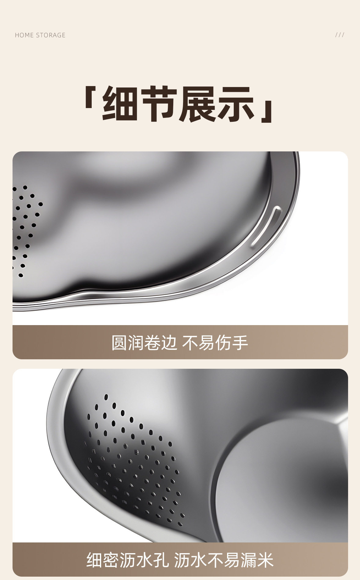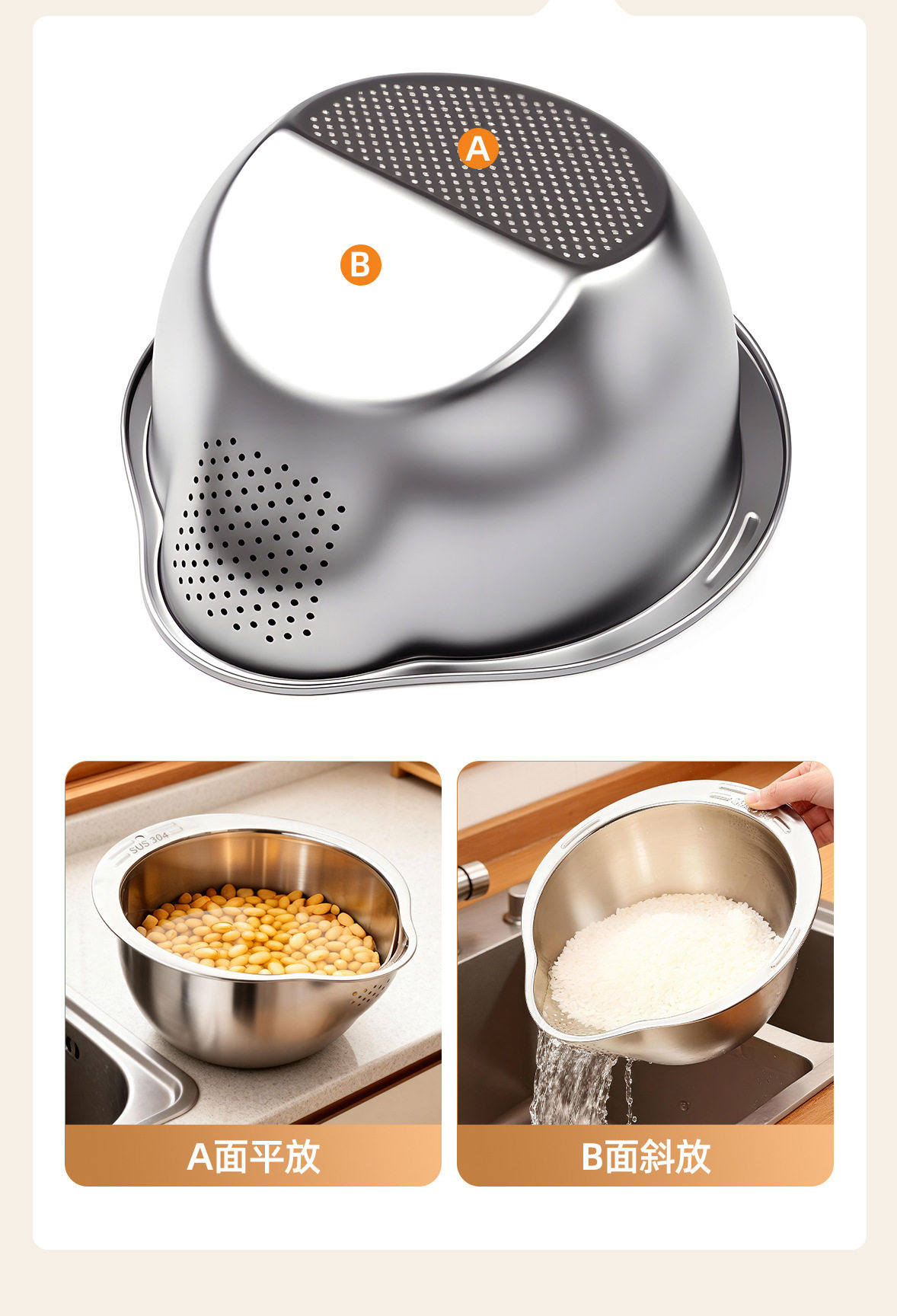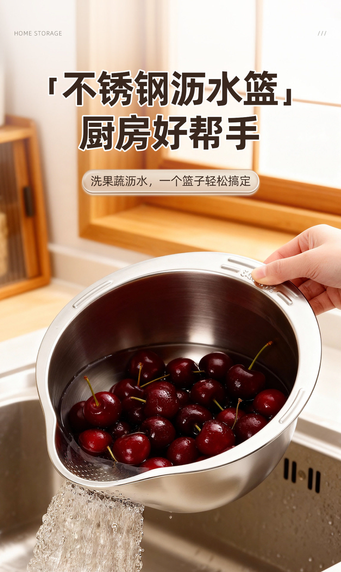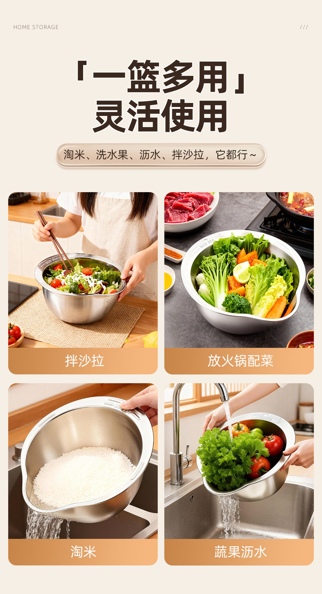 New Stainless Steel Colander for Washing Vegetables and Fruits, Rice Washing Basket, Kitchen Draining Basin