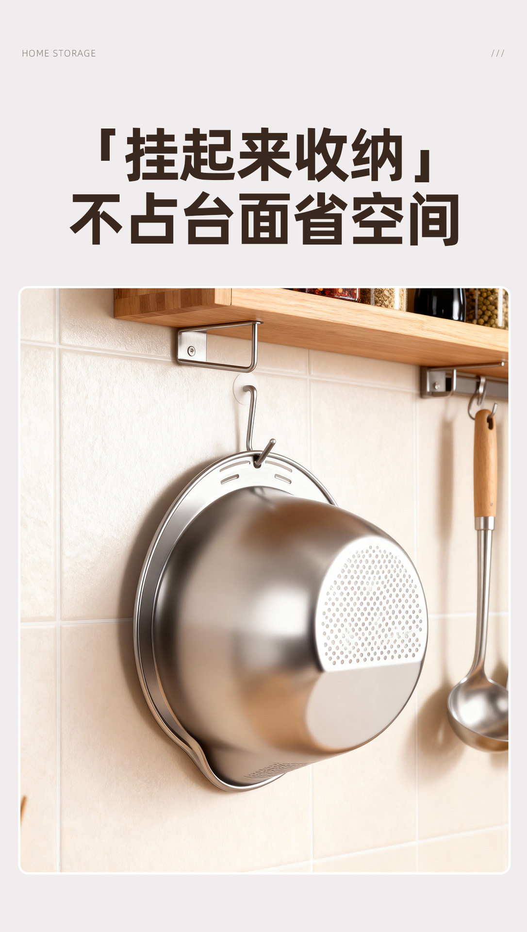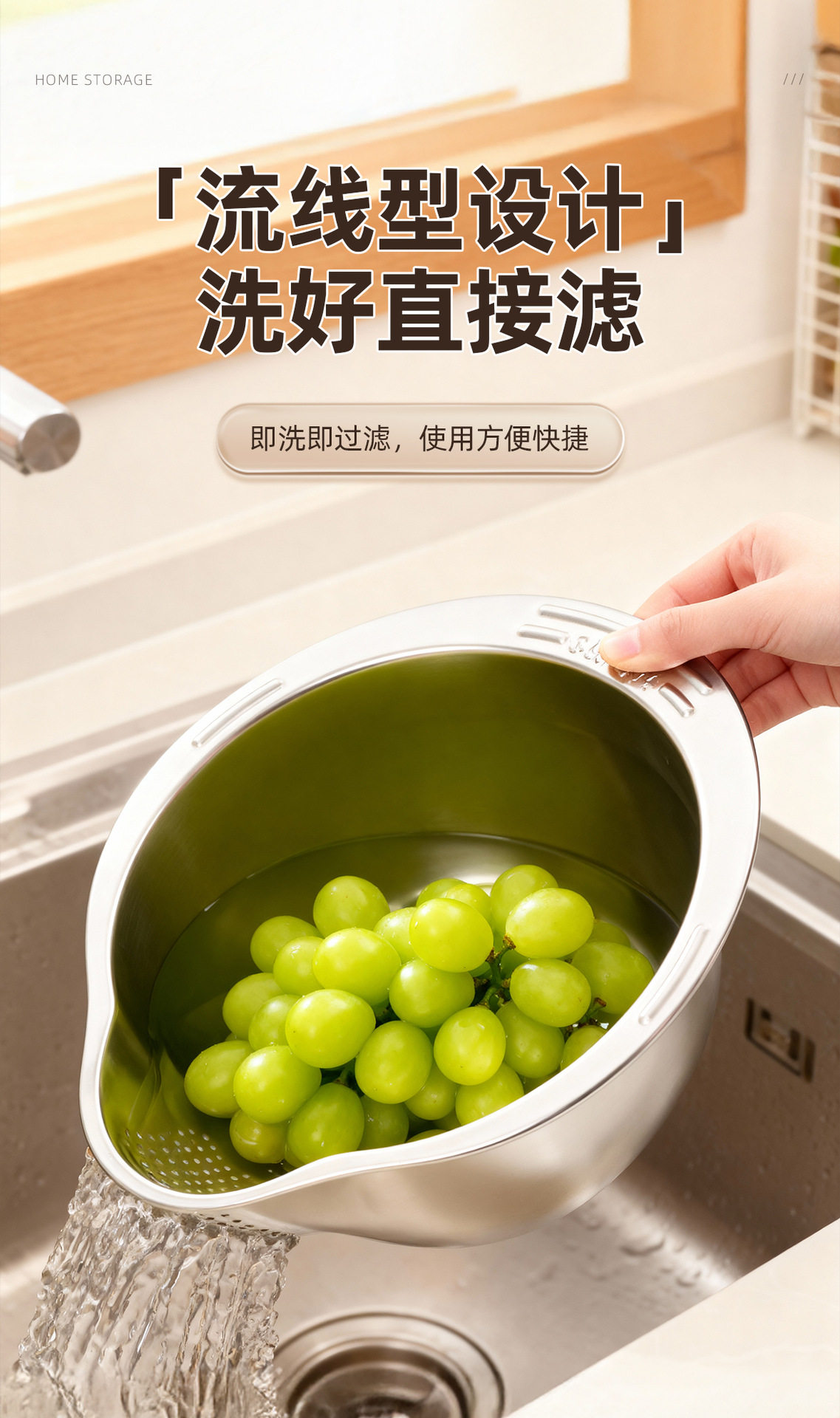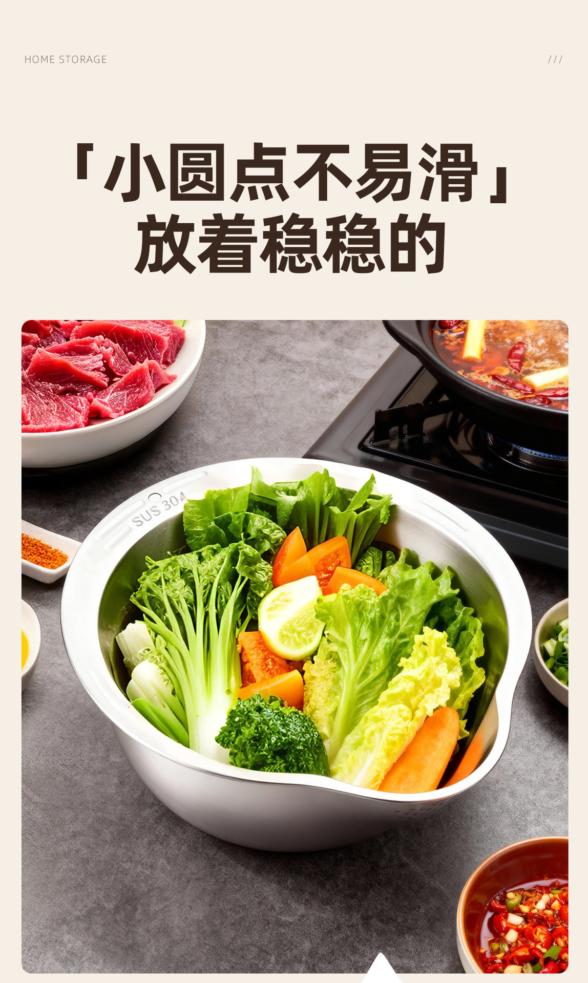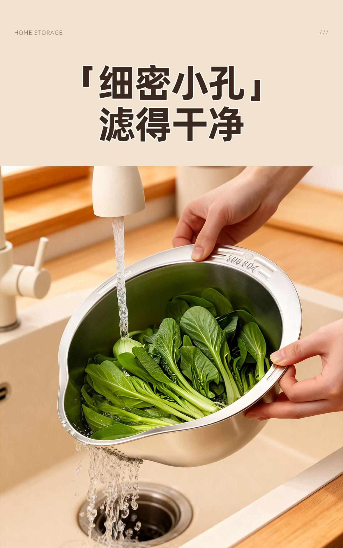 New Stainless Steel Colander for Washing Vegetables and Fruits, Rice Washing Basket, Kitchen Draining Basin