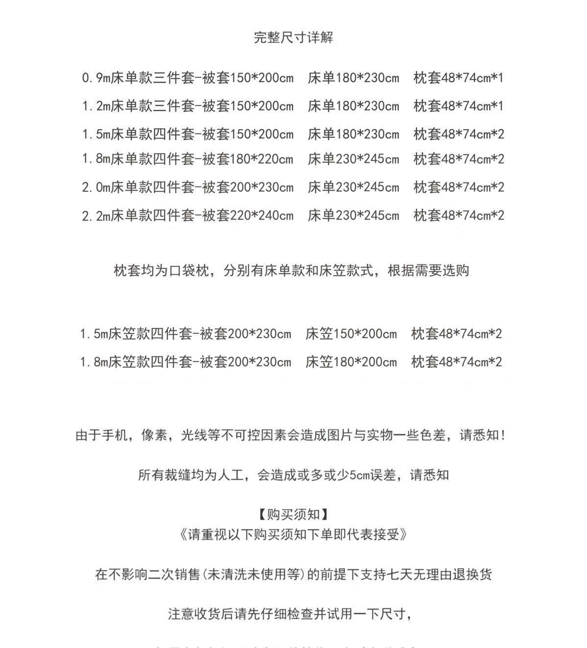 | Size specifications | Single piece quilt cover [150*200cm],Single piece quilt cover [180*220cm],Single piece quilt cover [200*230cm],Single piece quilt cover [220*240cm],0.9m dormitory bed three-piece set/quilt cover 150*200cm,1.2m bed sheet three-piece set/quilt cover 150*200cm,1.5m bed sheet four-piece set/quilt cover 150*200cm,1.8m bed sheet four-piece set/quilt cover 180*220cm,2.0m bed sheet four-piece set/quilt cover 200*230cm,2.2m bed sheet four-piece set/quilt cover 220*240cm,1.5m fitted sheet set of four/quilt cover 200*230cm,1.8m fitted sheet set of four/quilt cover 200*230cm |