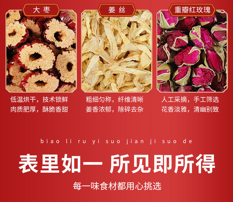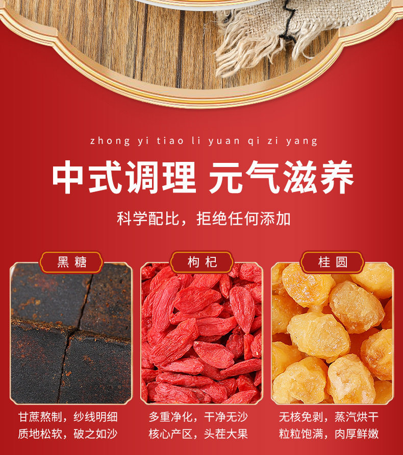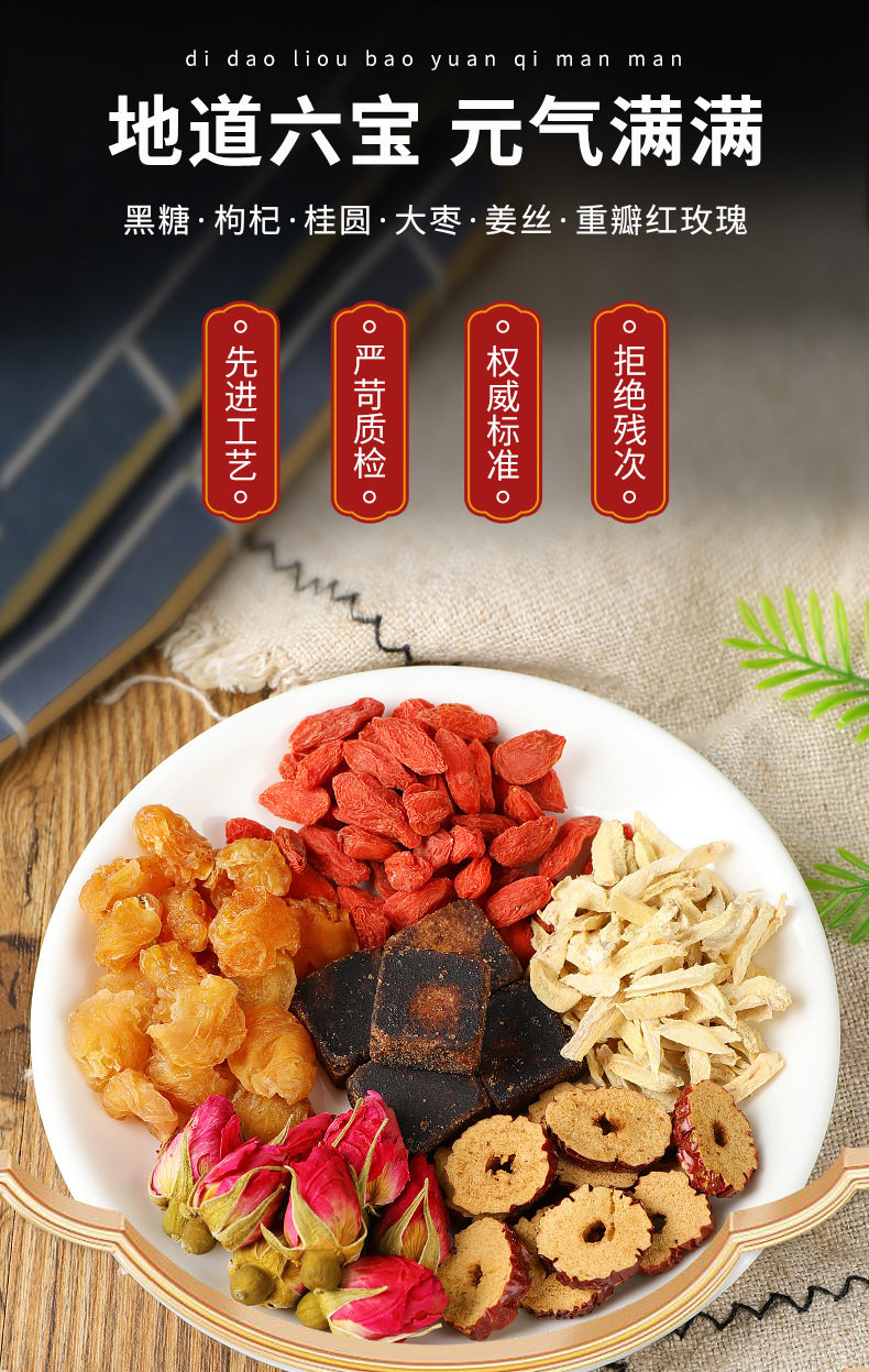 | Raw materials and ingredients | Brown sugar jujube longan rose ginger goji berry black tea |