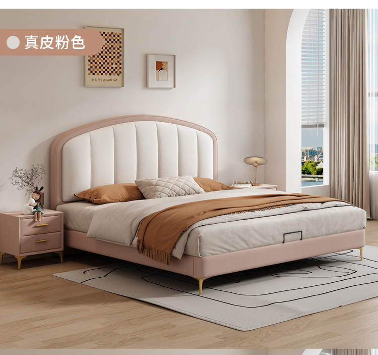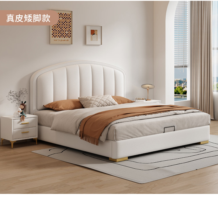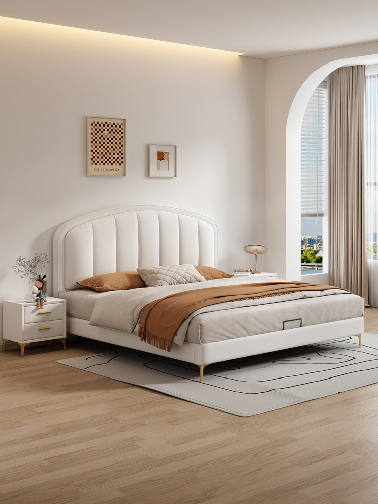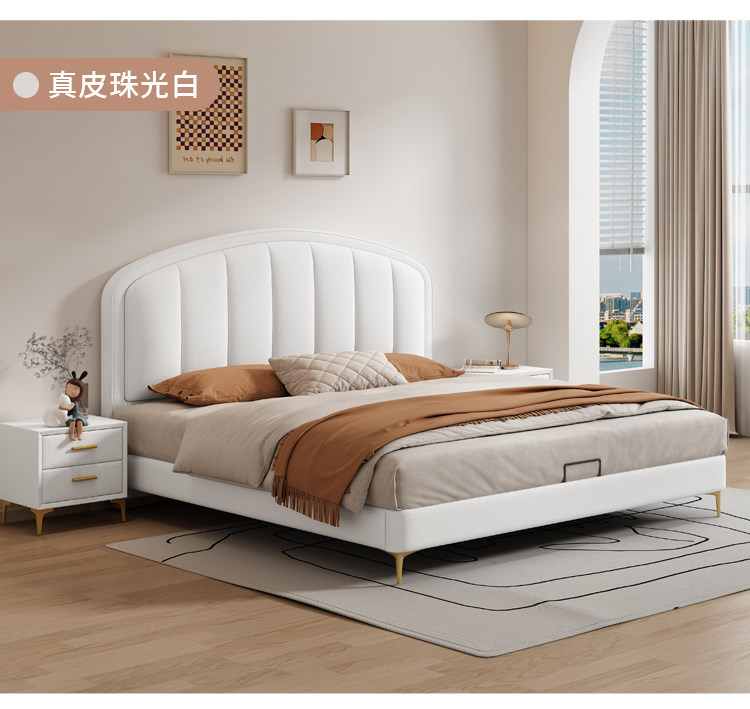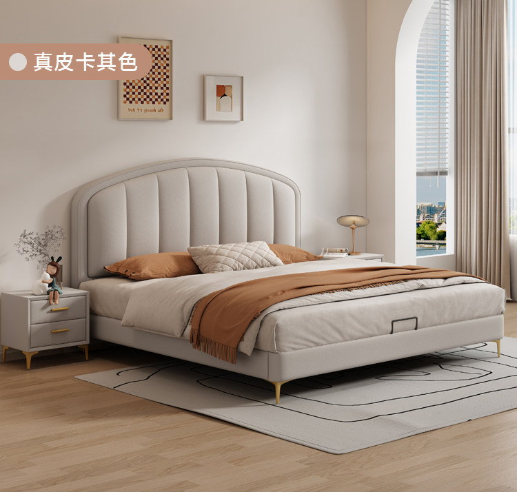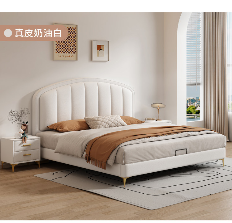 Cream-Style Genuine Leather Bed, Light Luxury Master Bedroom, 1.8m Double Storage Bed, Modern Simple Small Apartment, 1.5m Solid Wood Wedding Bed