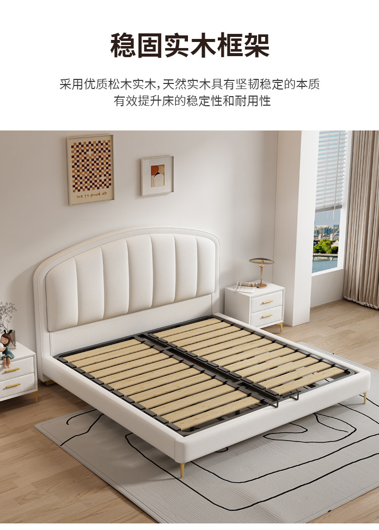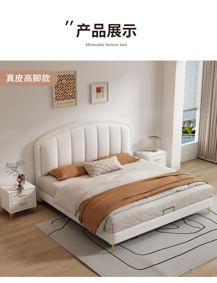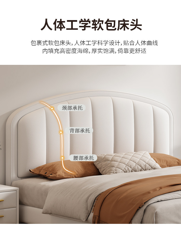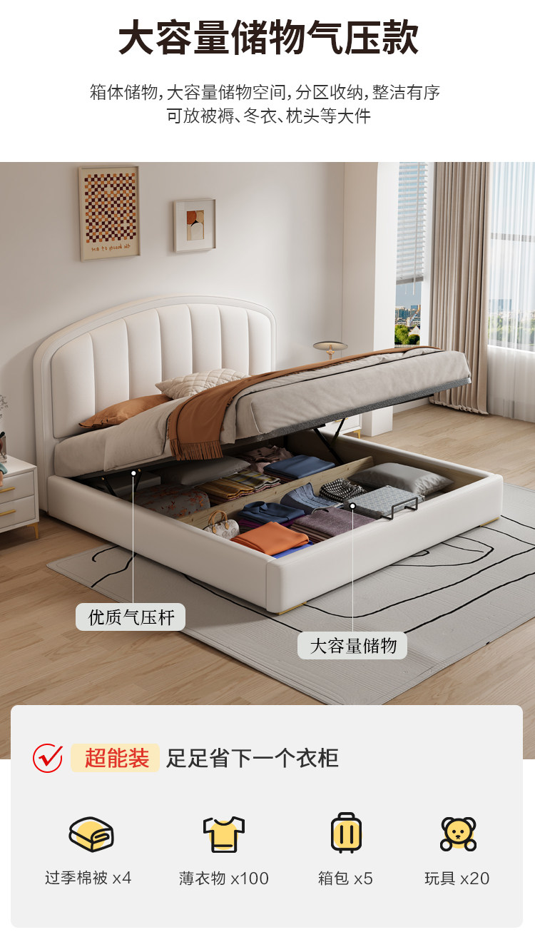 Cream-Style Genuine Leather Bed, Light Luxury Master Bedroom, 1.8m Double Storage Bed, Modern Simple Small Apartment, 1.5m Solid Wood Wedding Bed