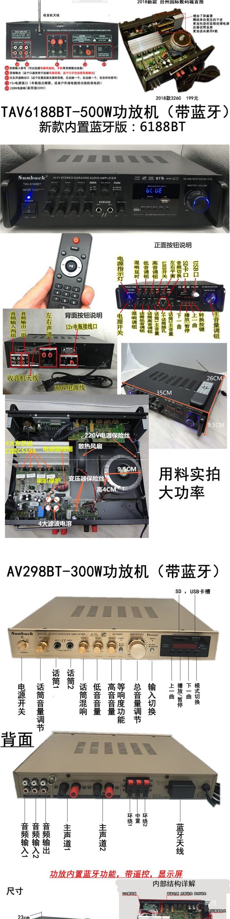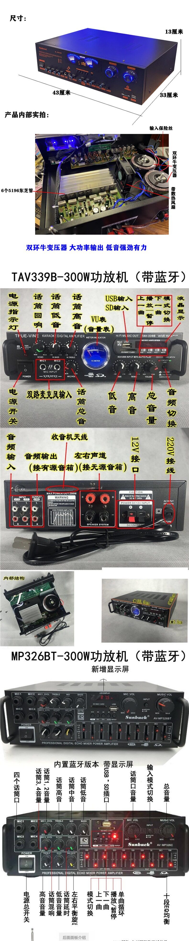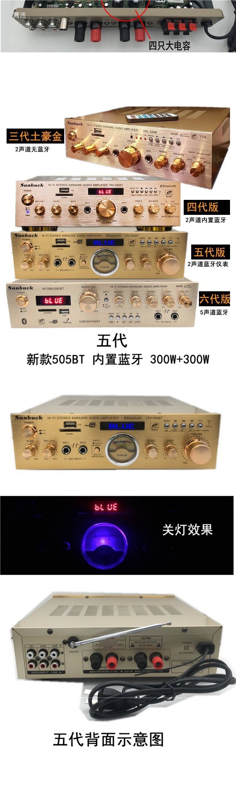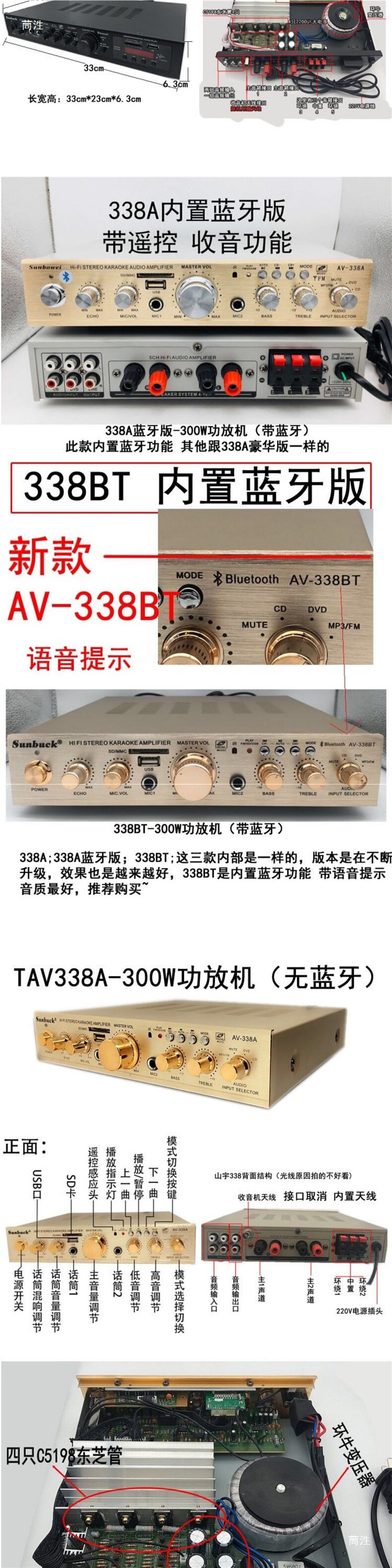 | Color | 338bt upgraded version-500w gold,338bt upgraded version-500w black,988bt-8 tube 5.1 independent subwoofer interface,9898-5.1 independent bass,555bt-5.1 exclusive edition spectrum screen,339bt-300w power amplifier (with bluetooth),326bt-300w power amplifier (with bluetooth),6188bt-500w power amplifier (with bluetooth),6188e-five-channel 600w new model,338bt-300w power amplifier (with bluetooth),338 simplified version-300w power amplifier (without bluetooth),Fourth generation 500bt-300w power amplifier with bluetooth,Jinliudai 580-400w power amplifier (with bluetooth),Jinqidai 298-600w power amplifier (with bluetooth),Black seventh generation 298-600w power amplifier (with bluetooth),326bt machine-600w with bluetooth,326z exclusive edition-800w dynamic display,Ninth generation 628bt-900w with bluetooth,Tenth generation 6060-1000w,Gold 11th generation 6199e-1000w dynamic screen,Black 11th generation 6199e-1000w dynamic screen,Ka8900-1000w14-band eq tuning,999 version of fever cow |
